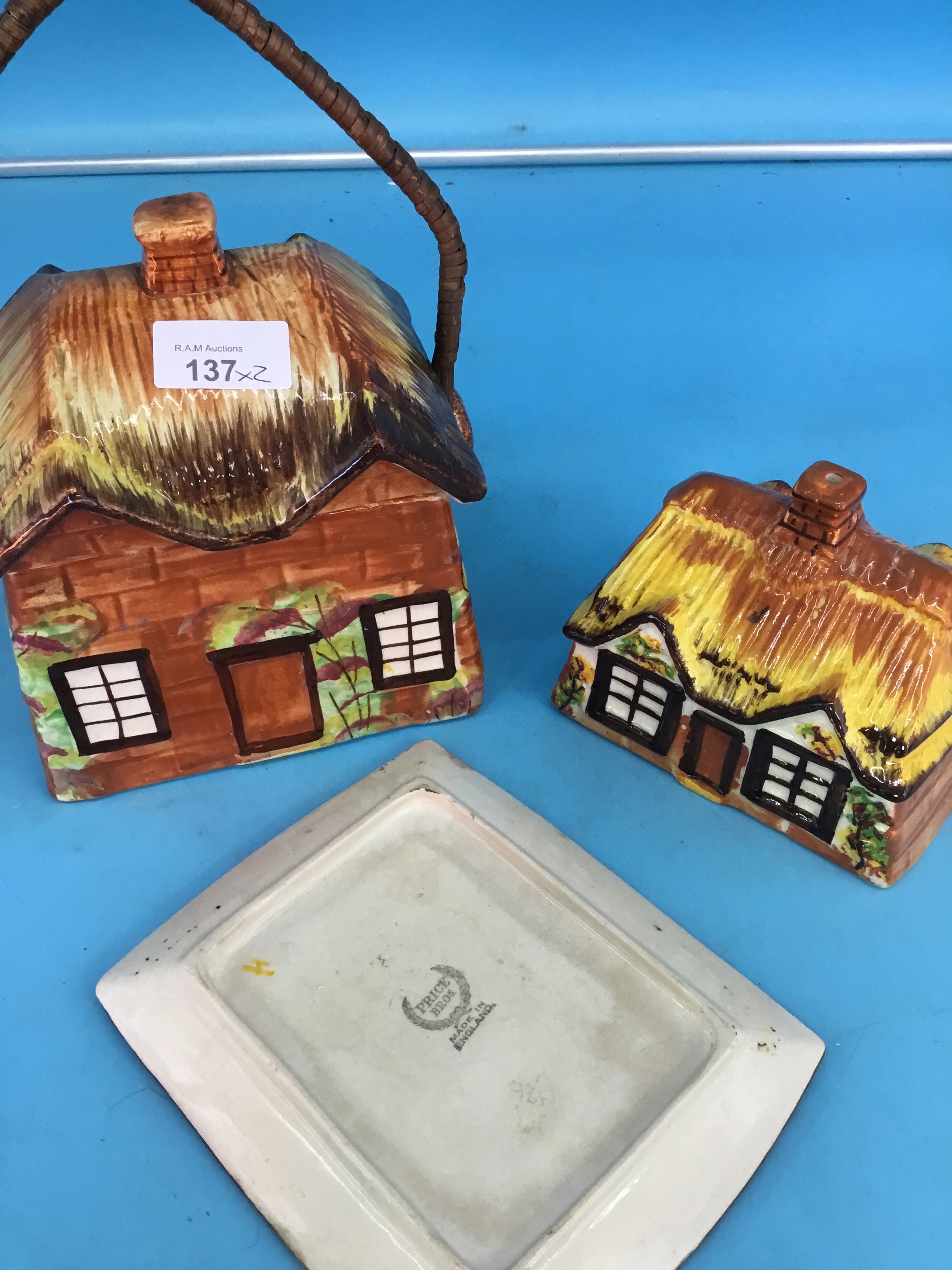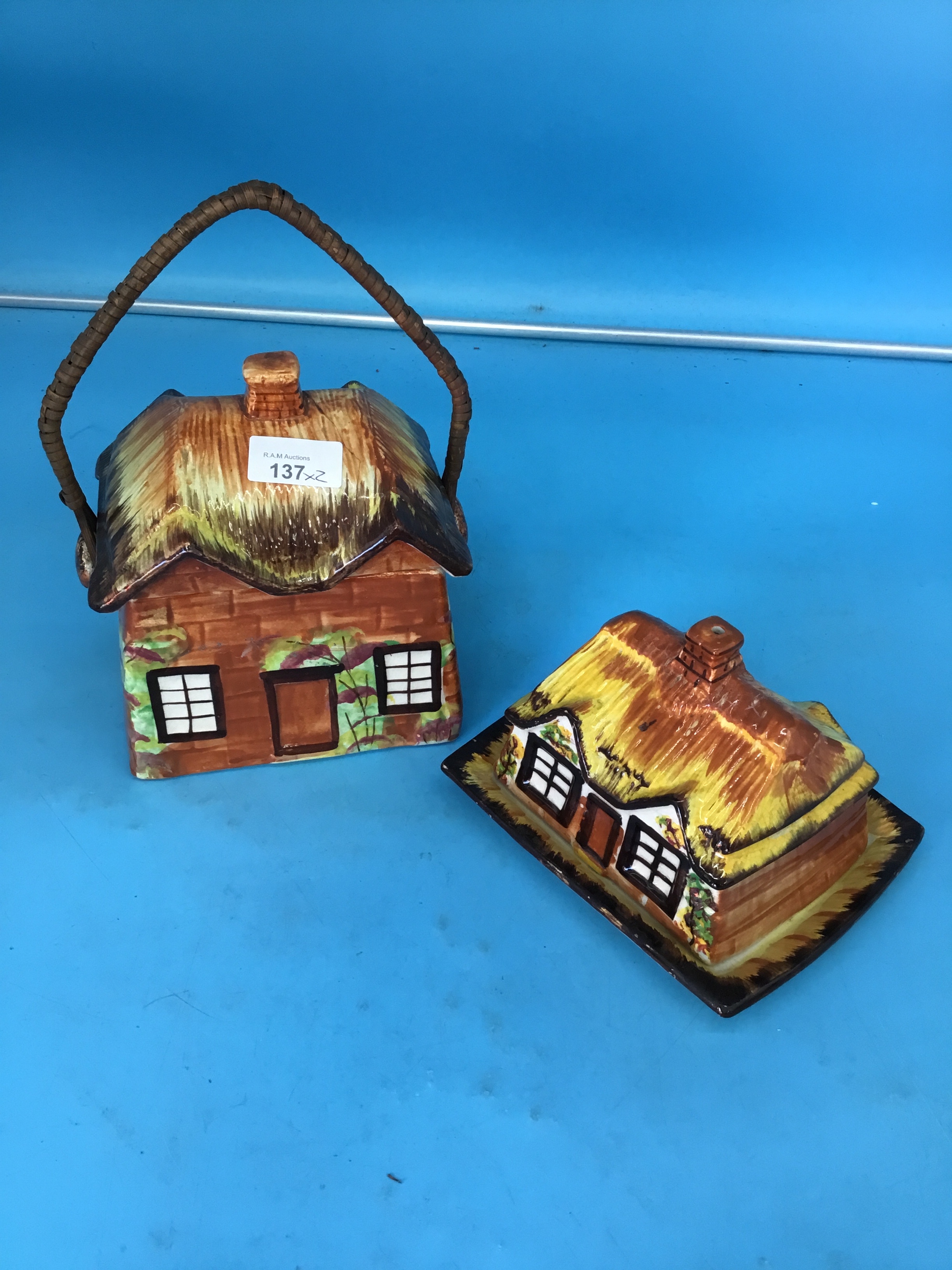 Hand-painted ceramic cottage-shaped butter dish and cover with thatched roof and brick details.