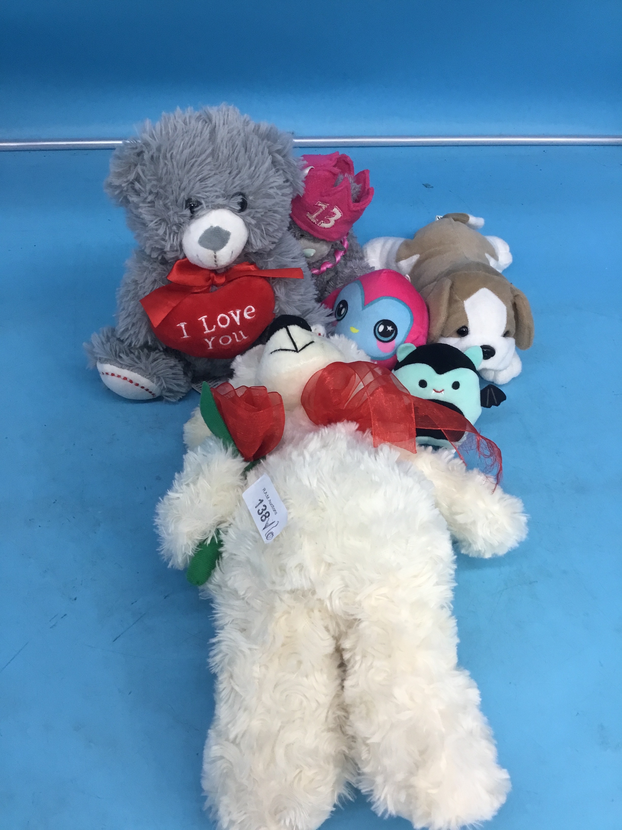 Gray teddy bear with “I Love You” pillow, off-white plush with rose, tan dog, pink creature, and teal winged creature.
