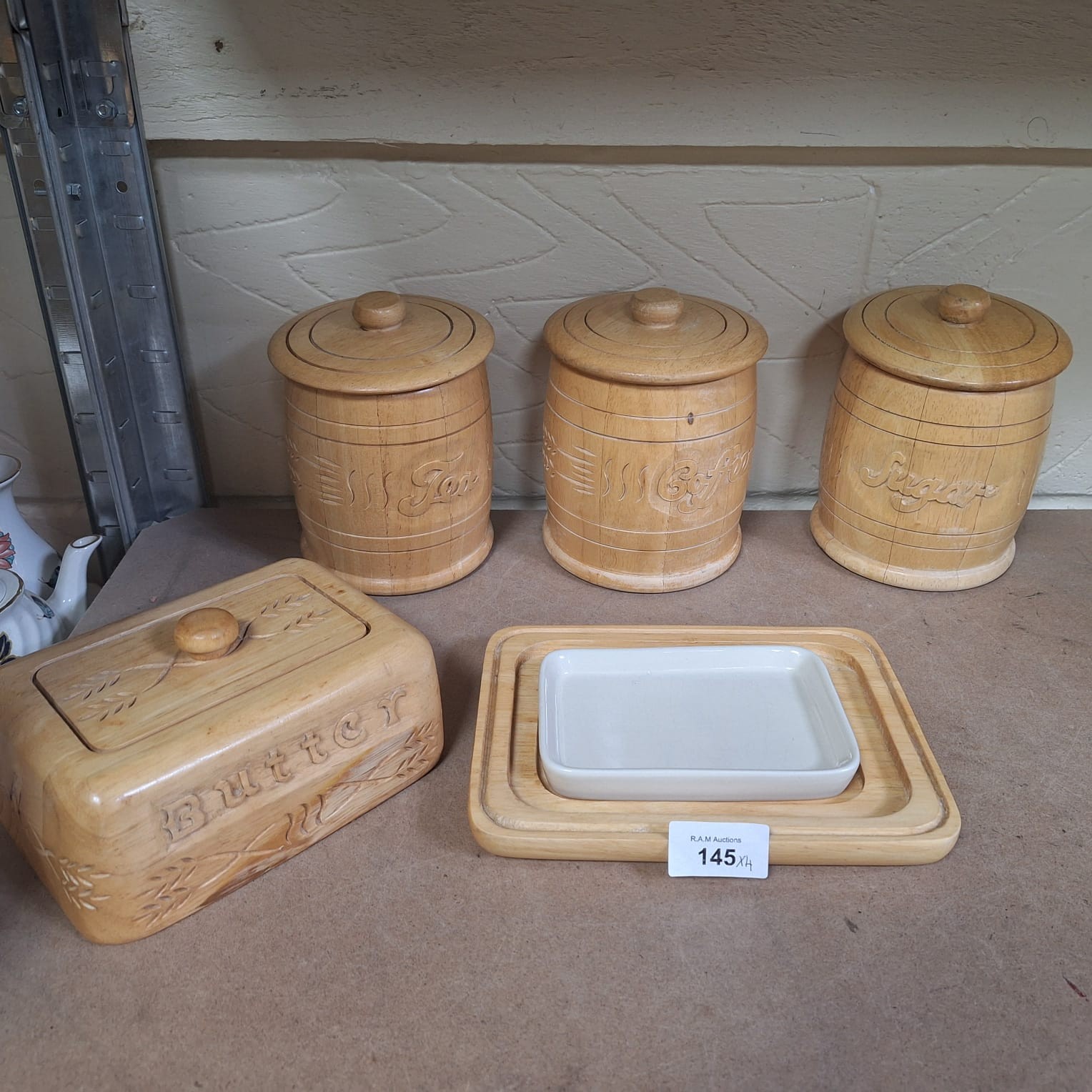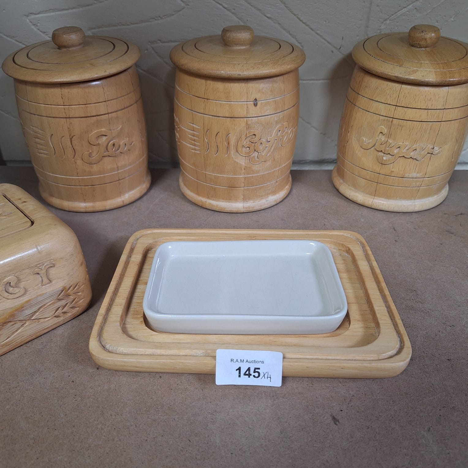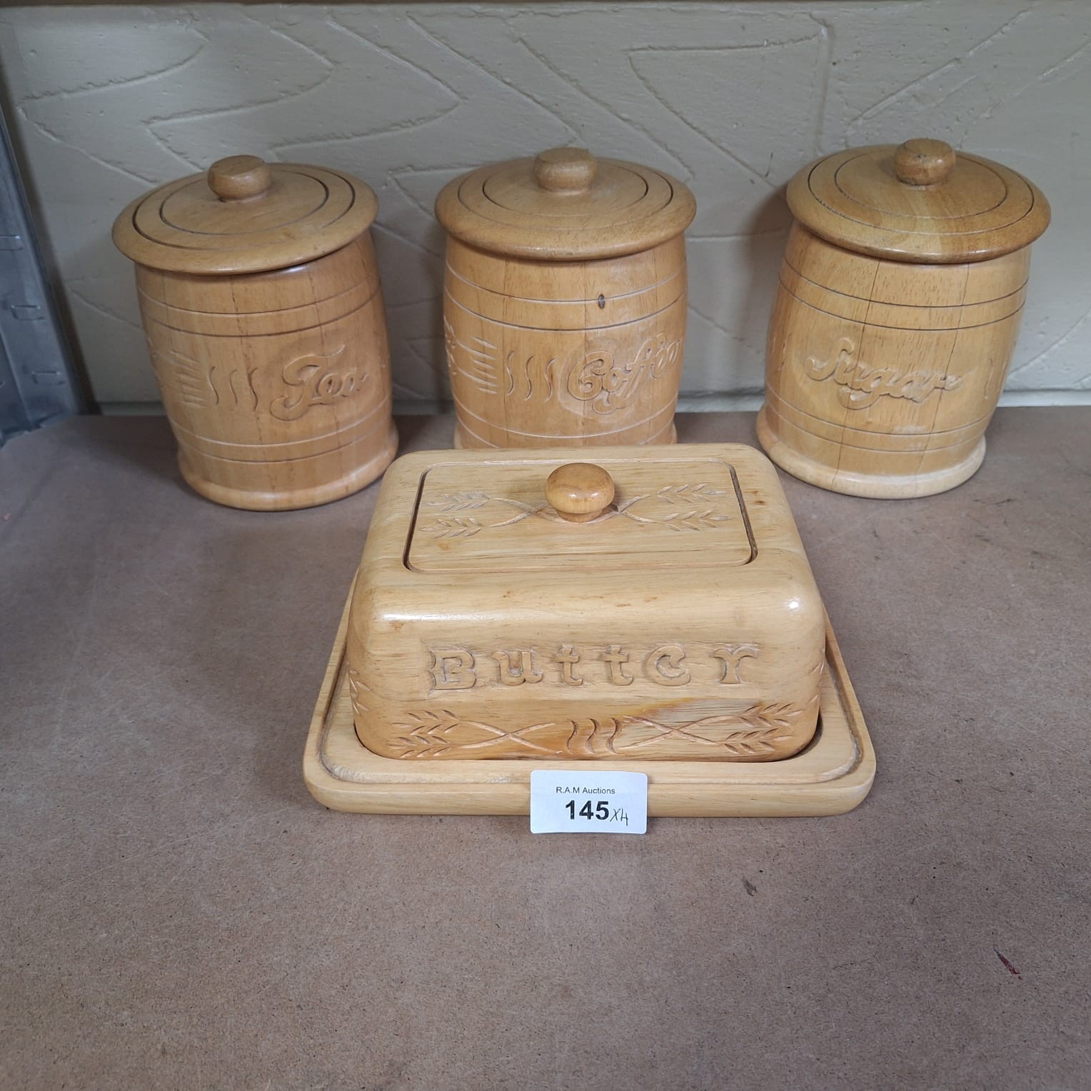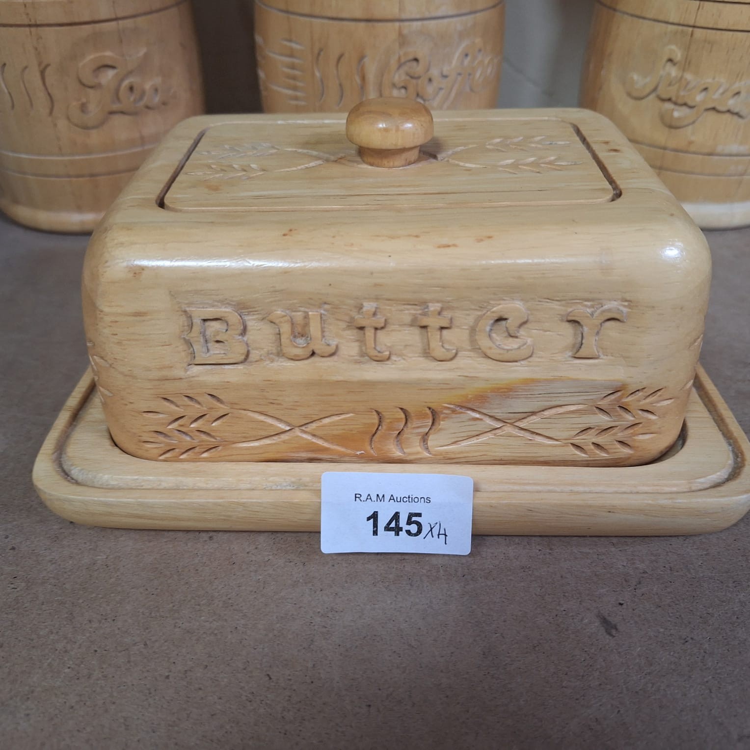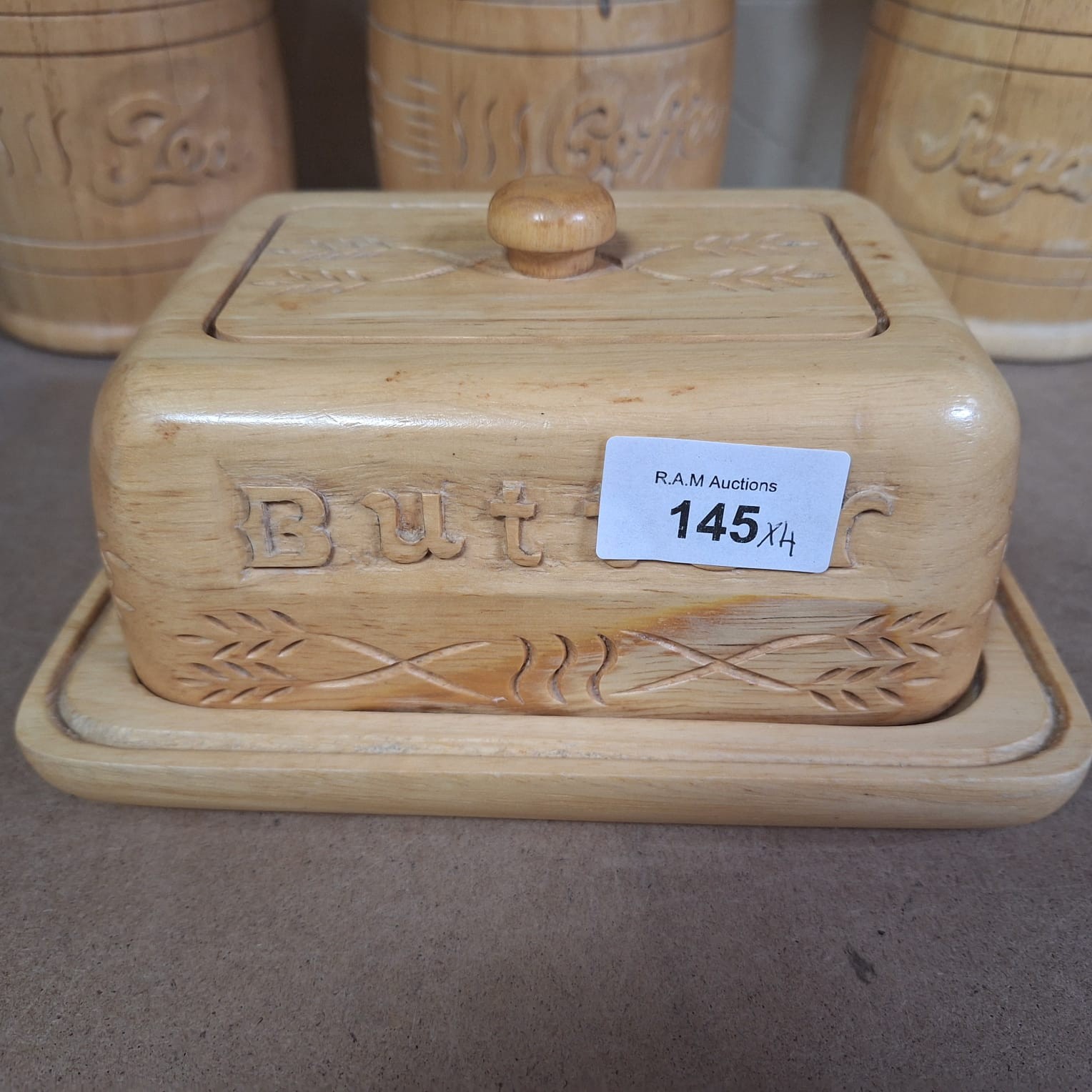 Light-colored wooden kitchen containers with carved wheat designs, including canisters for “Tea,” “Coffee,” and “Sugar,” and a butter dish with a ceramic insert.