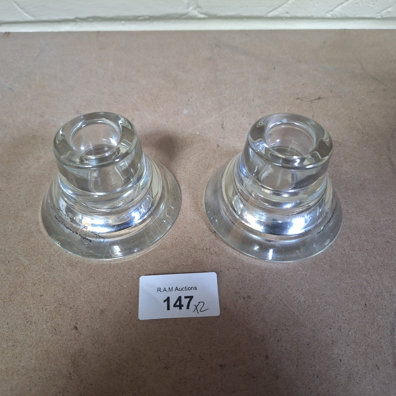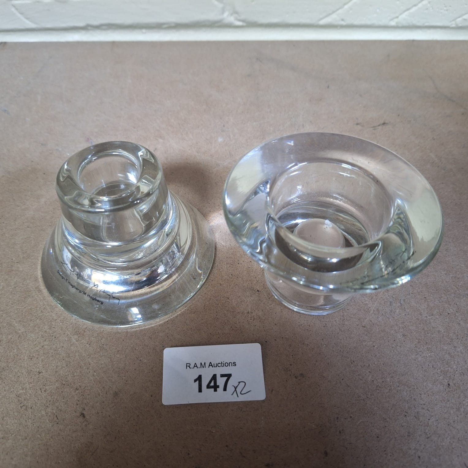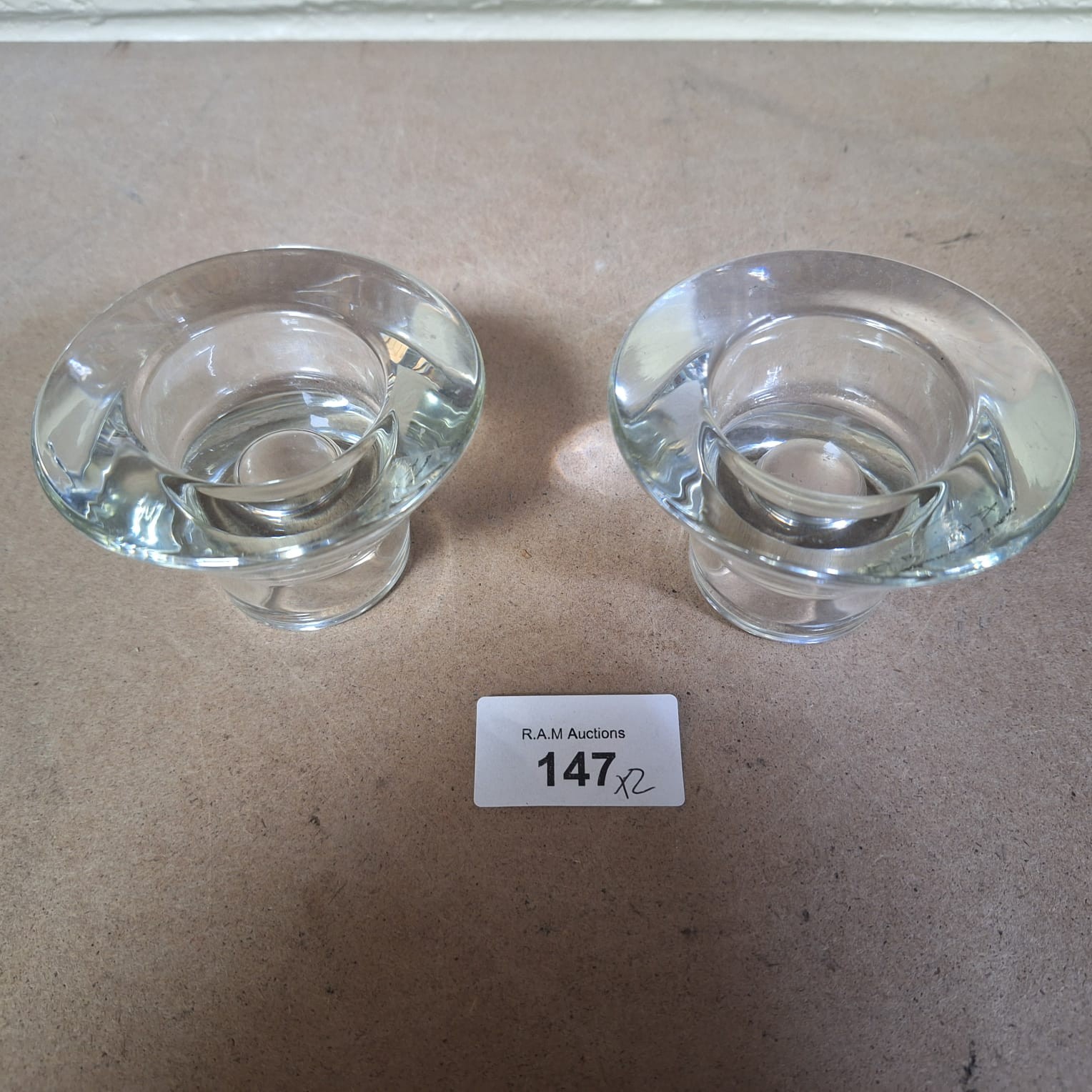 Cylindrical clear glass candle holders with flared tops and molded bases.