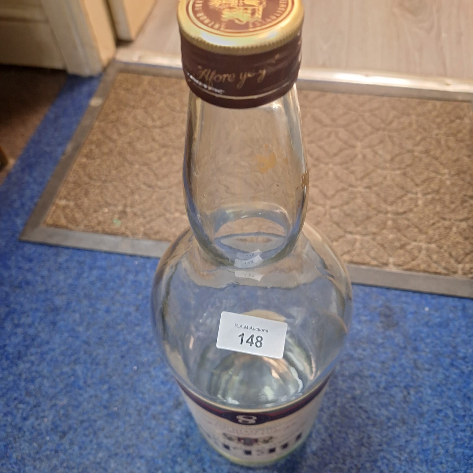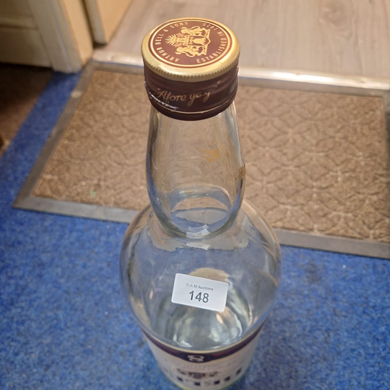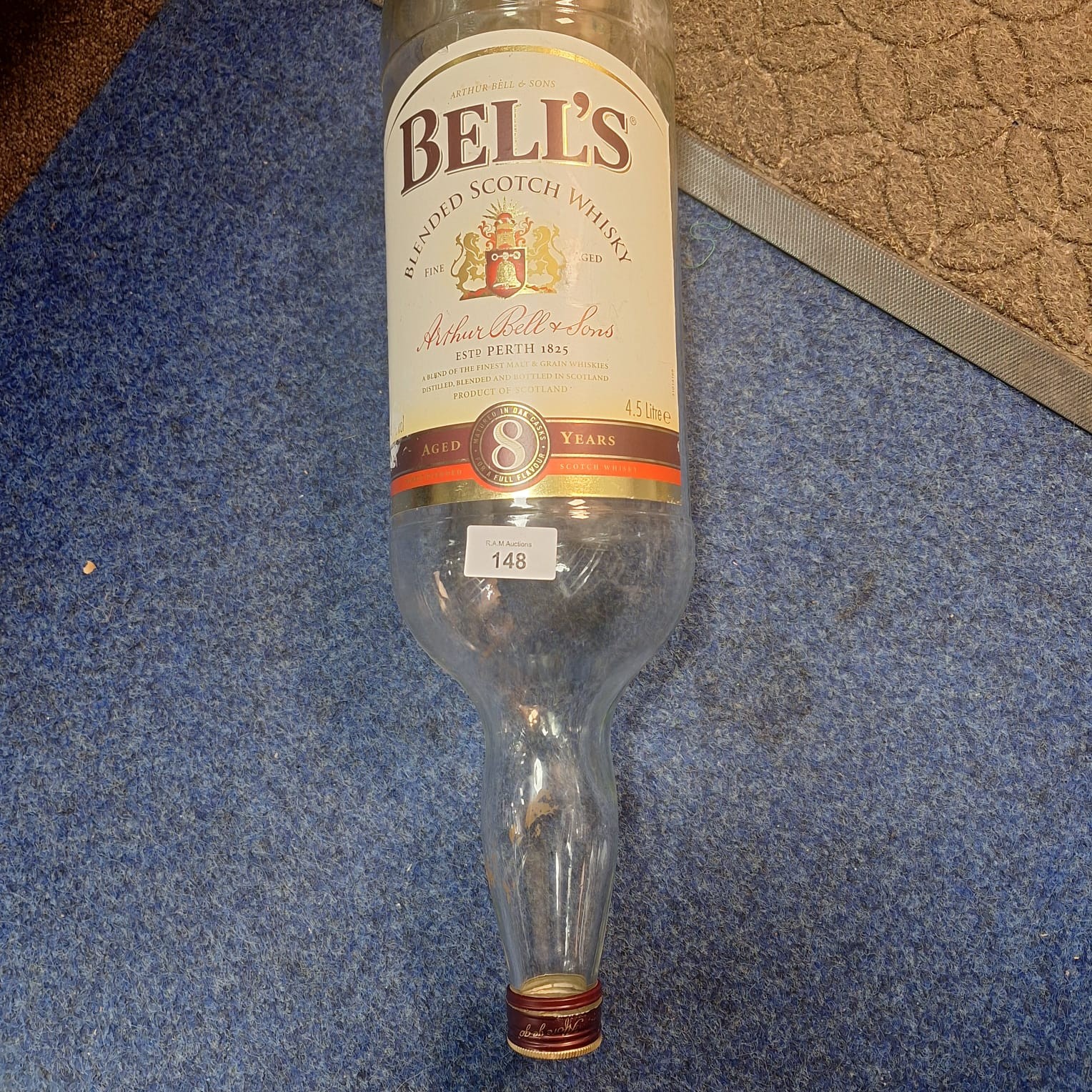 An empty 4.5 litre clear glass bottle of Bell’s Blended Scotch Whisky, aged 8 years.