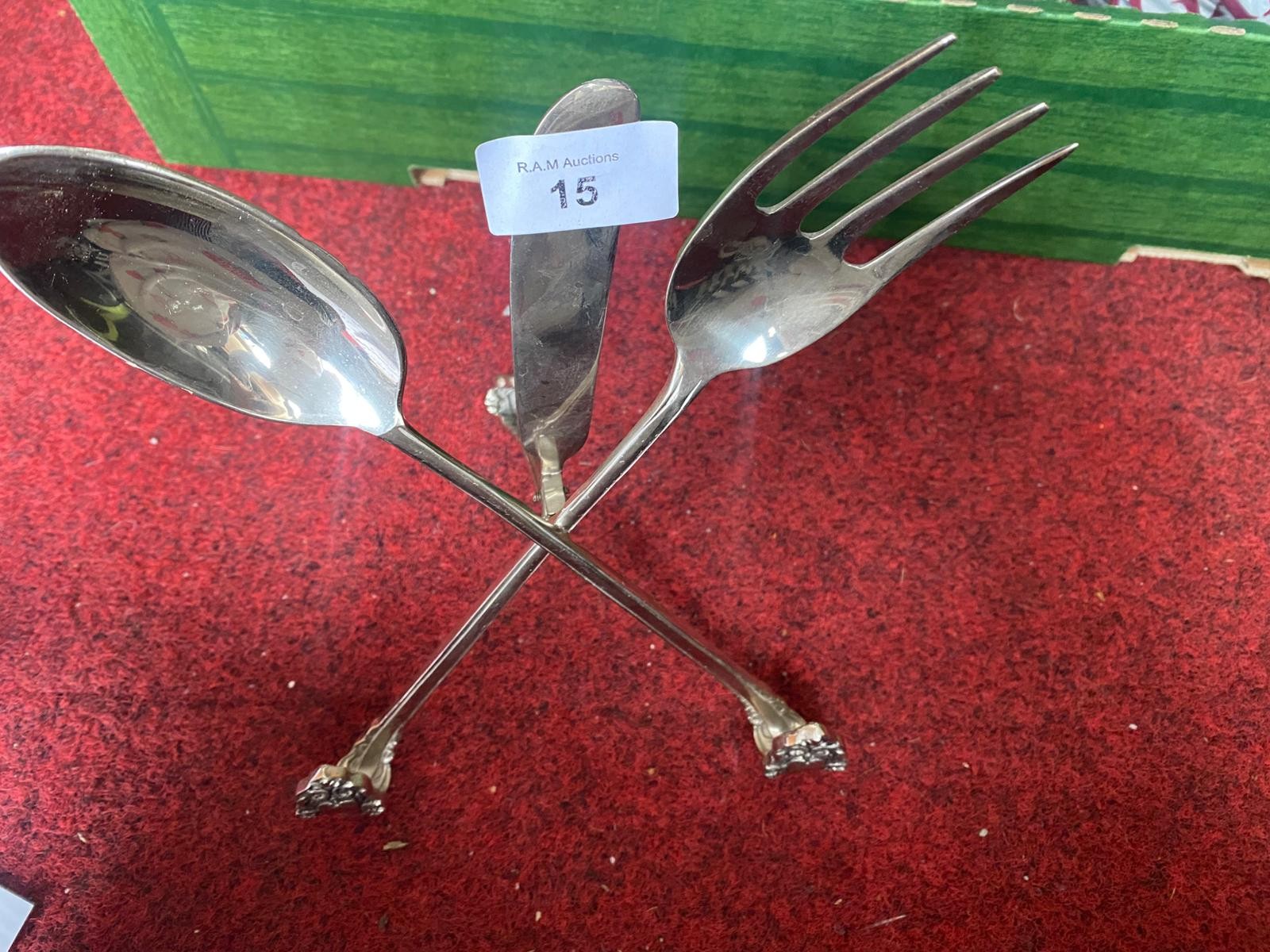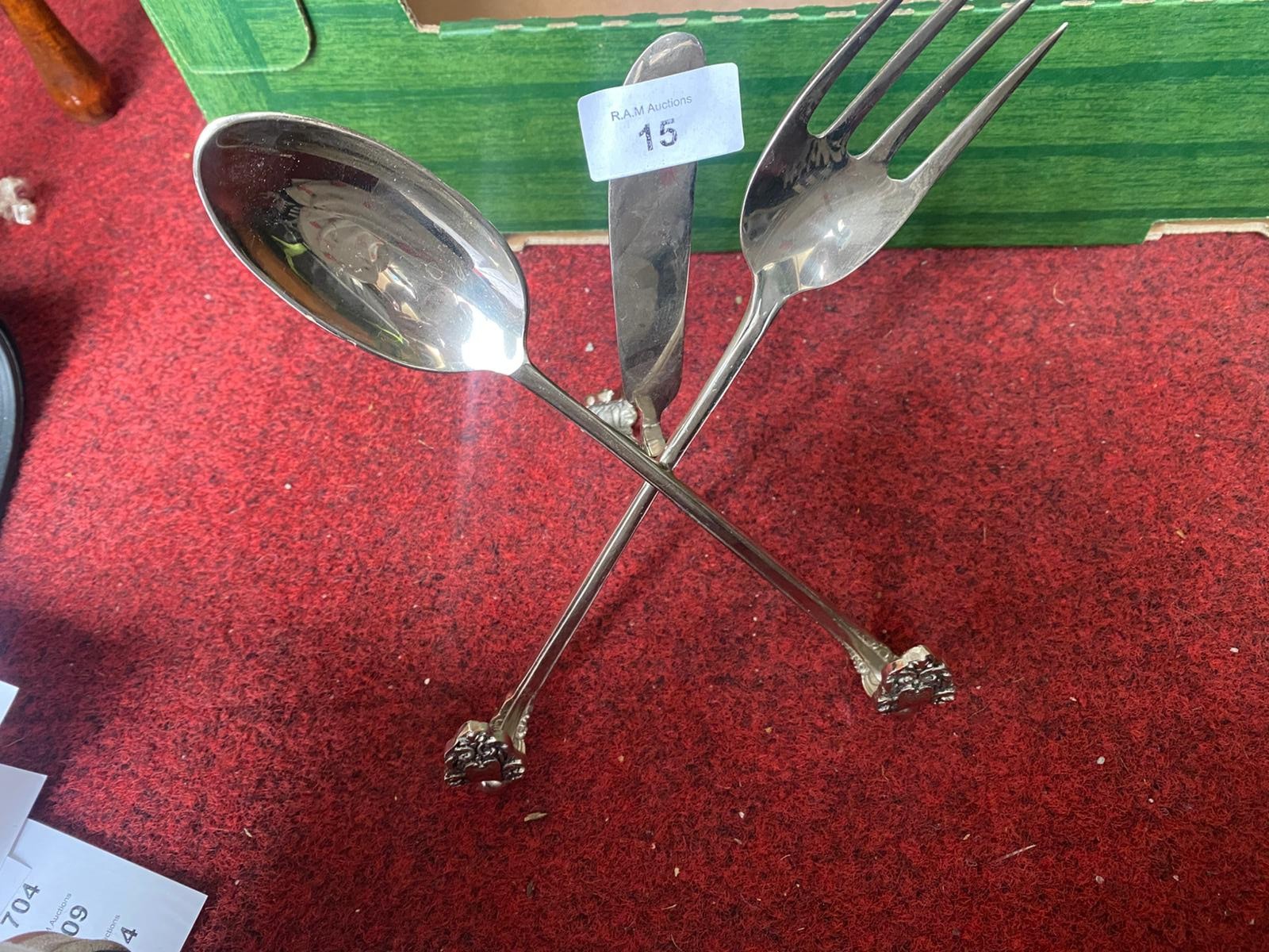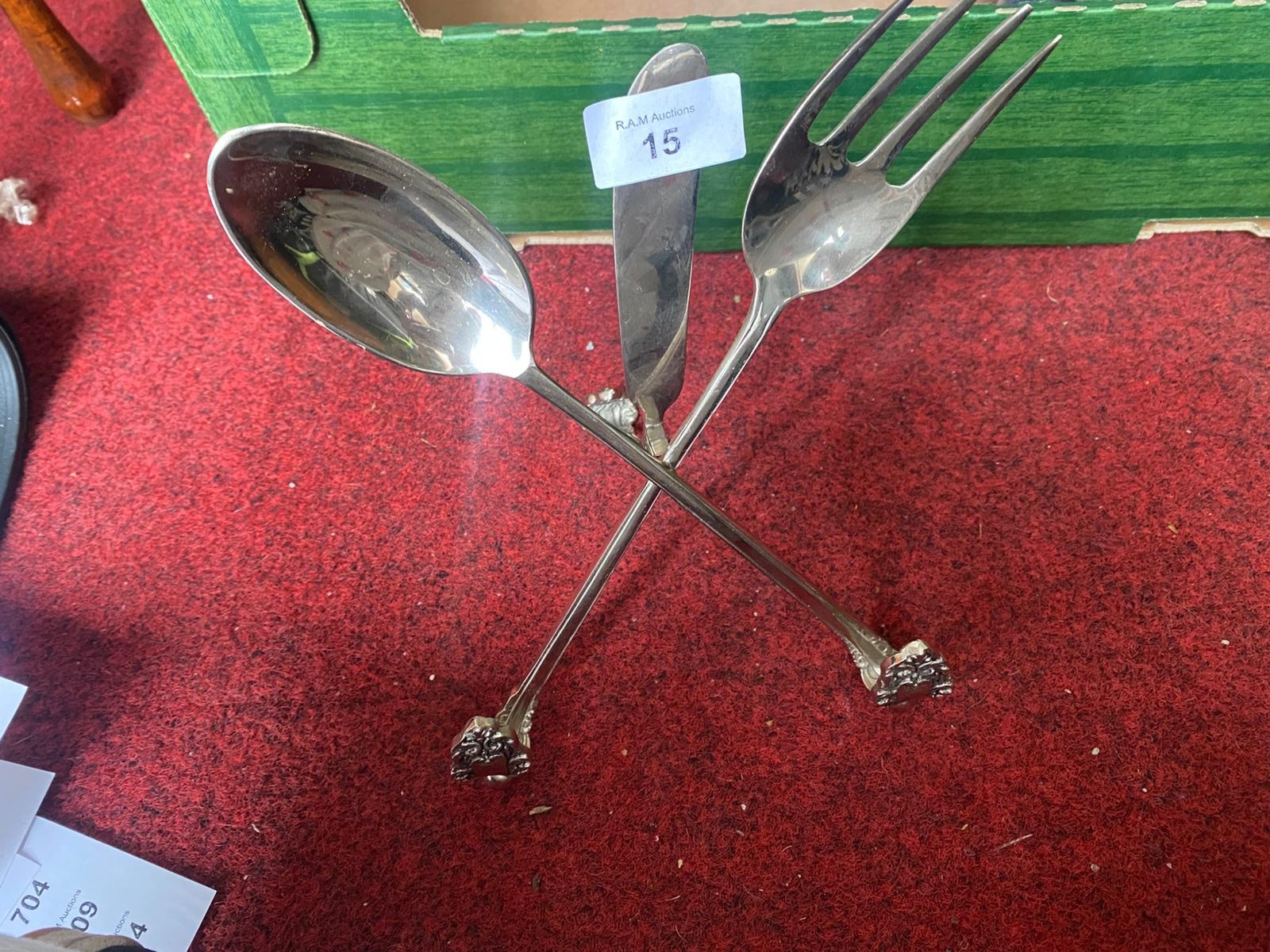 A set of silver-toned metal utensils with floral motifs on the handles, arranged in an X-shape.