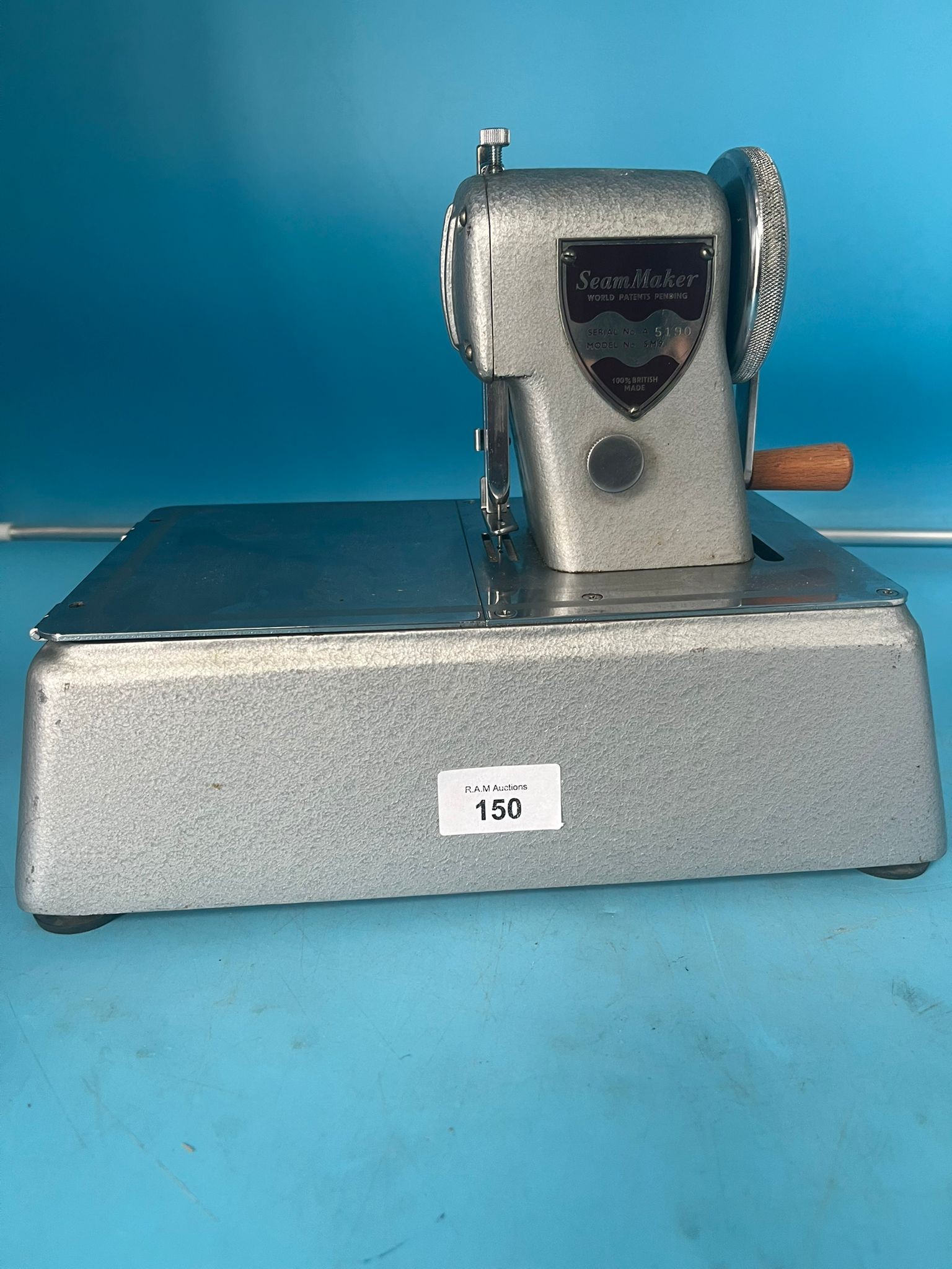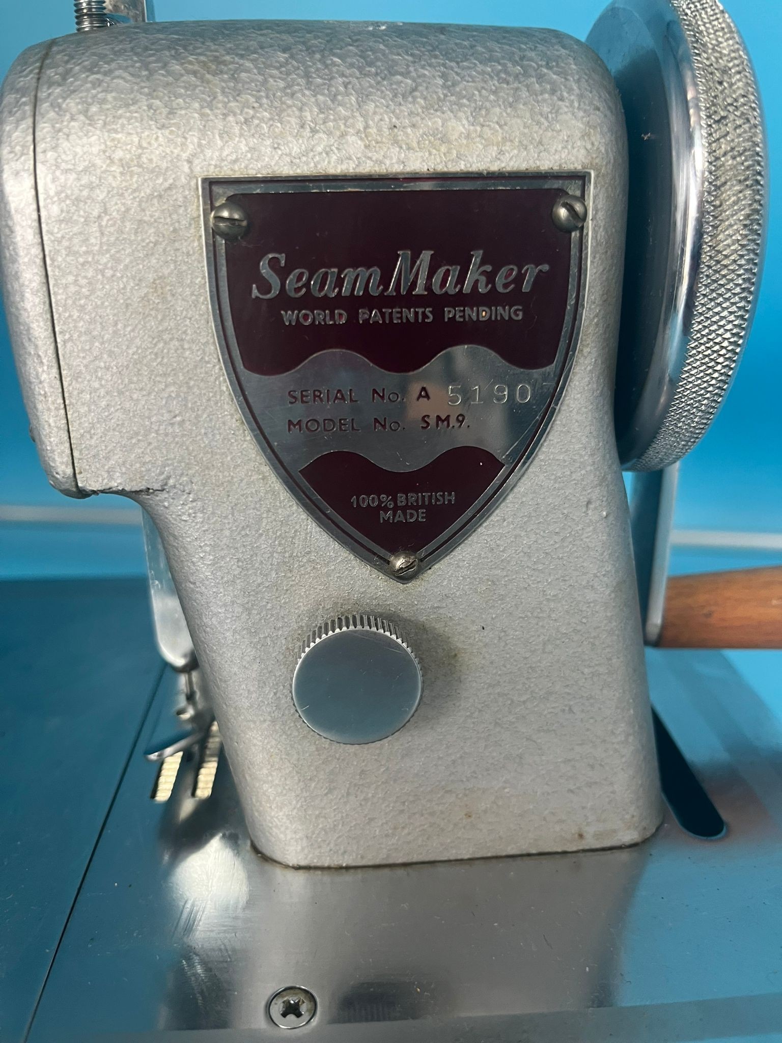 A light grey metallic Seam Maker SM9 sewing machine with a wooden hand crank.