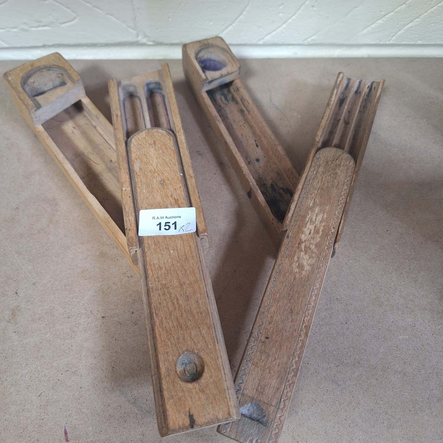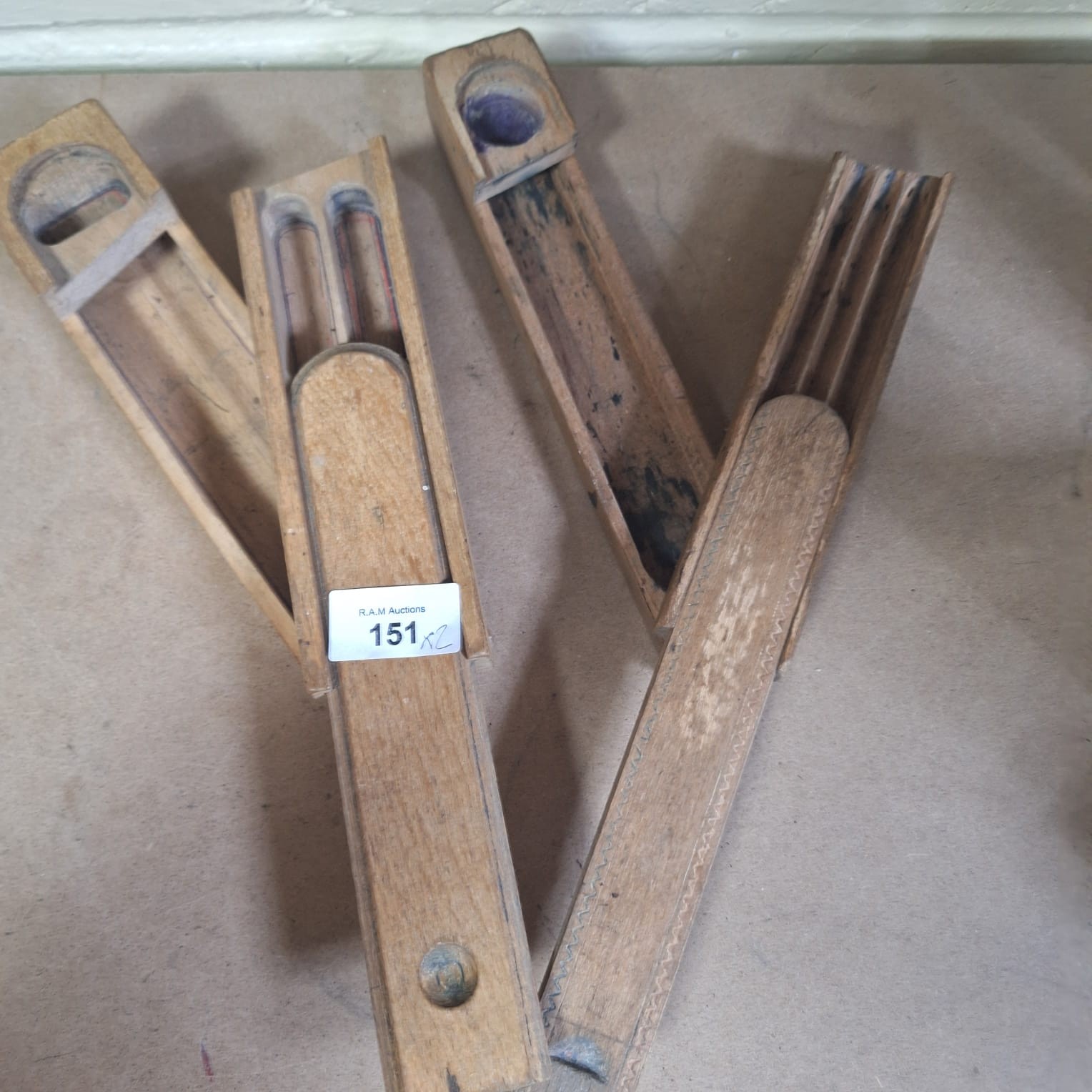 Rectangular wooden boxes with hinged lids and interior channels, one with a circular hole, and a fluted box with a separate lid.