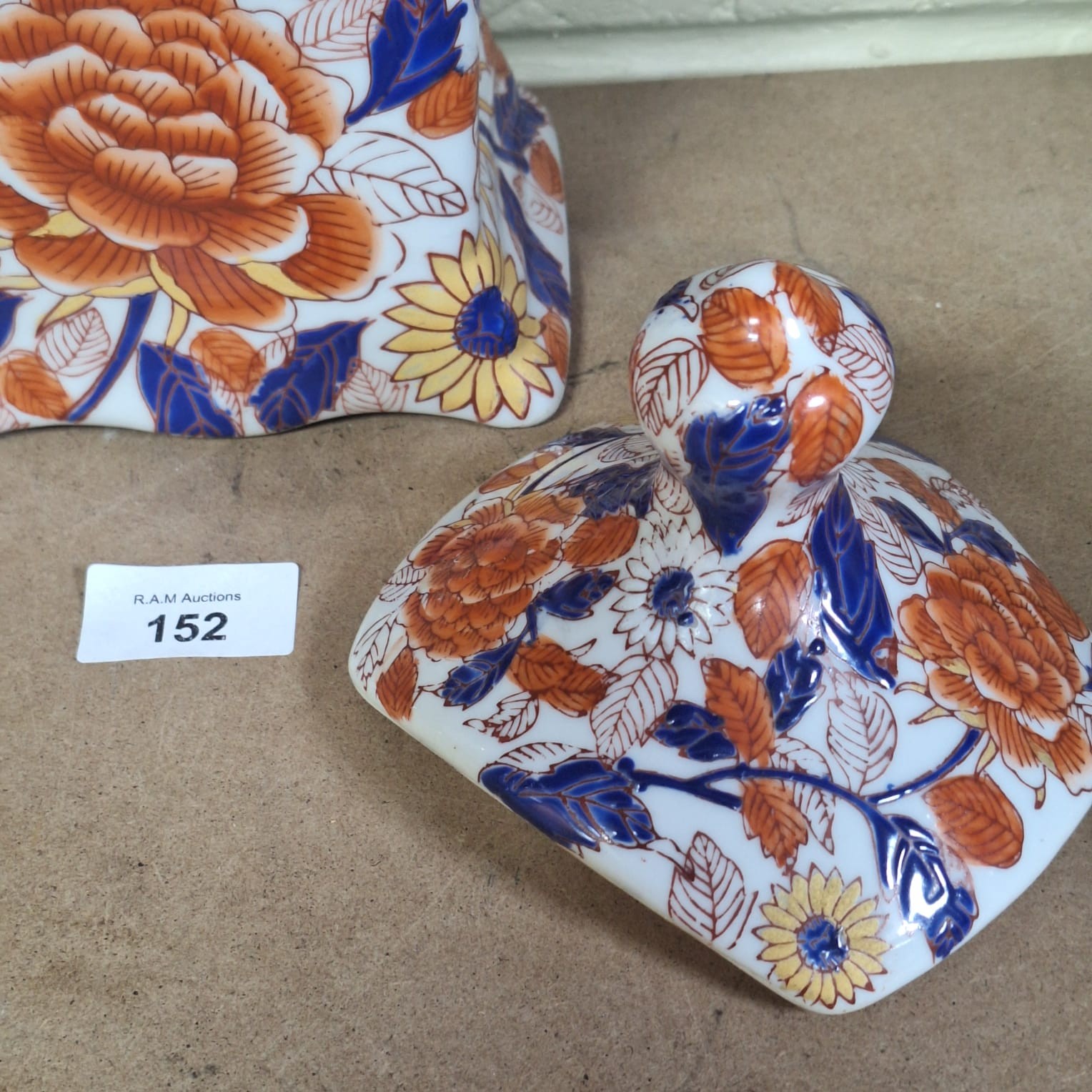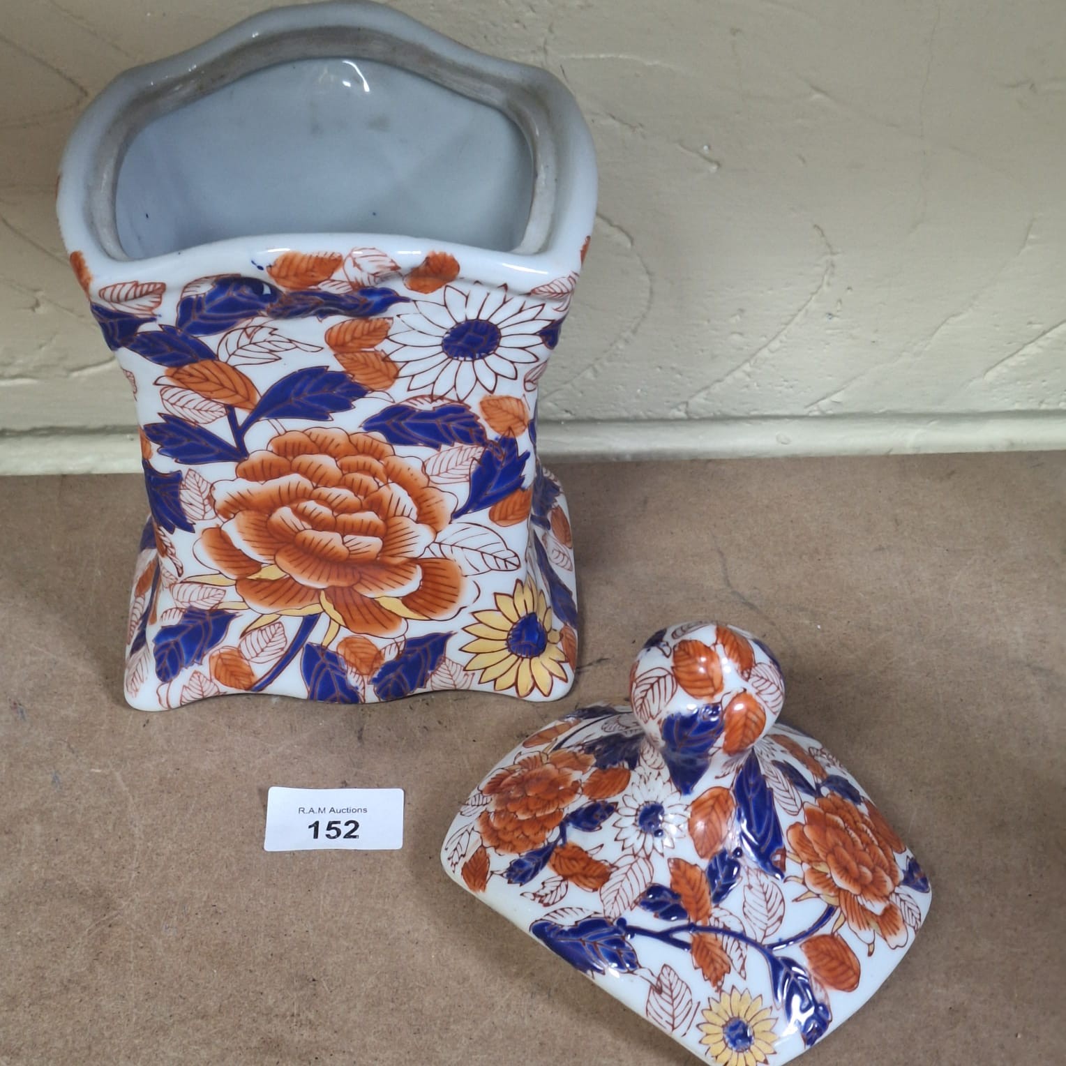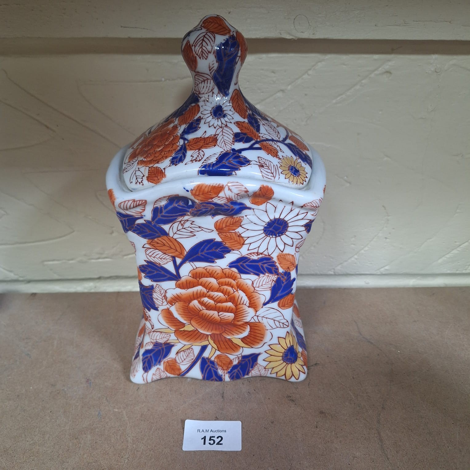 Square porcelain jar with curved sides and domed lid decorated with orange peonies, yellow and white flowers, blue leaves, and gold accents.