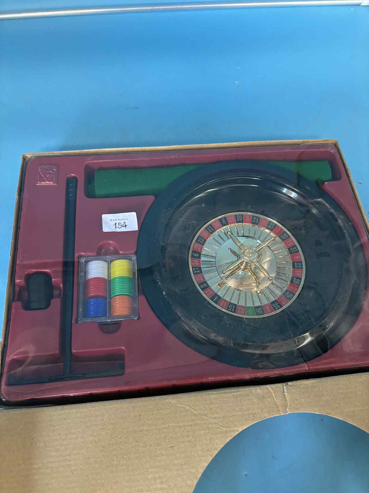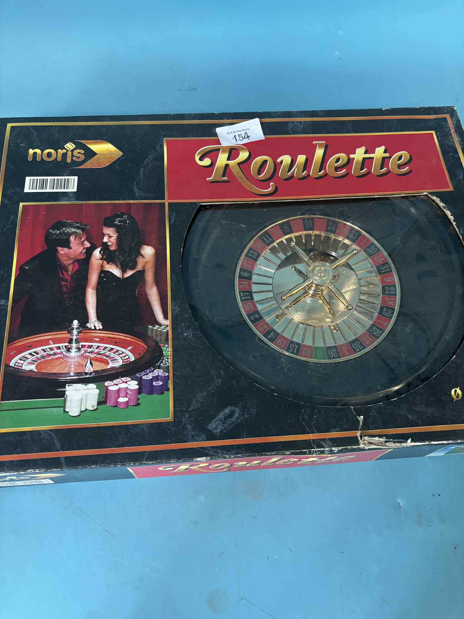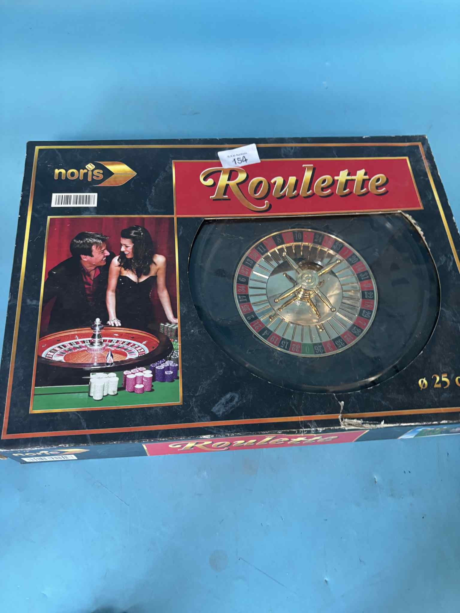 A Noris brand Roulette game set featuring a roulette wheel, spinner, stick, and colored chips, all housed in its original box.