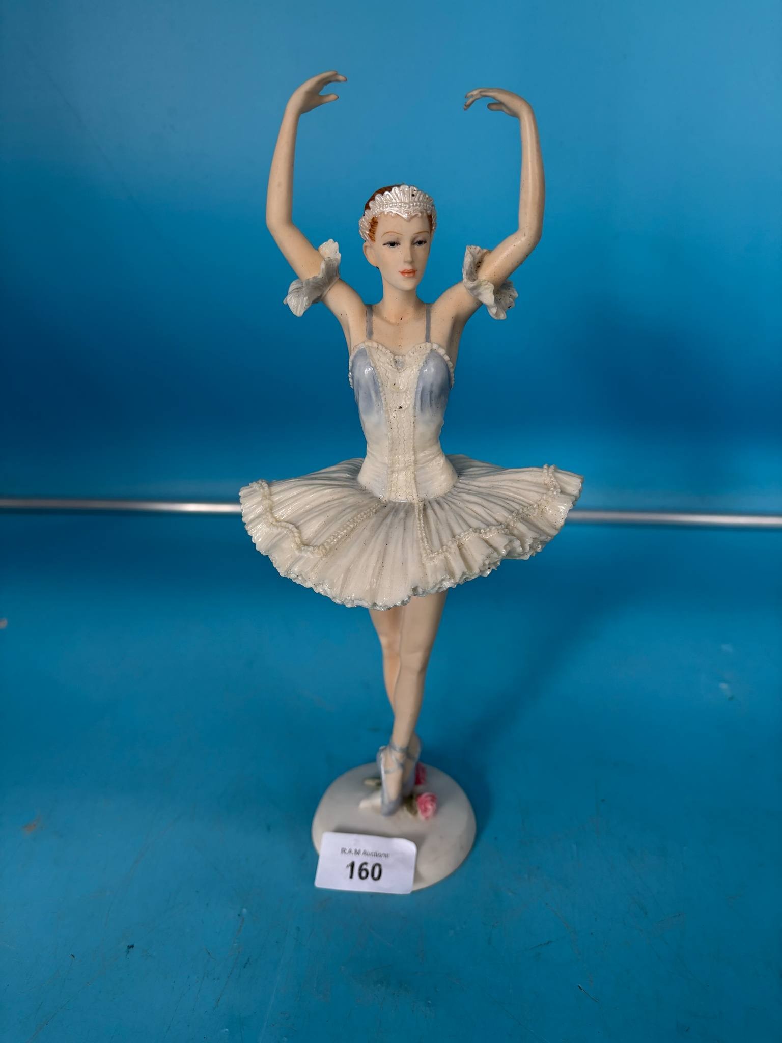 Porcelain ballerina figurine in a white tutu and light blue bodice, with a silver crown and reddish-brown hair, posed en pointe on a rose-painted base.
