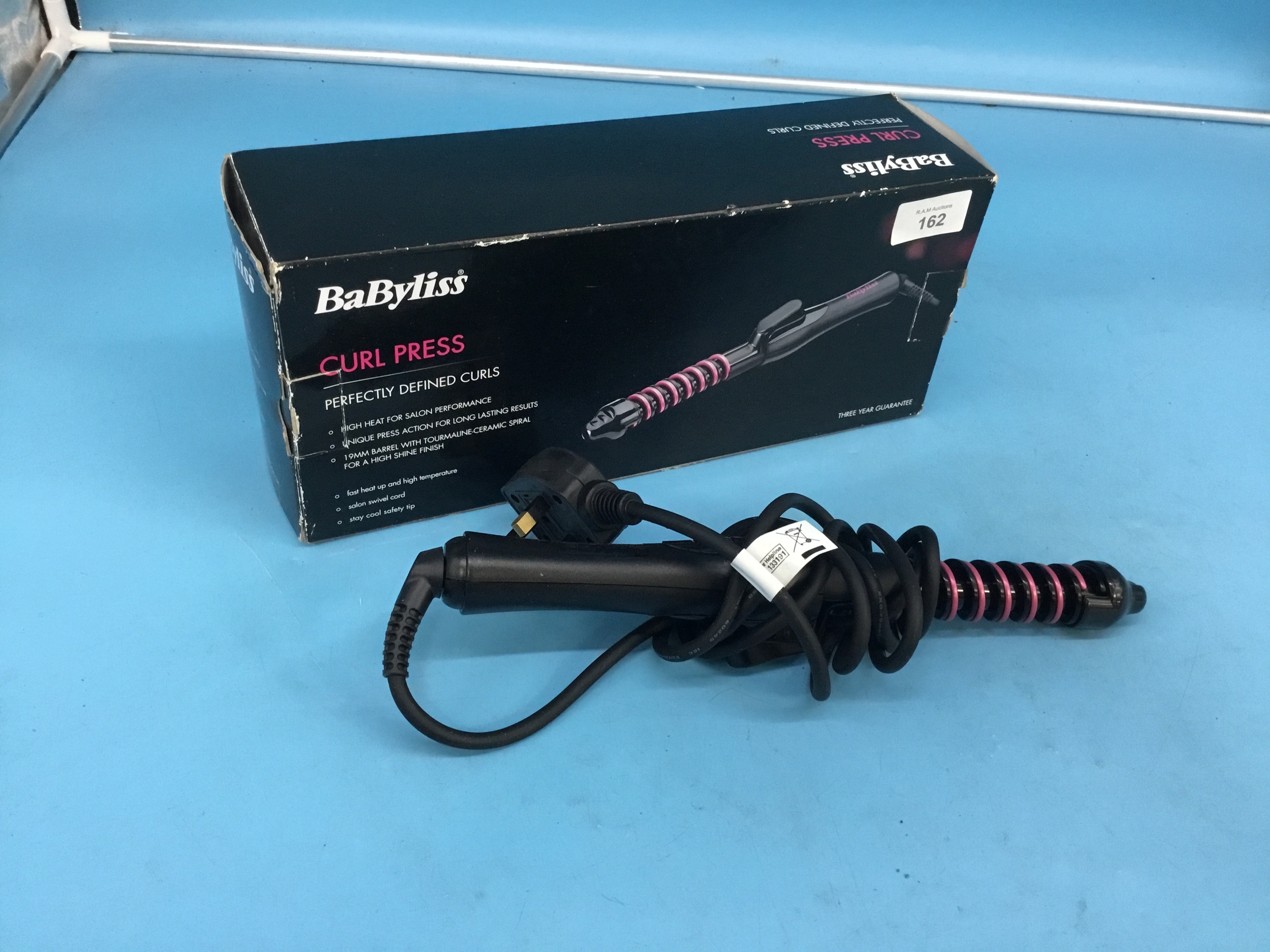 Black and pink Babyliss Pro 19mm Curl Press hair curler with UK plug.