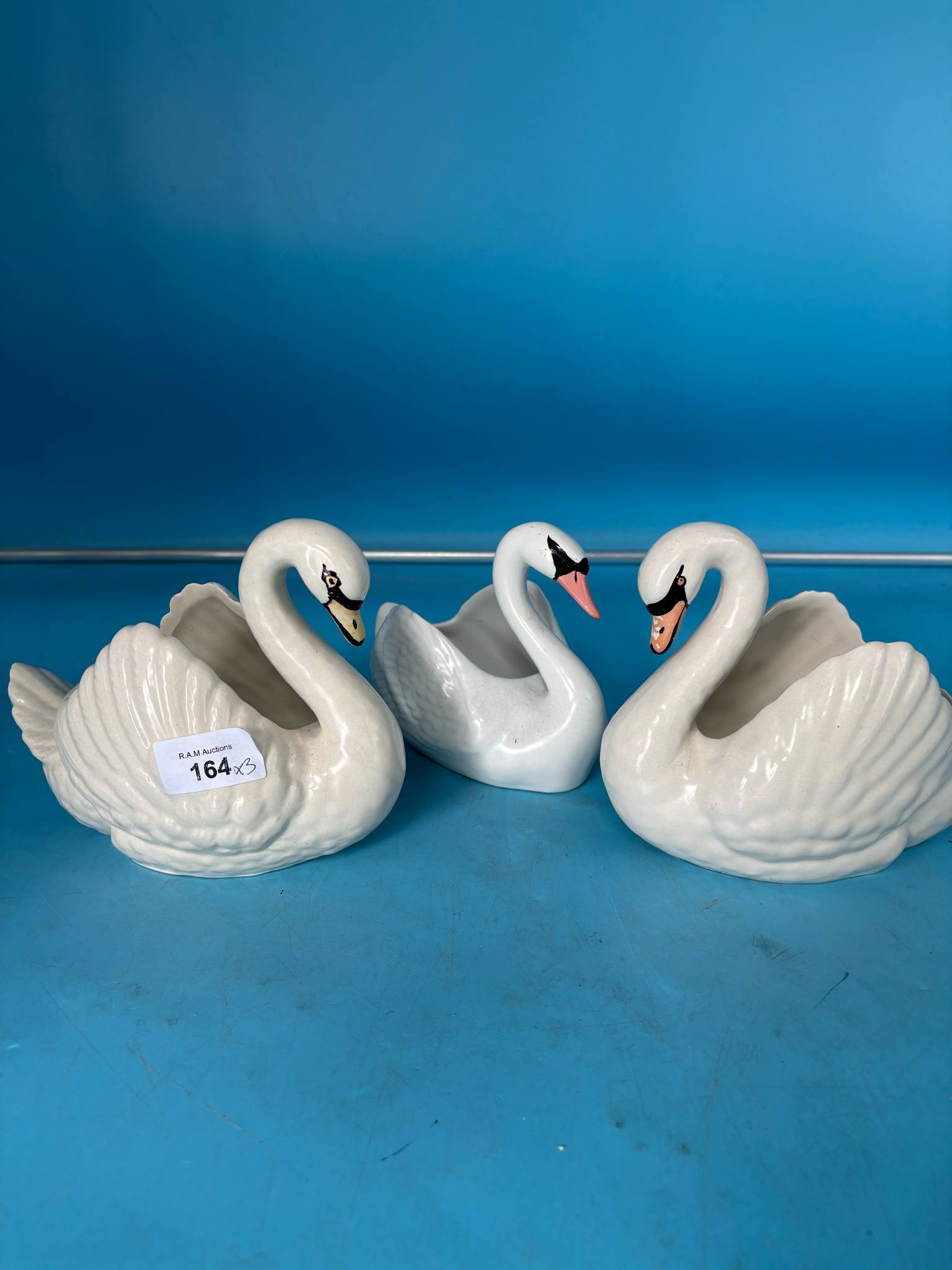 Three hollow ceramic swan-shaped vessels with painted details.