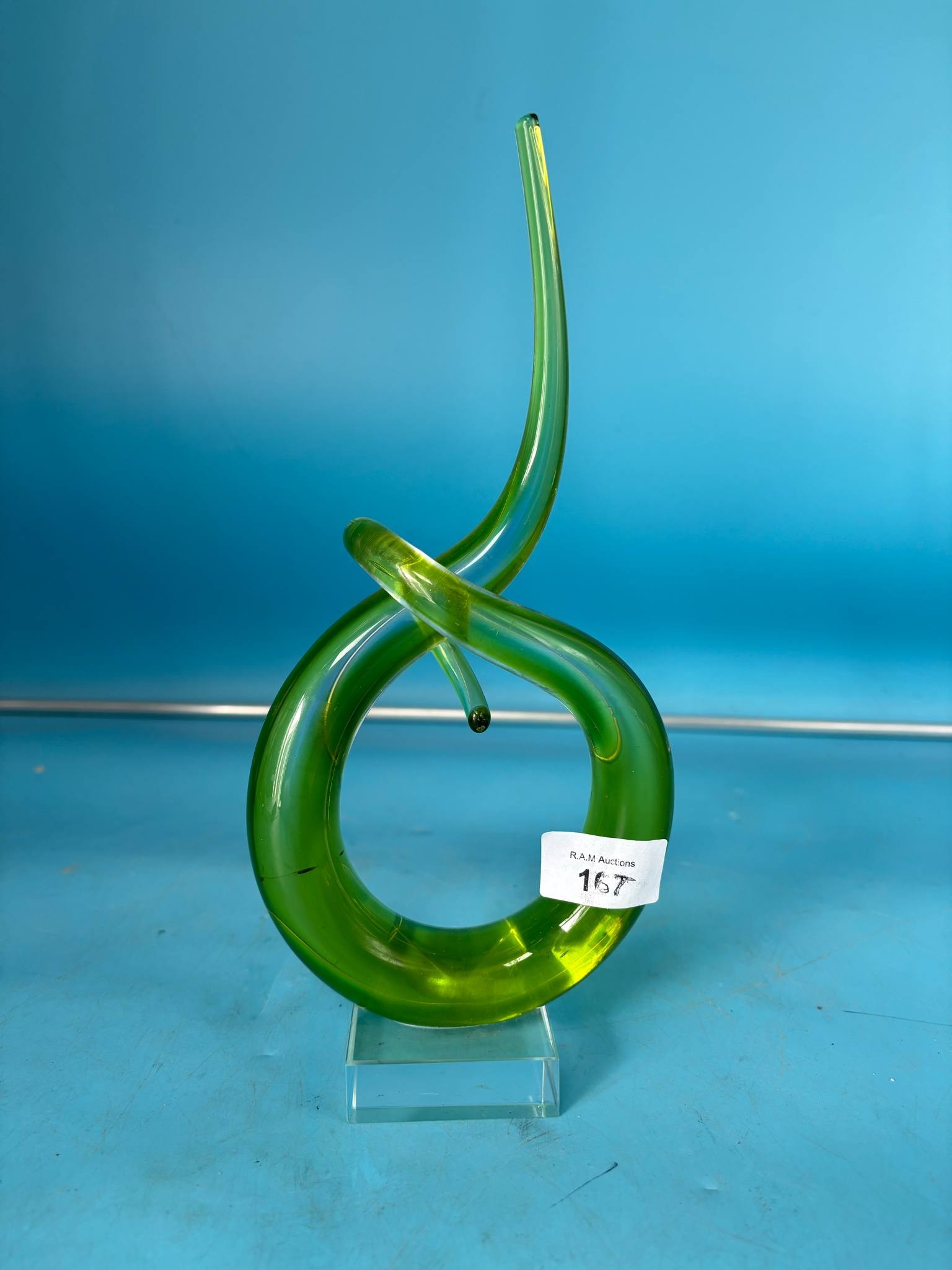 A lime-green translucent glass sculpture of two intertwined curved tubes forming a loop, resting on a clear rectangular base.