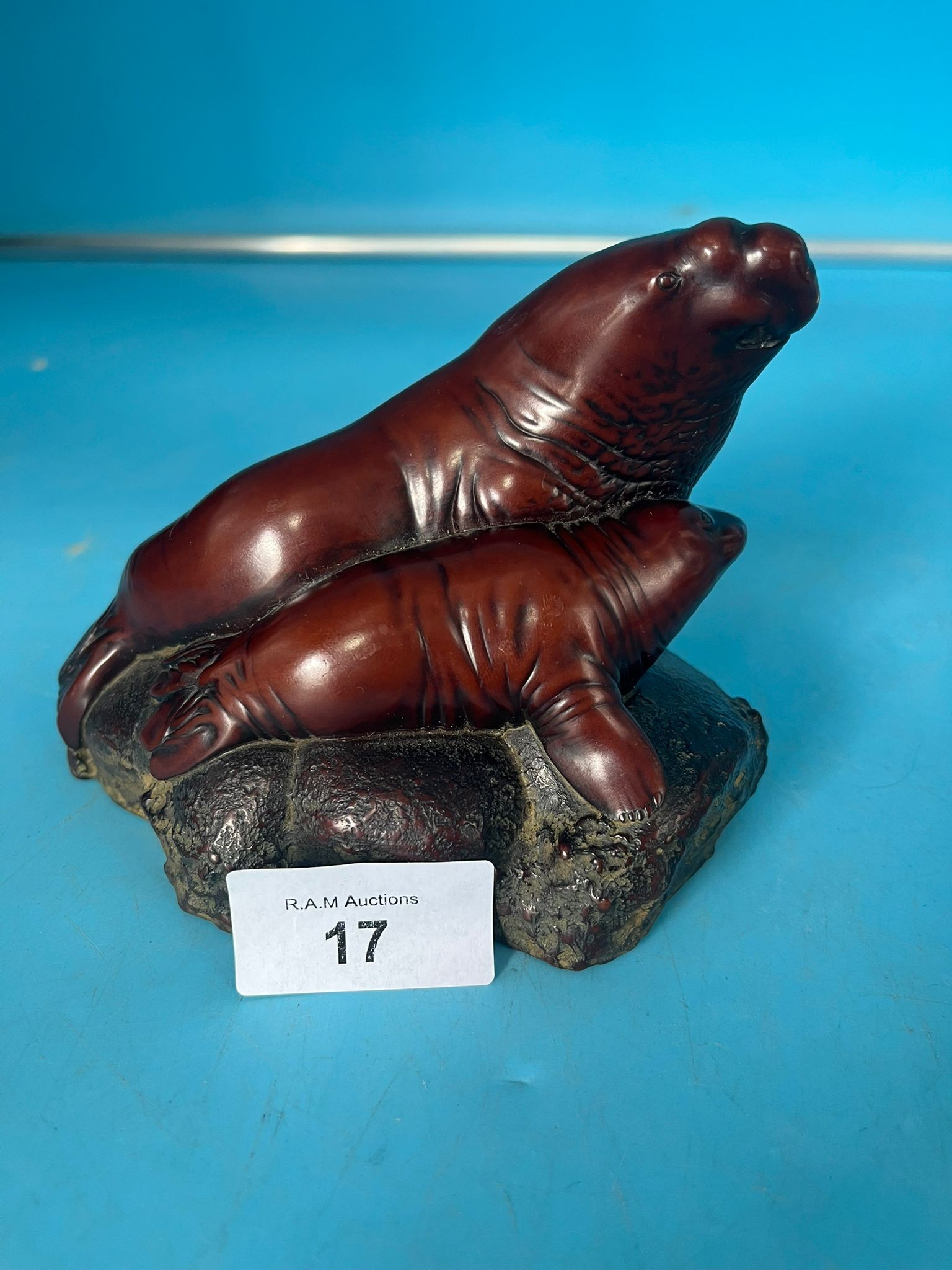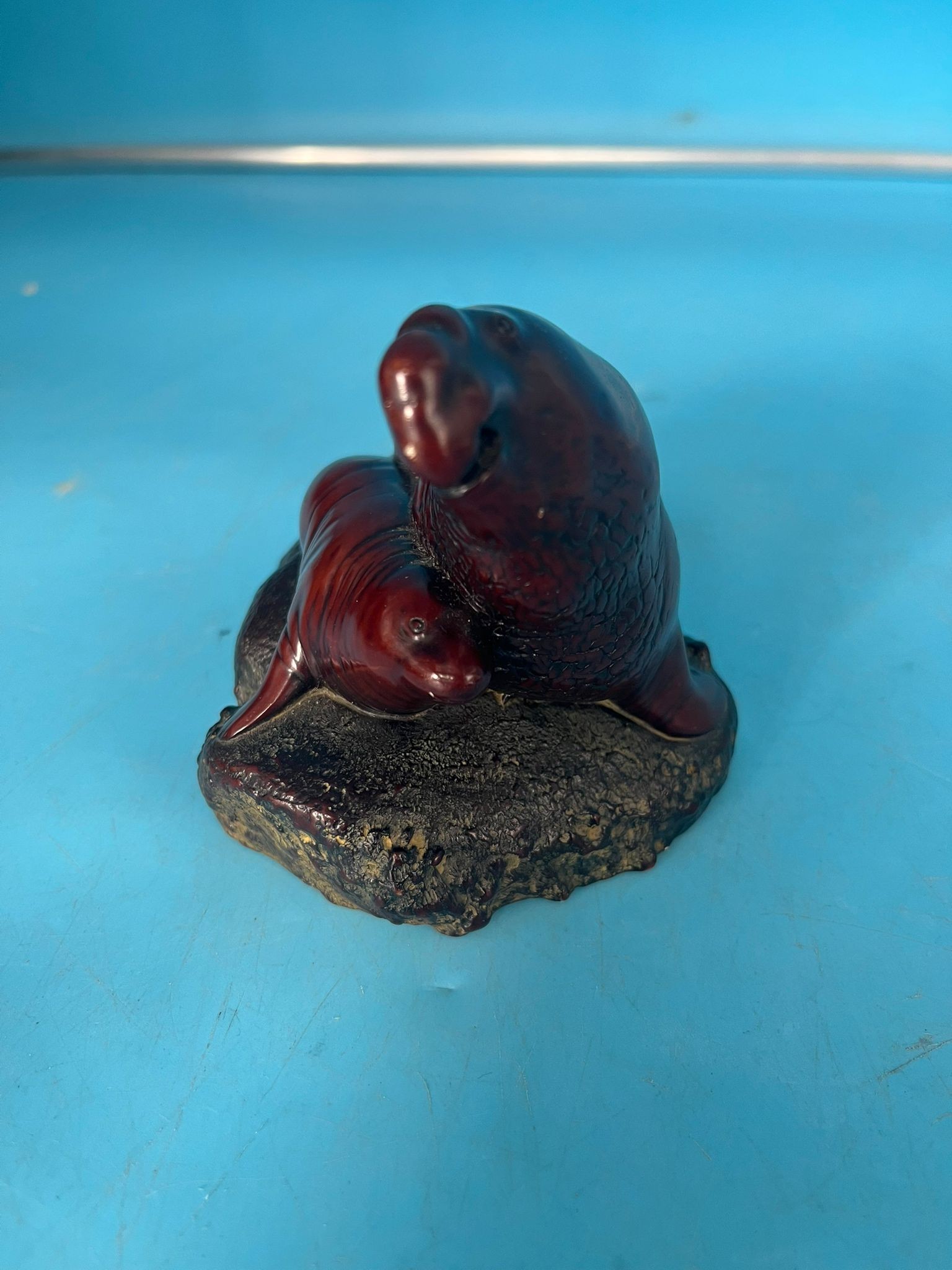 Dark reddish-brown resin figurine of a mother seal and pup on a textured rock base.