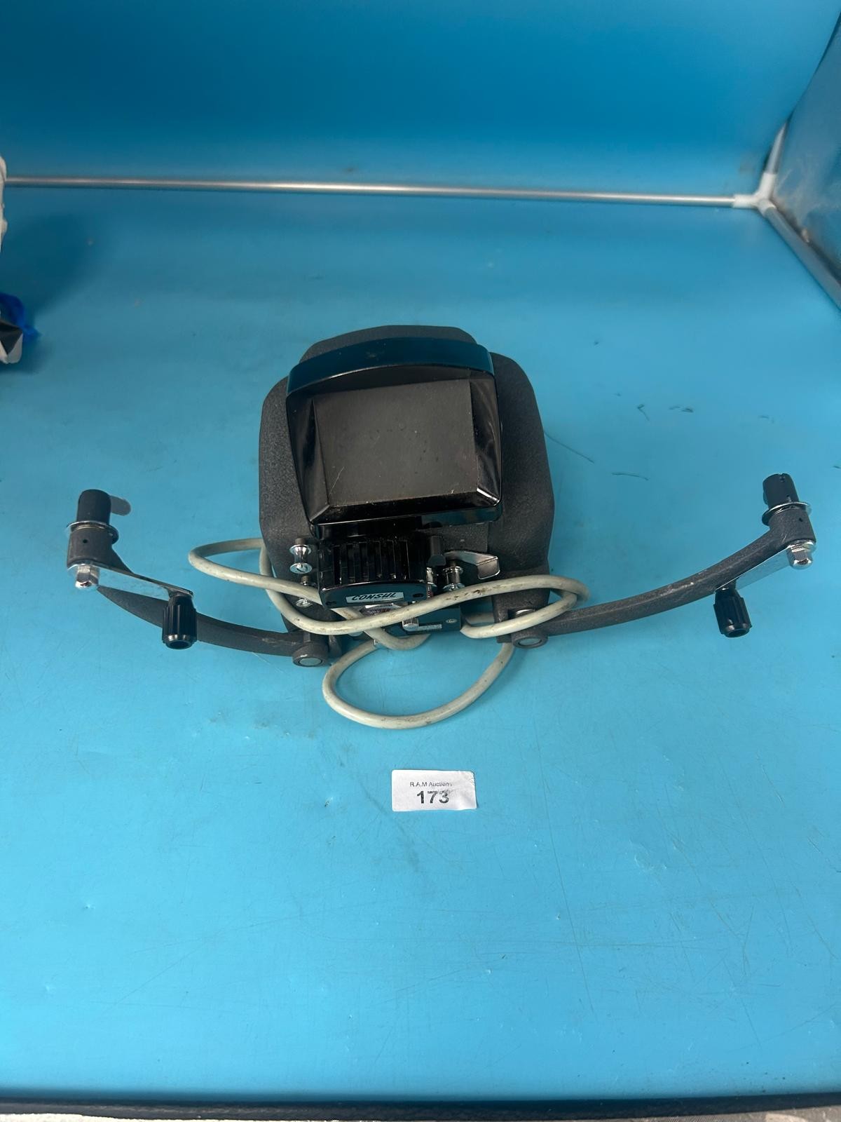 Black rectangular device with glossy top, textured side, two extending arms with rods and knobs, and a light gray cord.