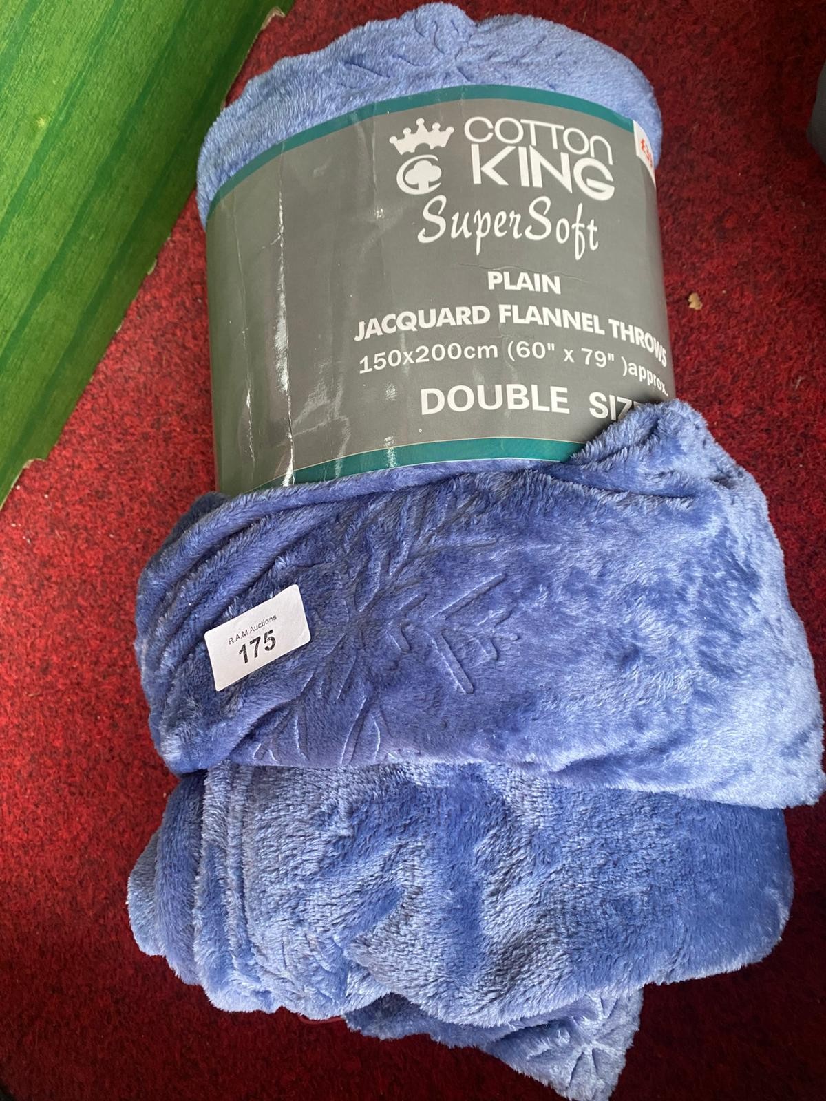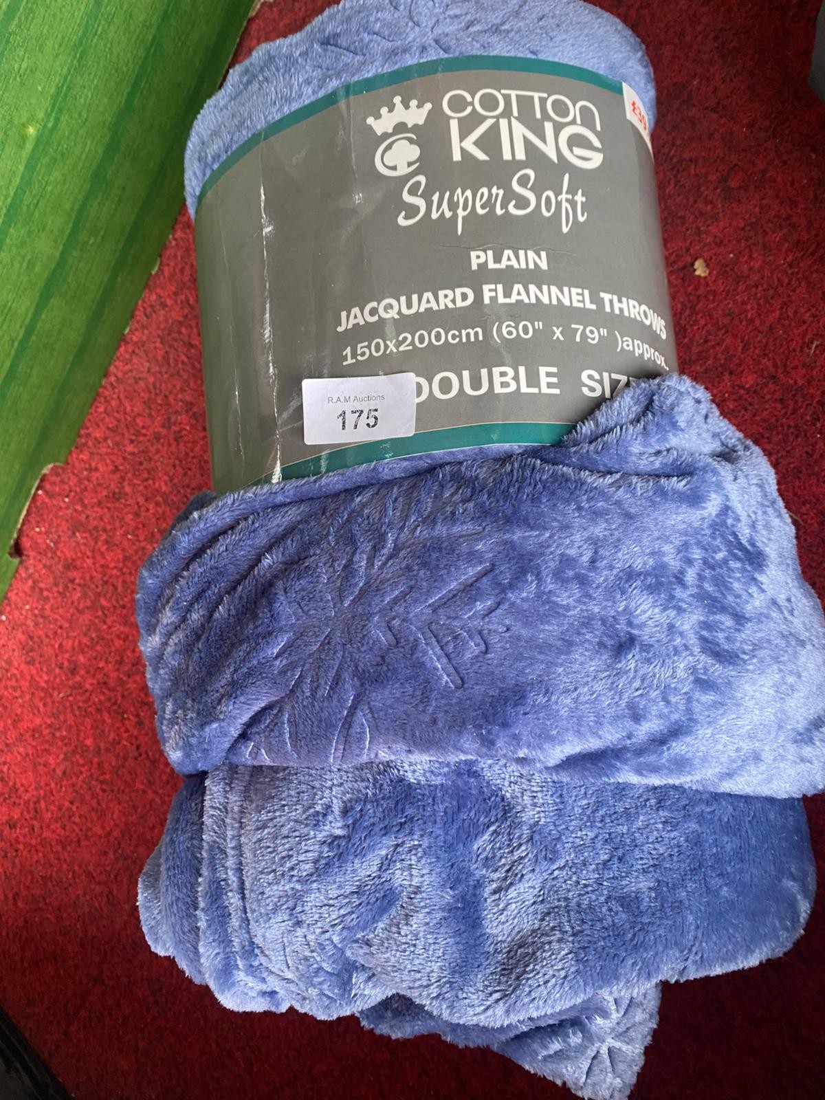 A rolled, blue jacquard flannel throw blanket measuring approximately 150x200cm with an embossed floral-like pattern.