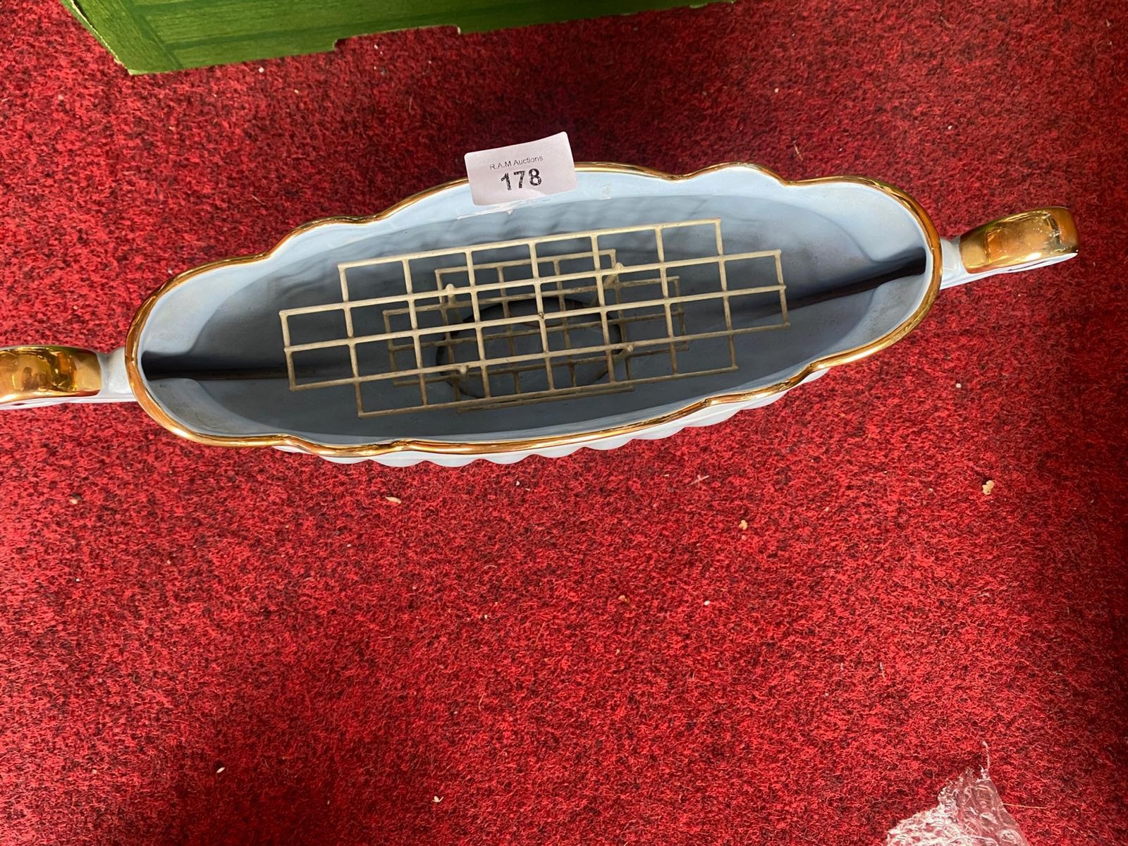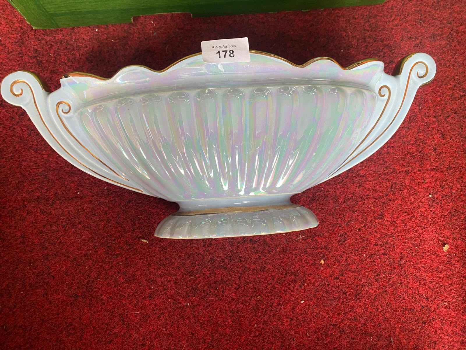 An oval-shaped ceramic bowl with iridescent light blue/lavender glaze, vertical ribbed detailing, scalloped edge, and gold-colored trim on the rim and scrolled handles, all on a short, footed pedestal.