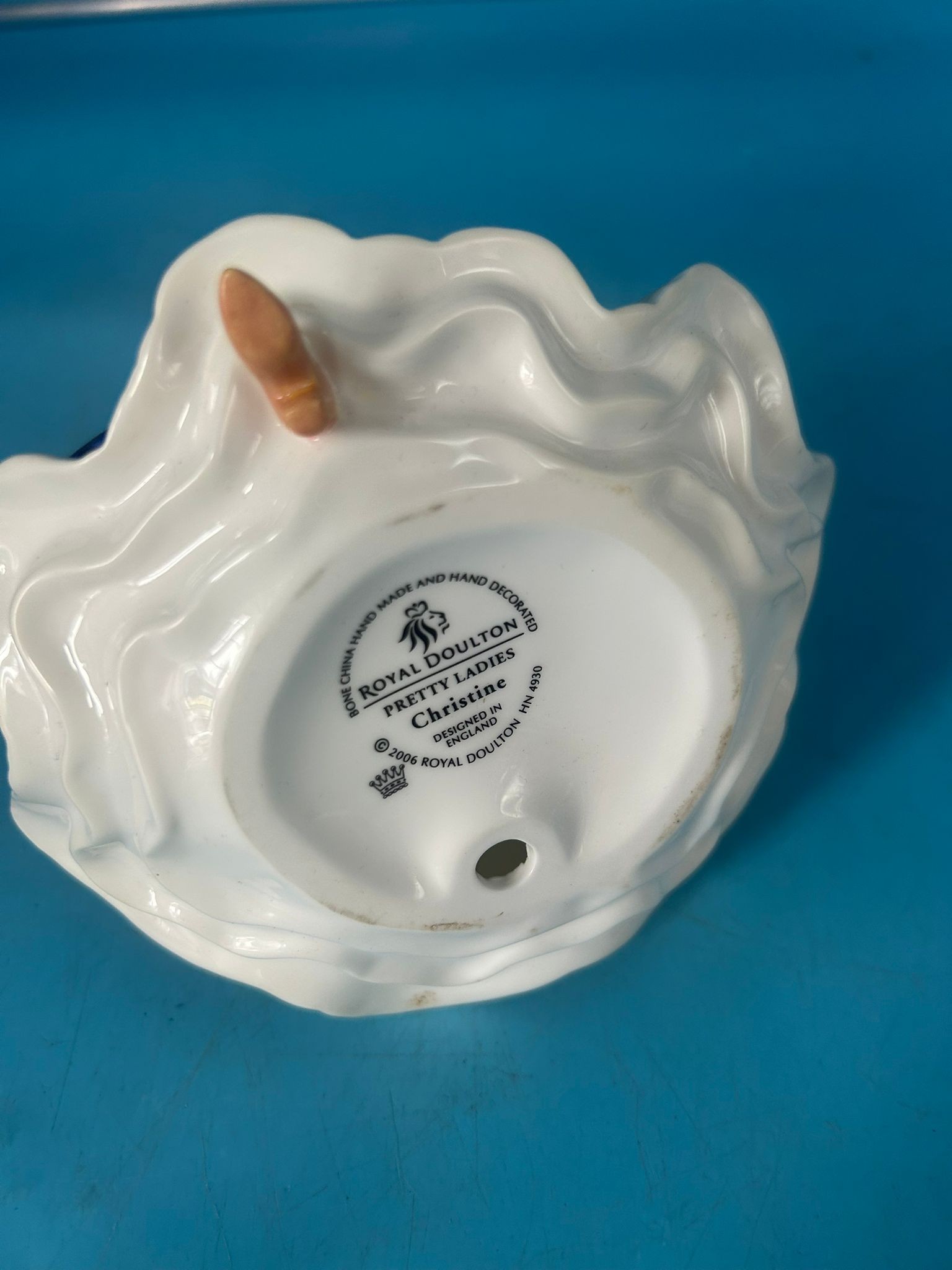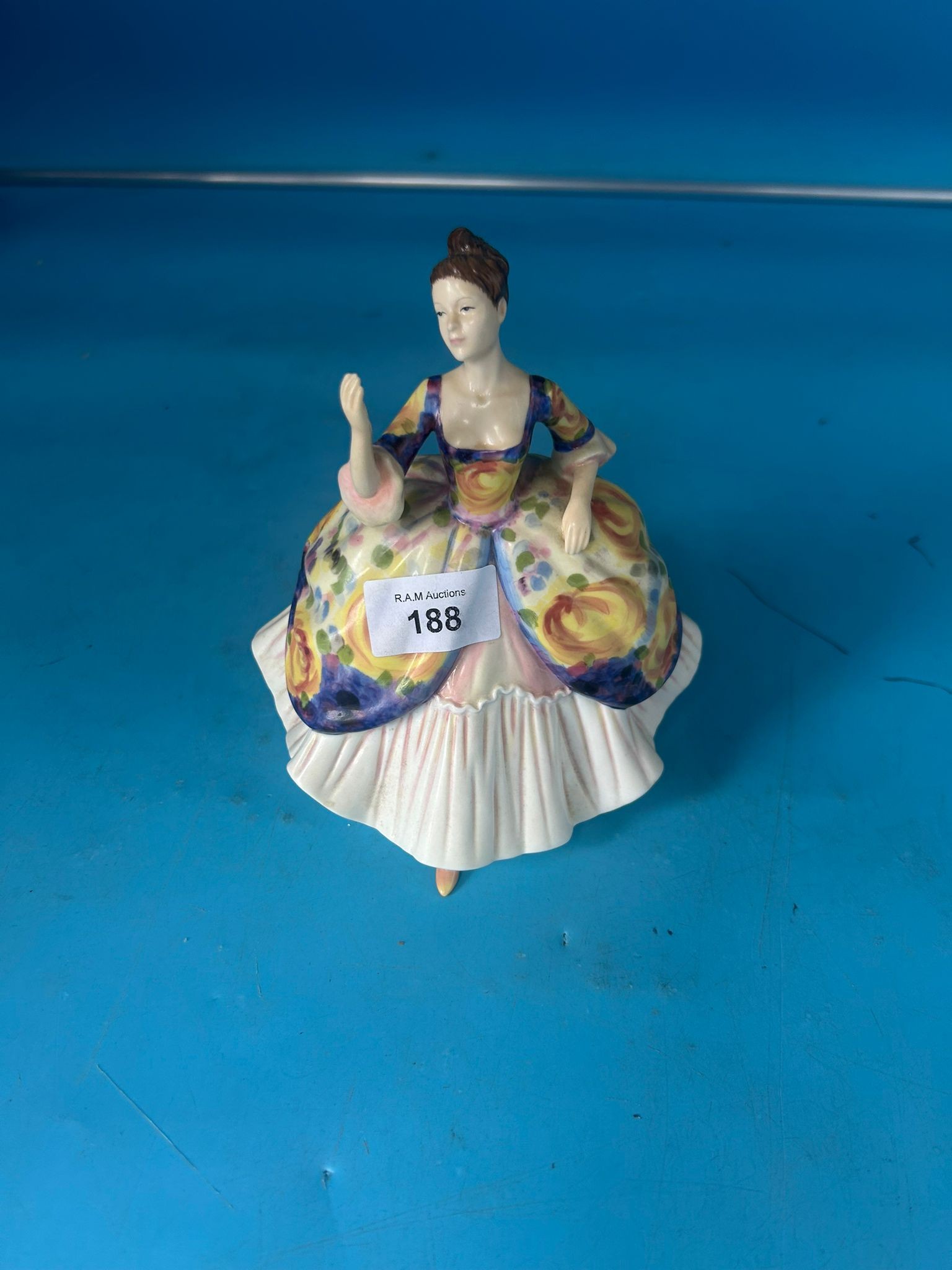 Royal Doulton bone china figurine of a seated woman in a floral dress.