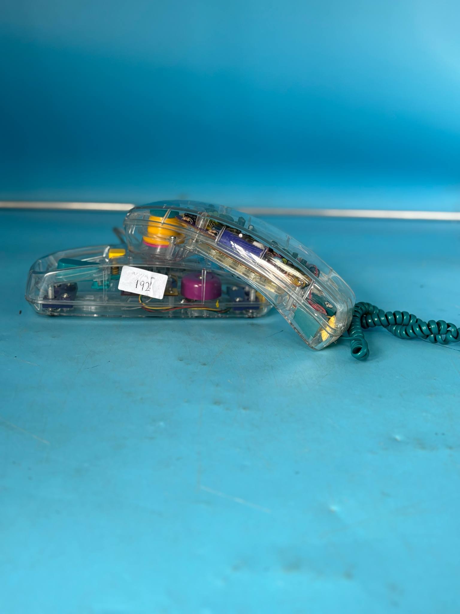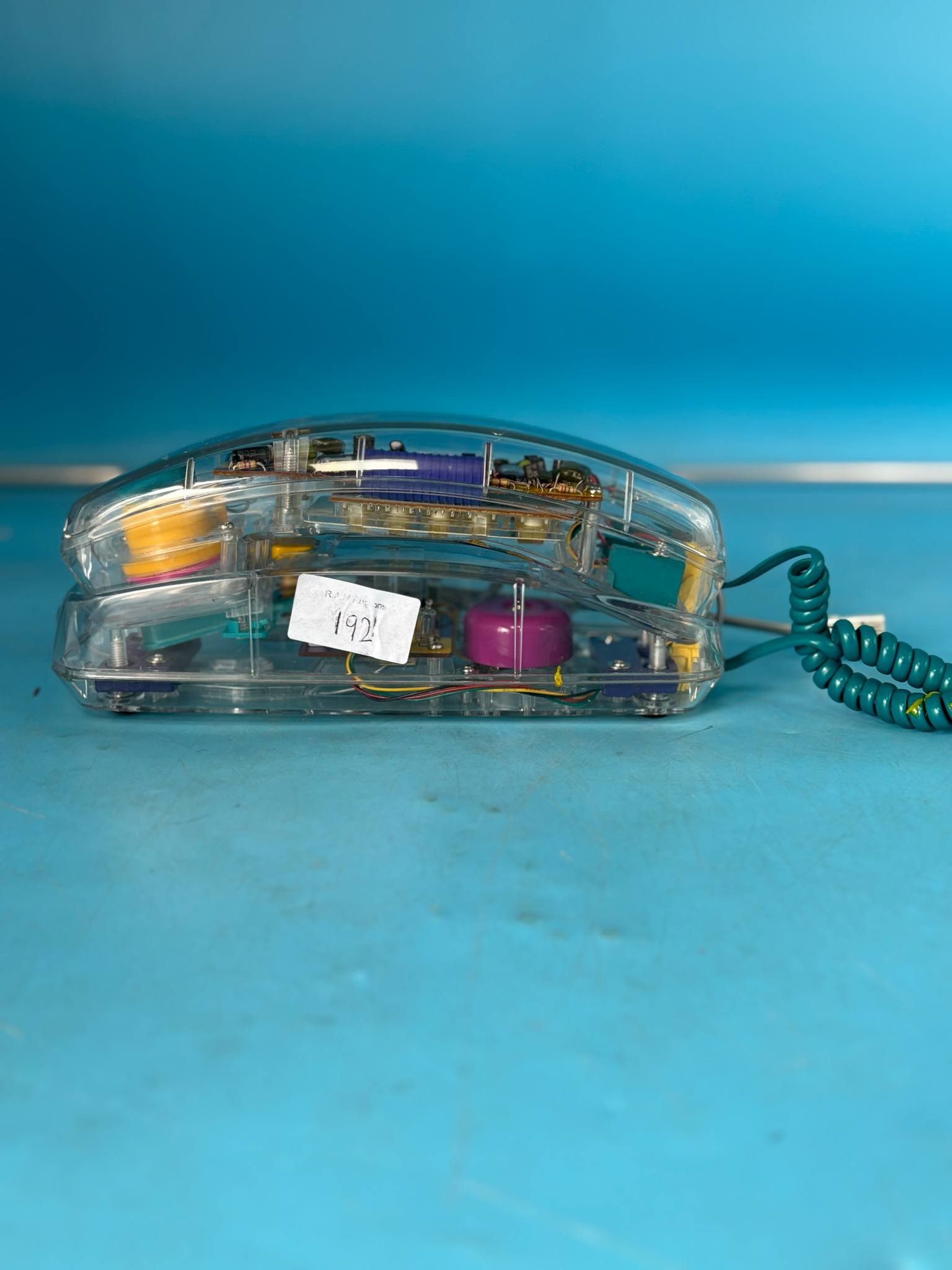A clear plastic clamshell telephone with a teal coiled cord and visible yellow, purple, and teal internal components.