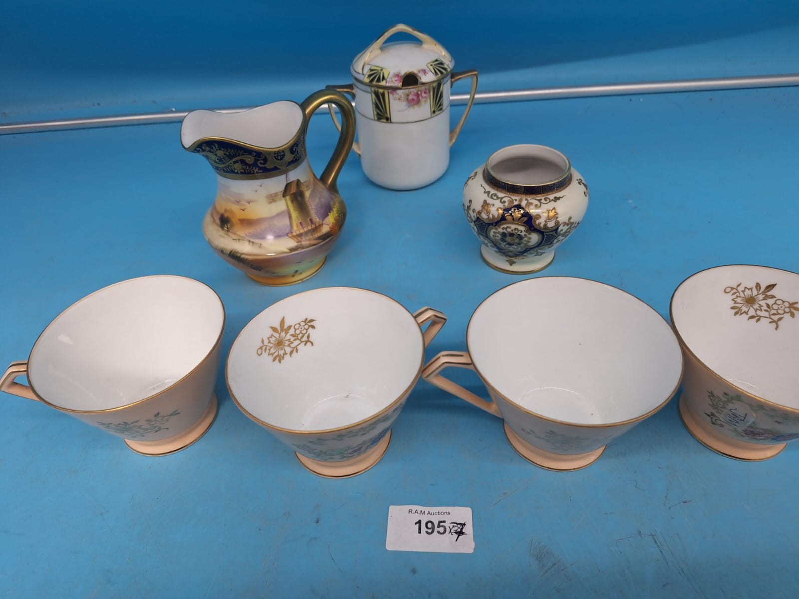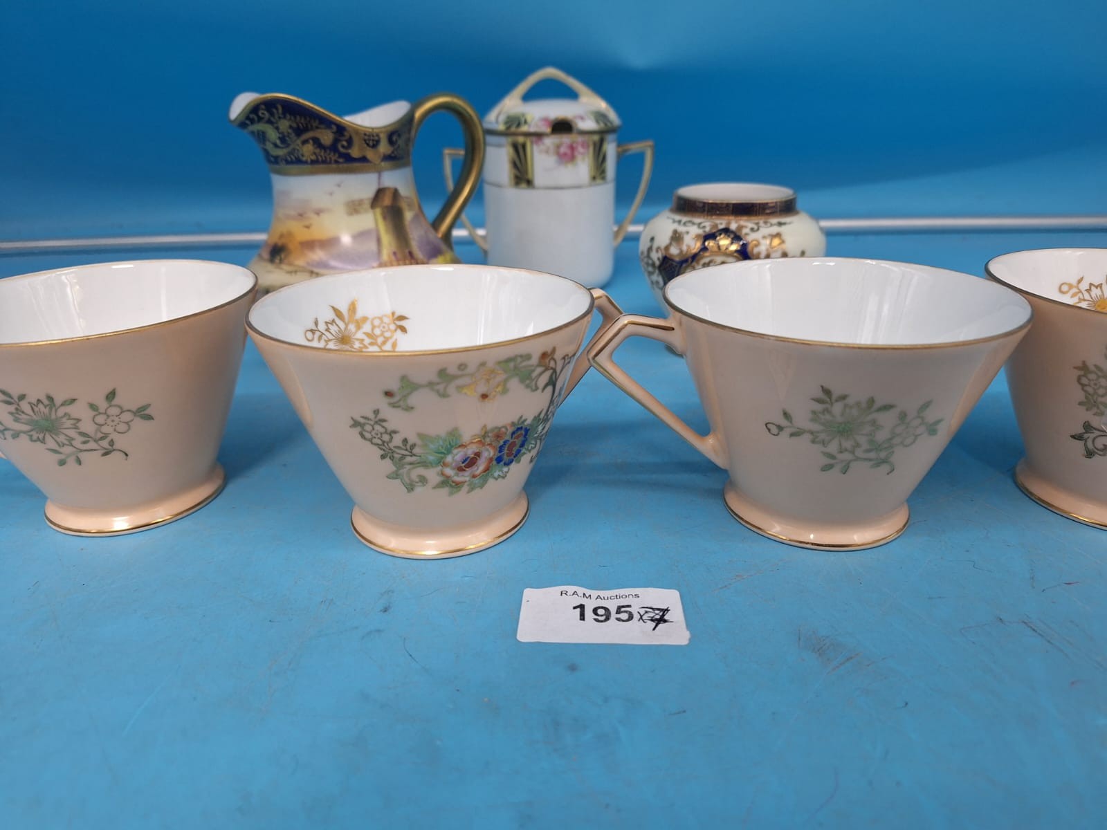 Porcelain teacups, creamer, sugar bowl, and jar with floral and landscape decorations.