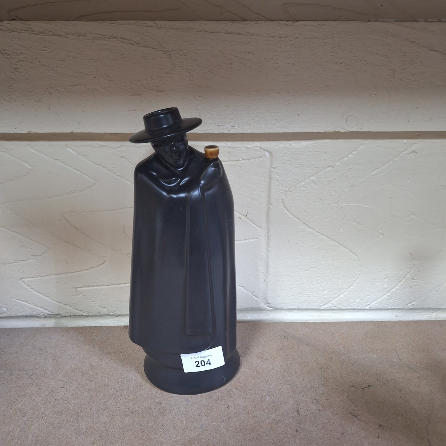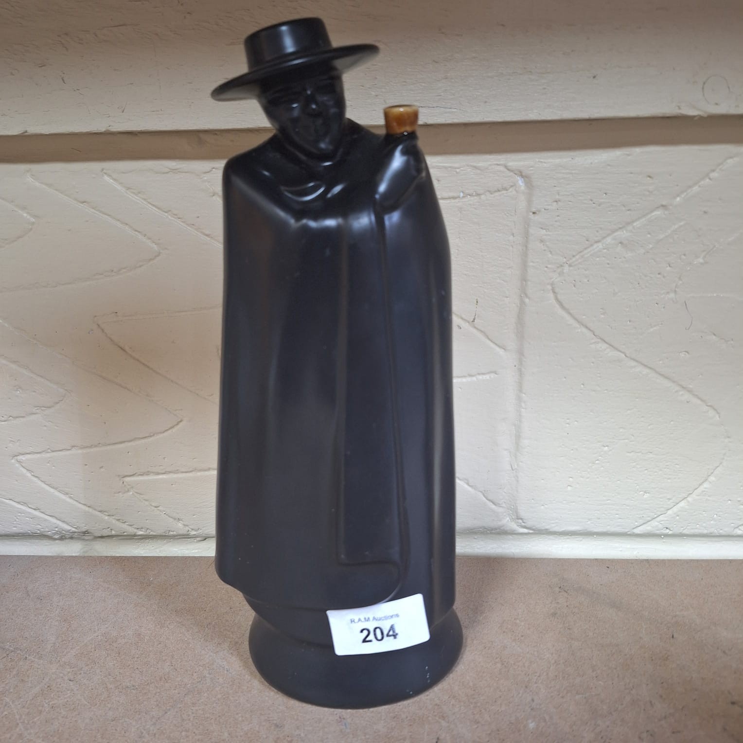 Black ceramic decanter in the shape of a cloaked man holding a cup.