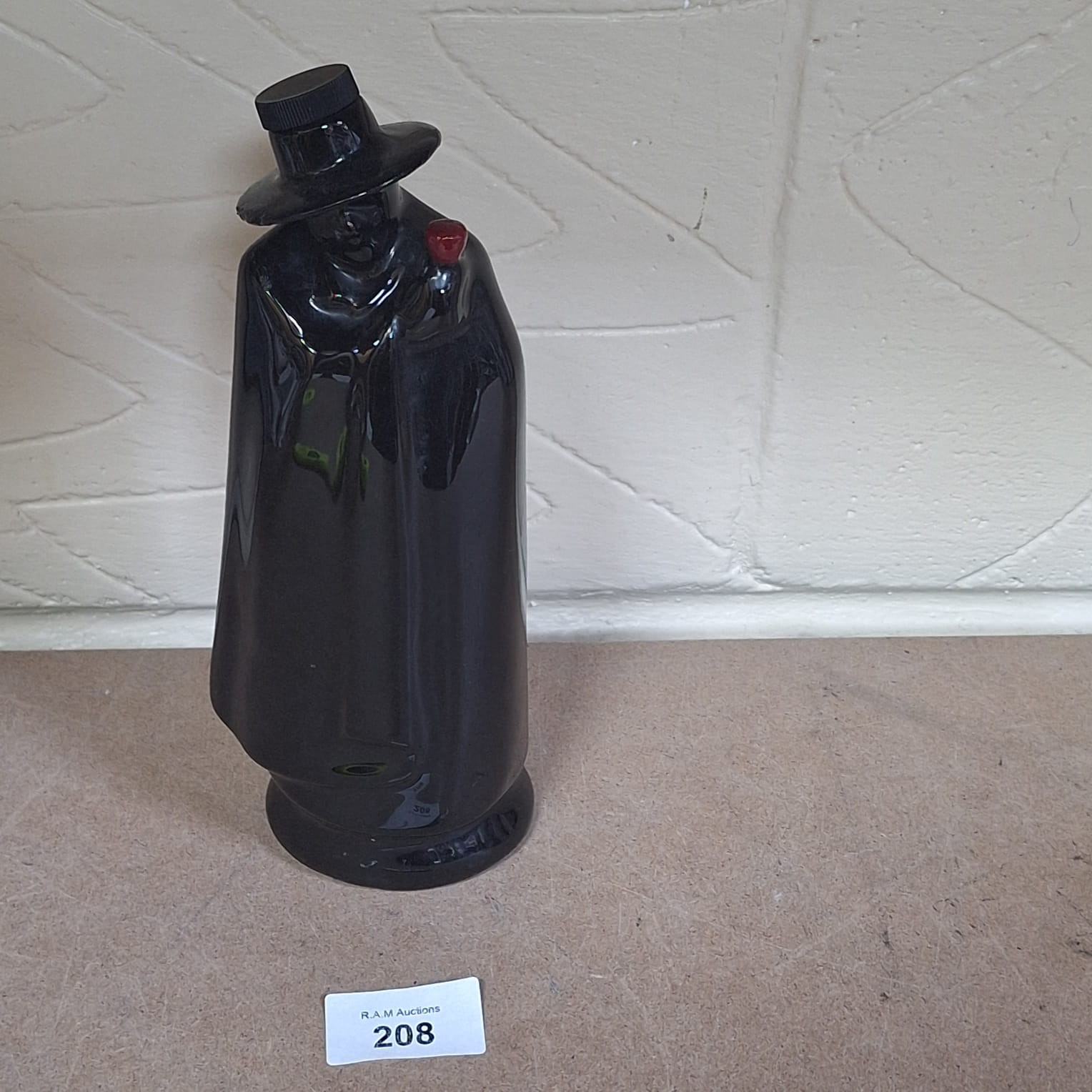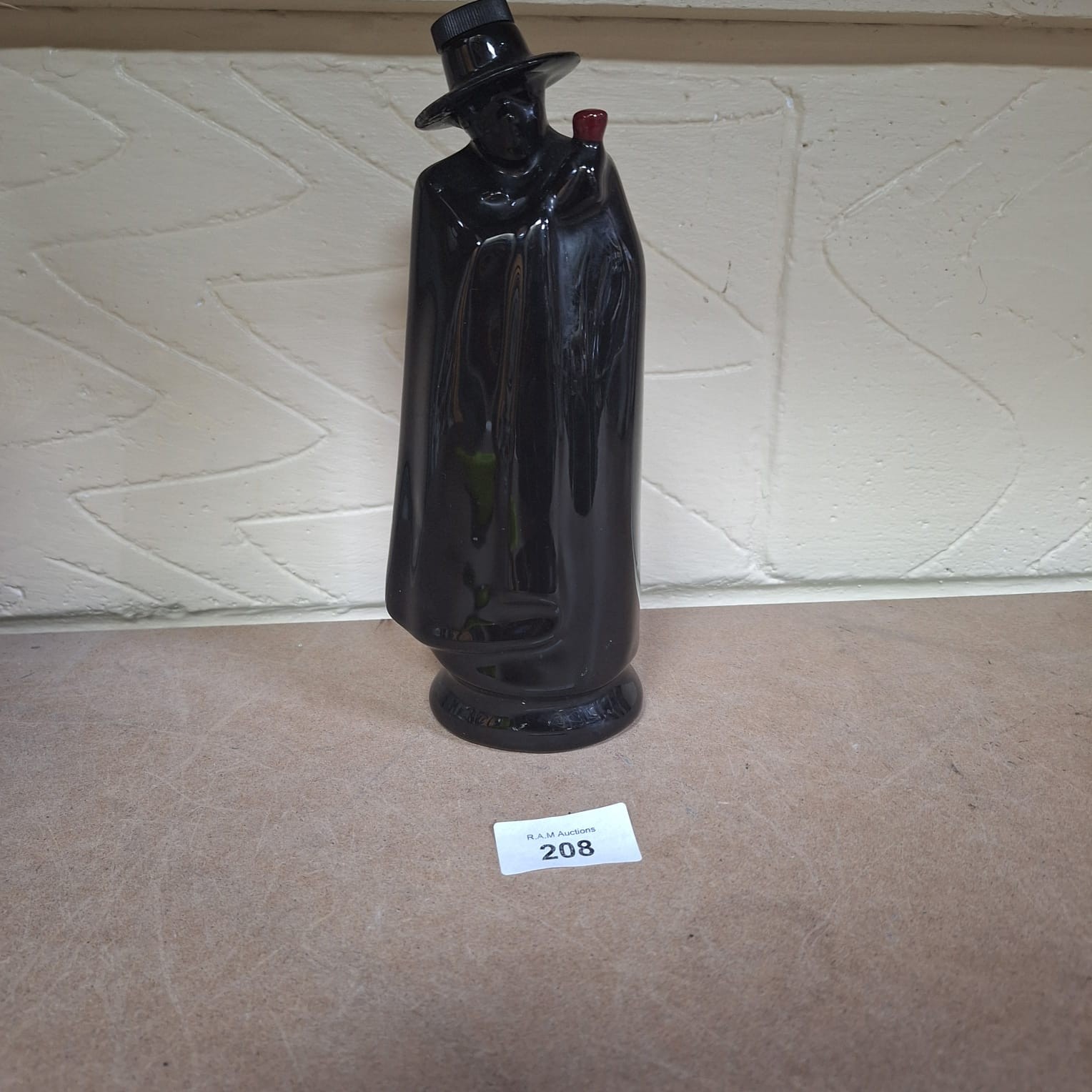 Black ceramic figurine of a cloaked figure holding a pipe, marked “WADE ENGLAND”.