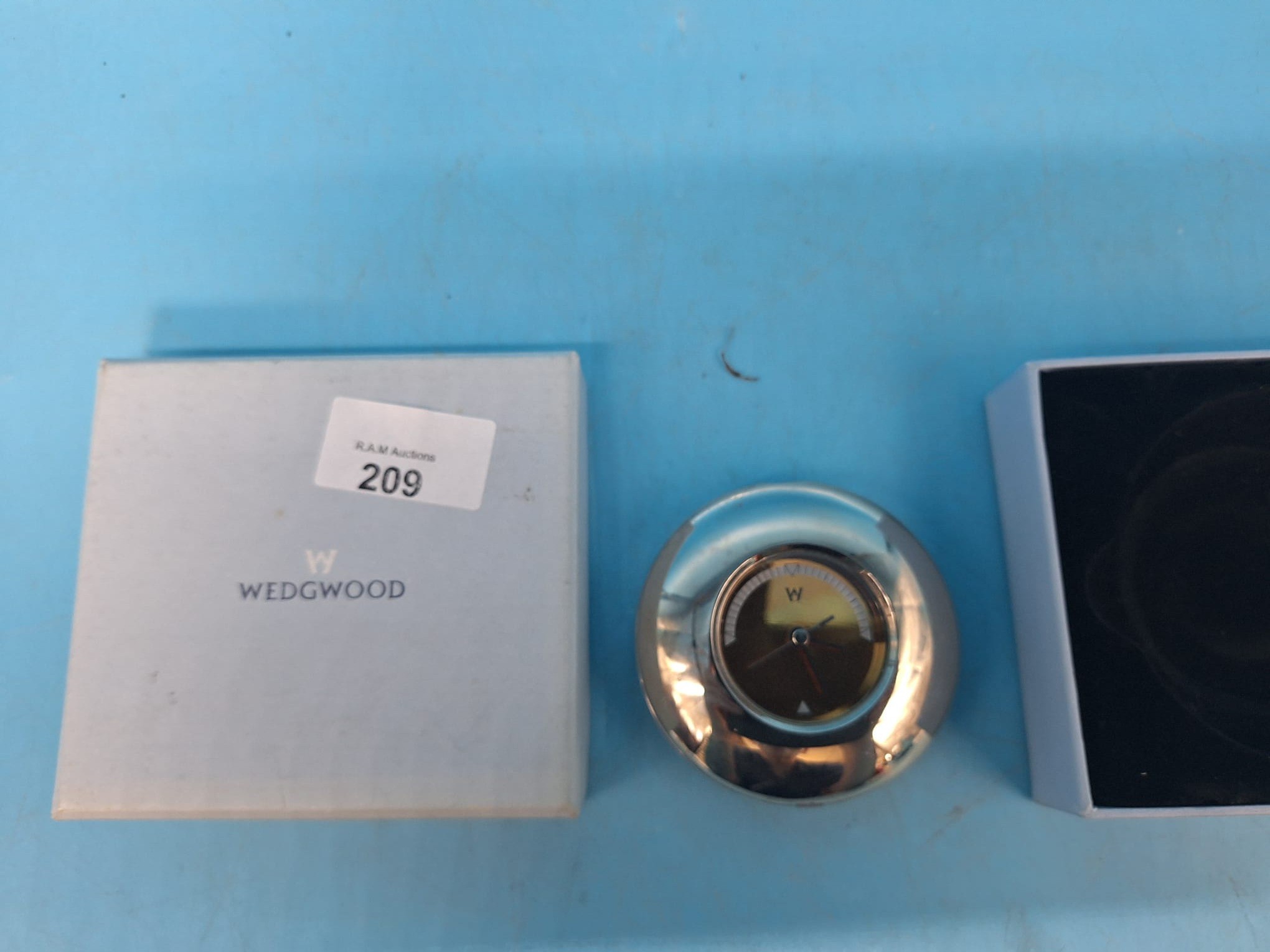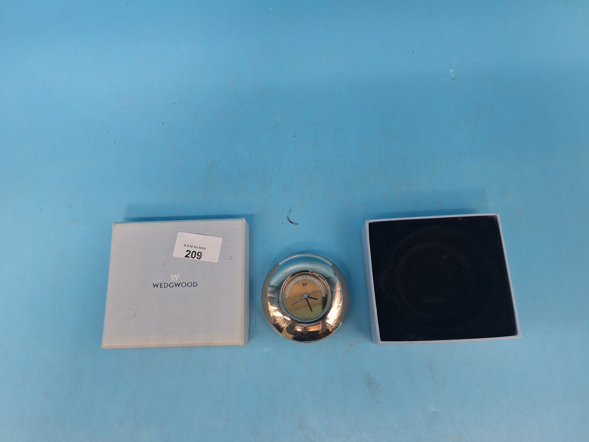 Silver-toned metal clock with a gold-colored face and black hour markers, accompanied by Wedgwood and other boxes.
