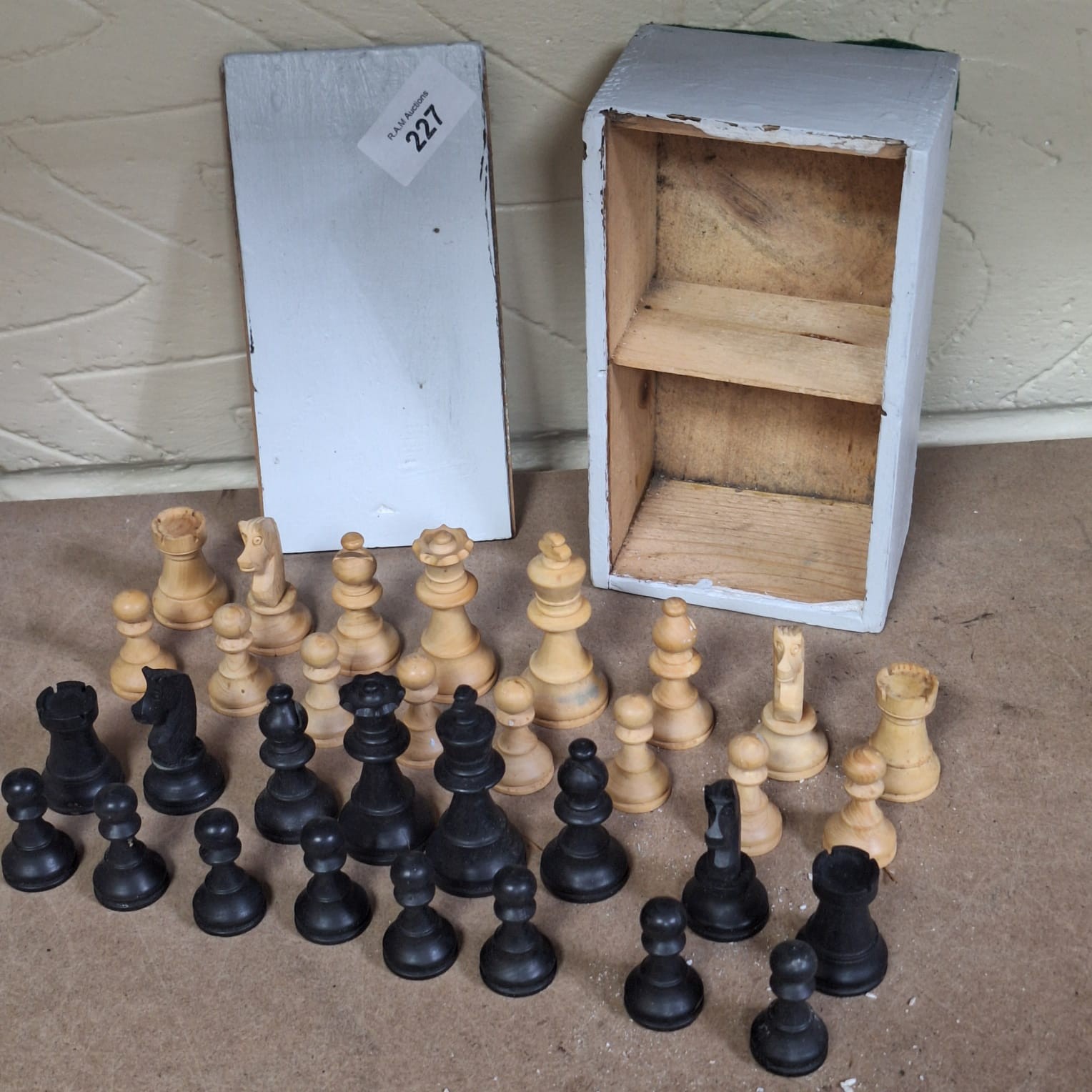 Carved wooden chess pieces in a wooden box with internal shelves and a removable lid.