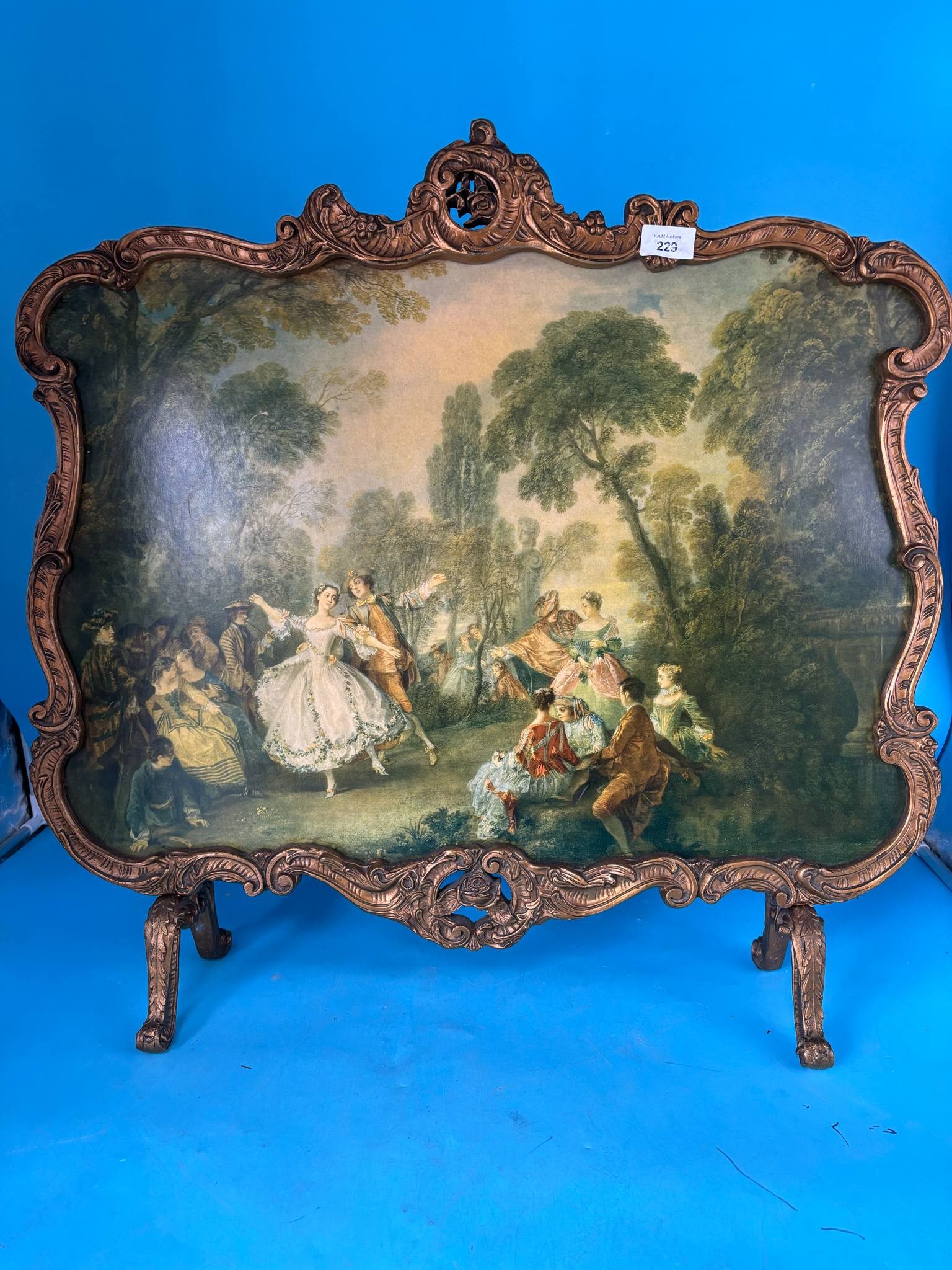 Ornate gold-colored fire screen with rococo carvings, depicting an 18th-century pastoral scene.