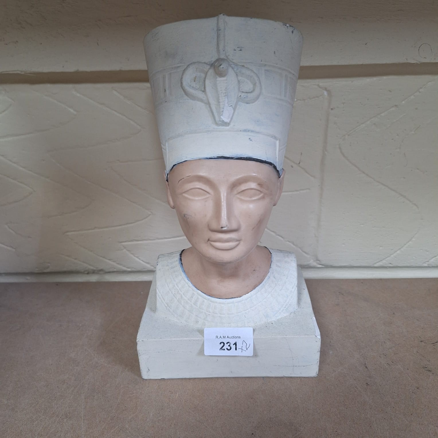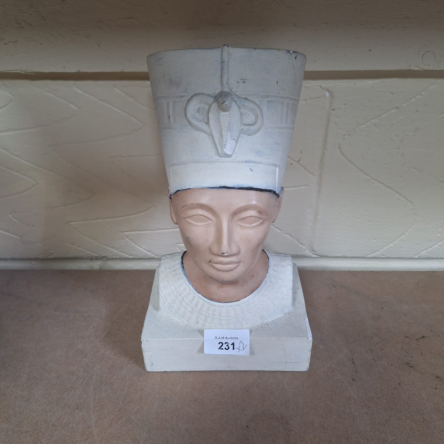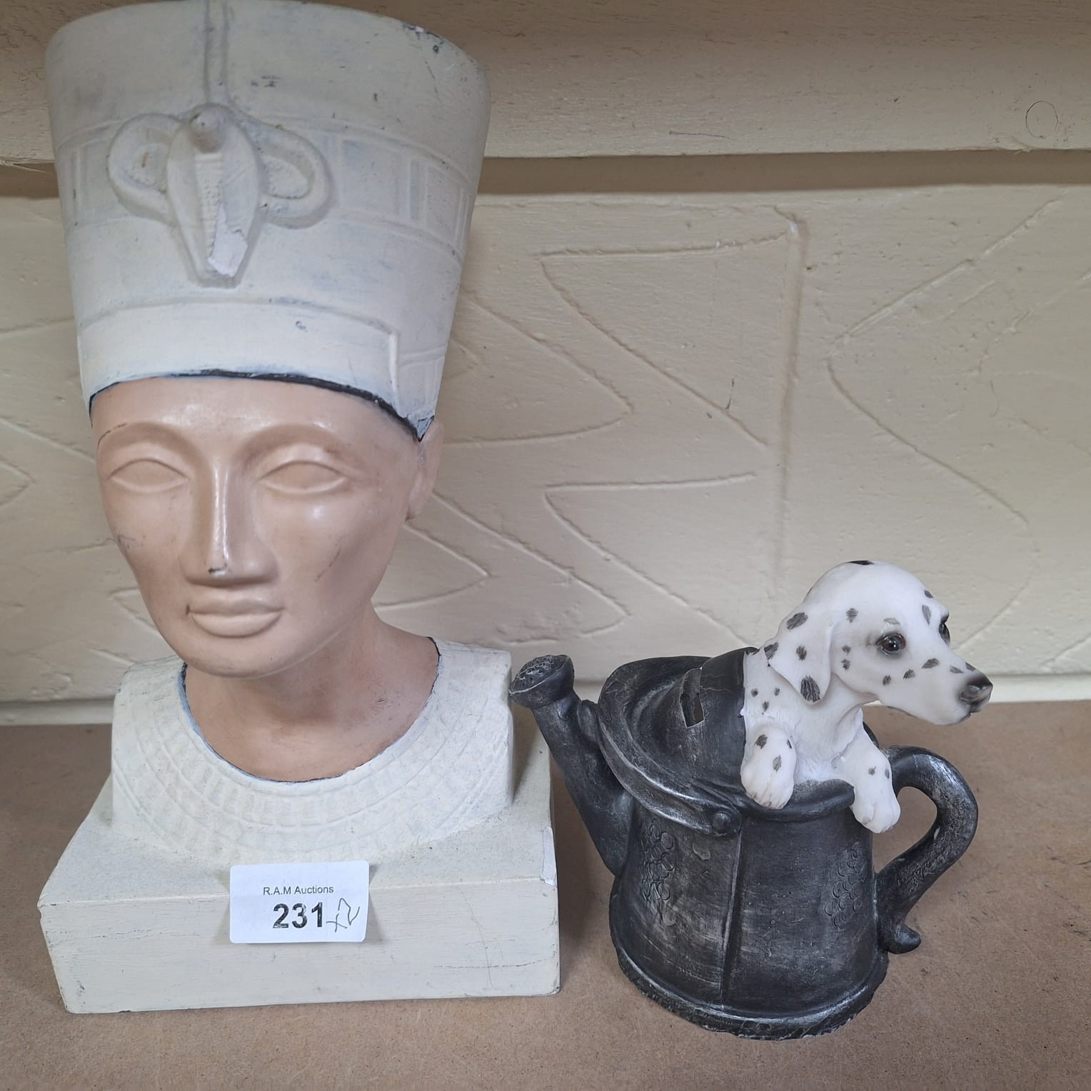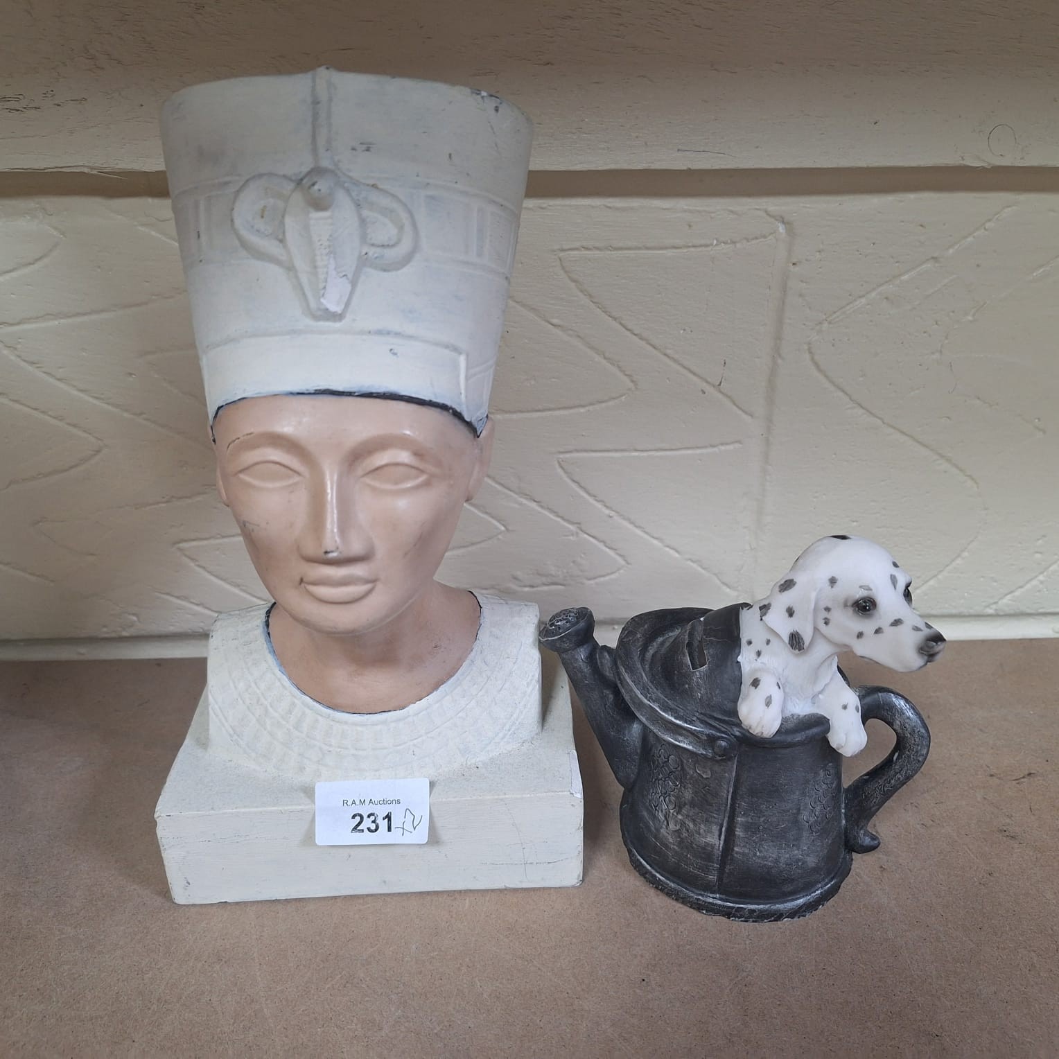 A bust of a woman in a Nefertiti-style headdress and a Dalmatian dog in a watering can.