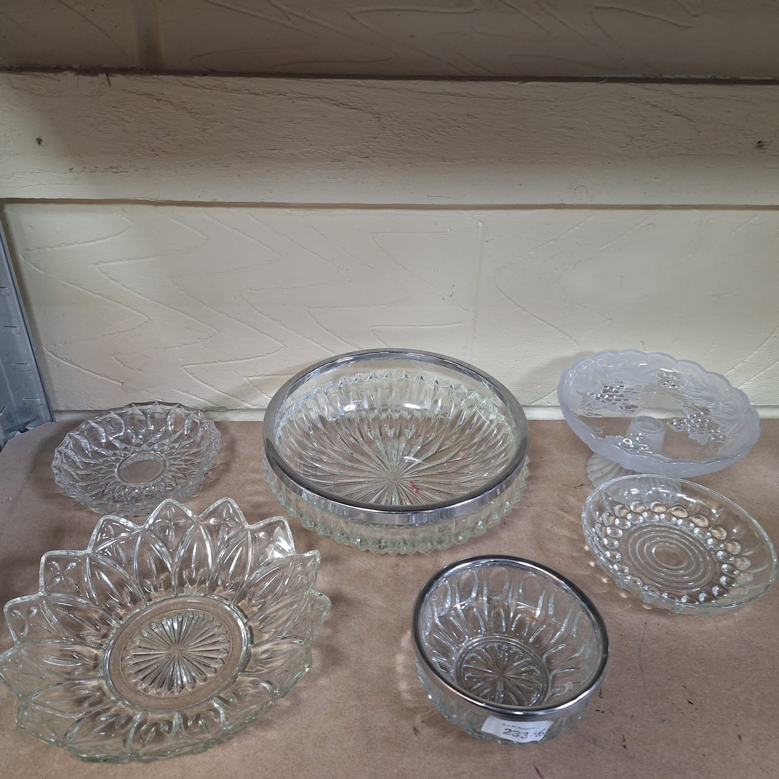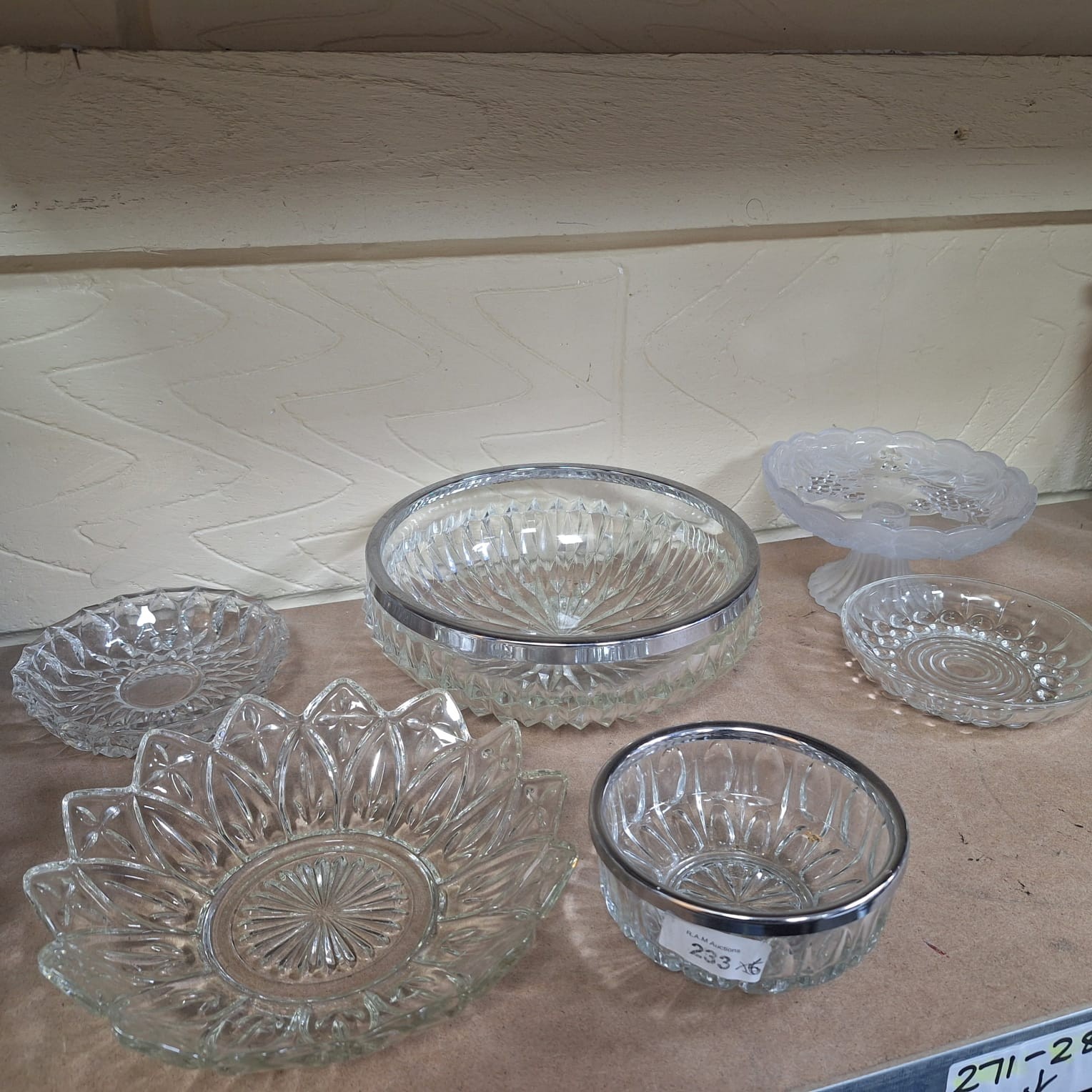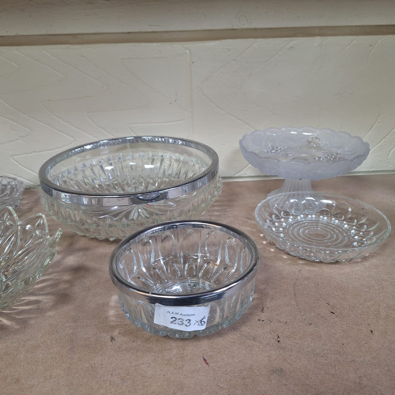 Ribbed glass bowls with metal rims, petal dish, and frosted pedestal dish.
