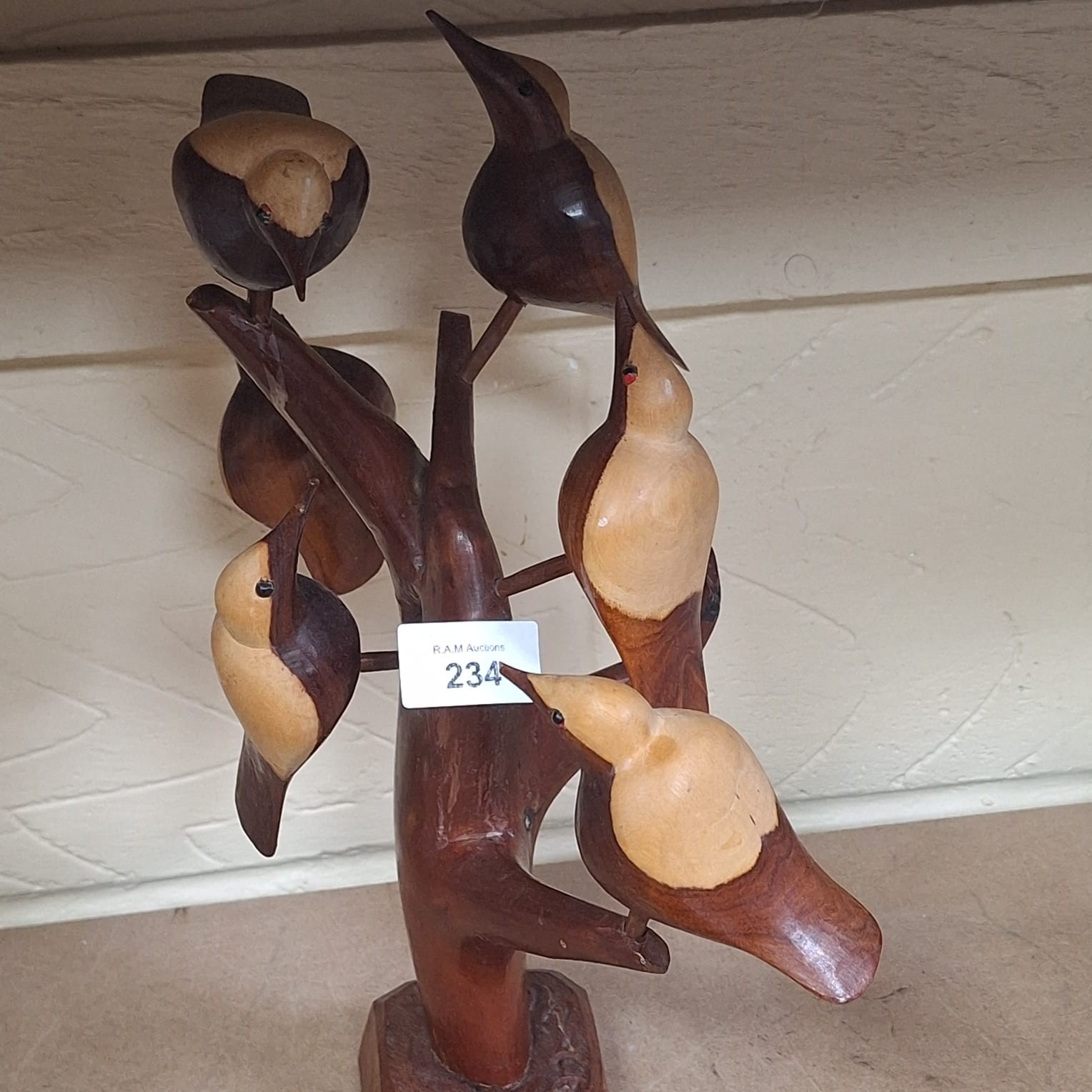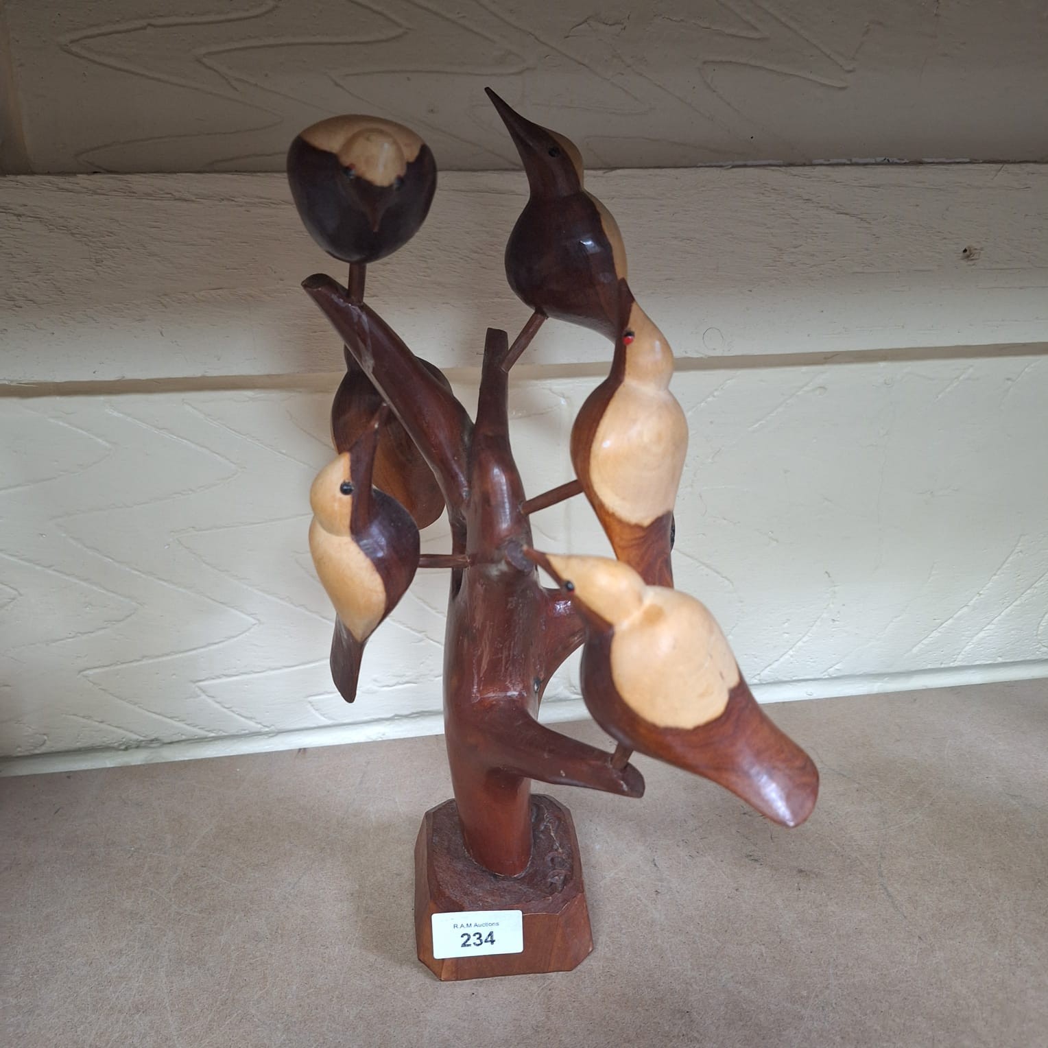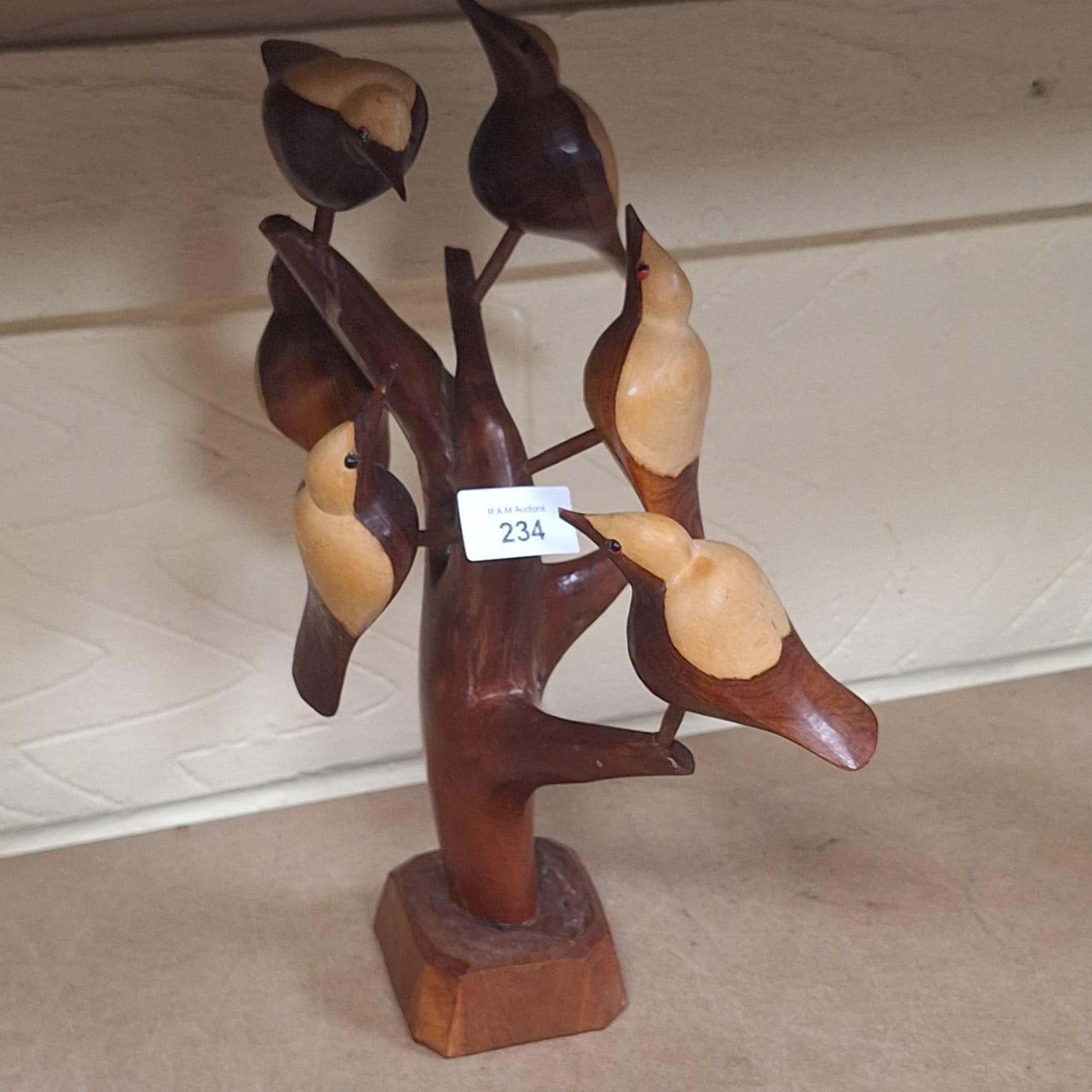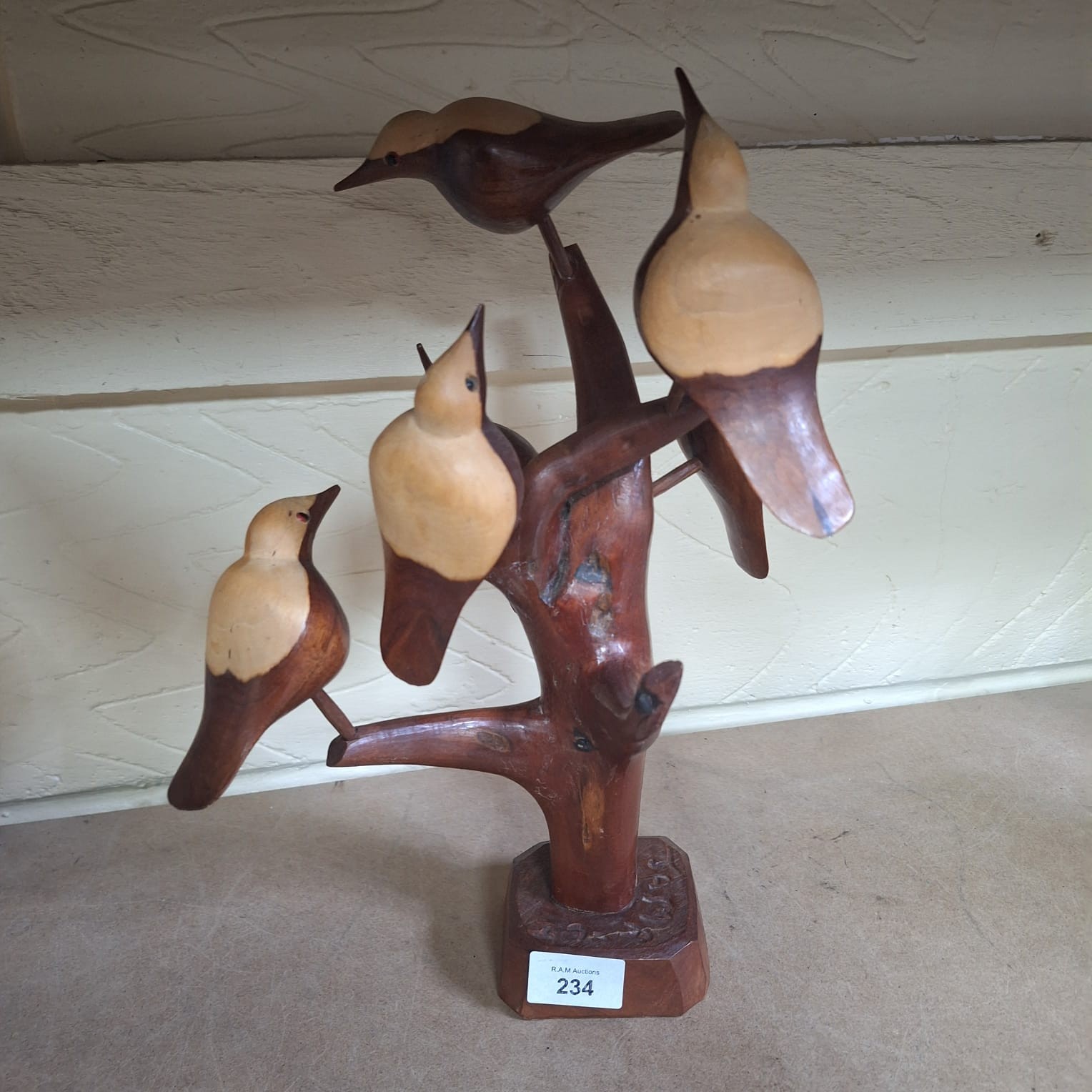 Two-toned wooden sculpture of birds on a tree branch with a rectangular base.