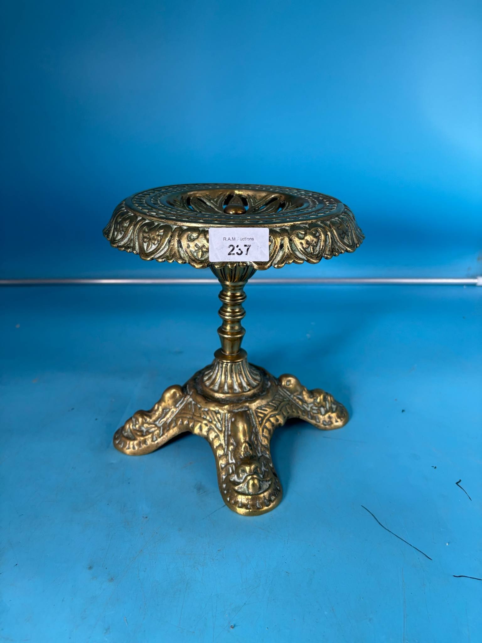 A brass stand with a circular, pierced top and three ornate legs.