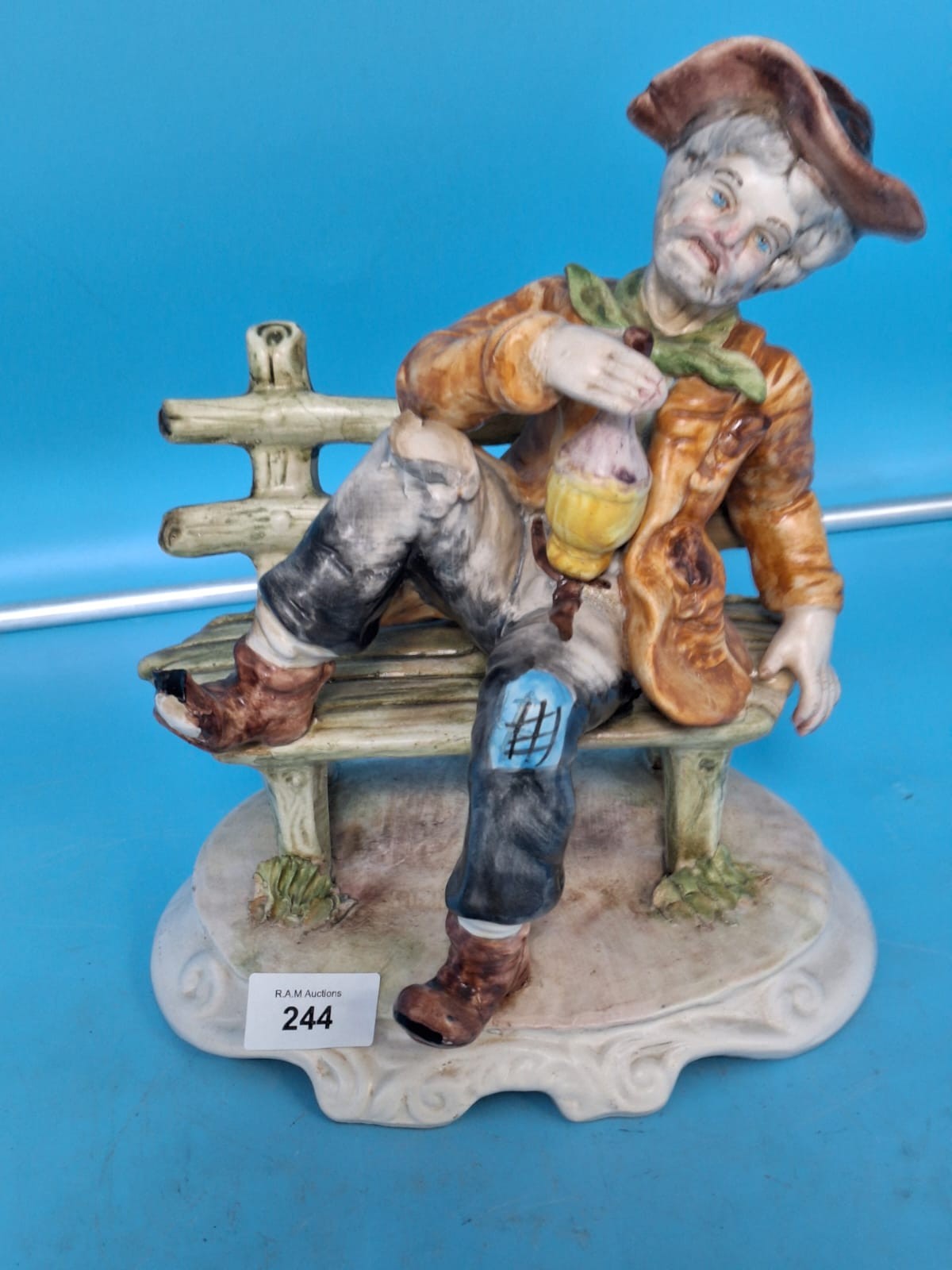 Ceramic figurine of a man with gray hair, wearing a brown hat and jacket, seated on a green bench, holding a small bottle.