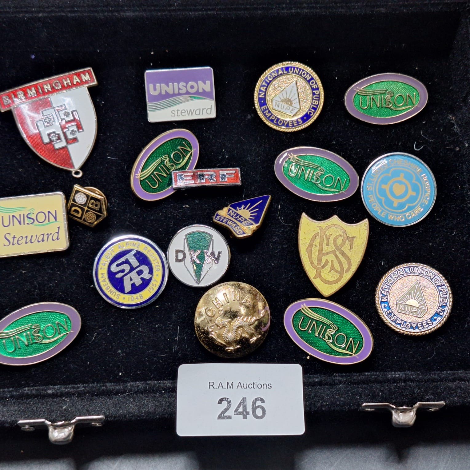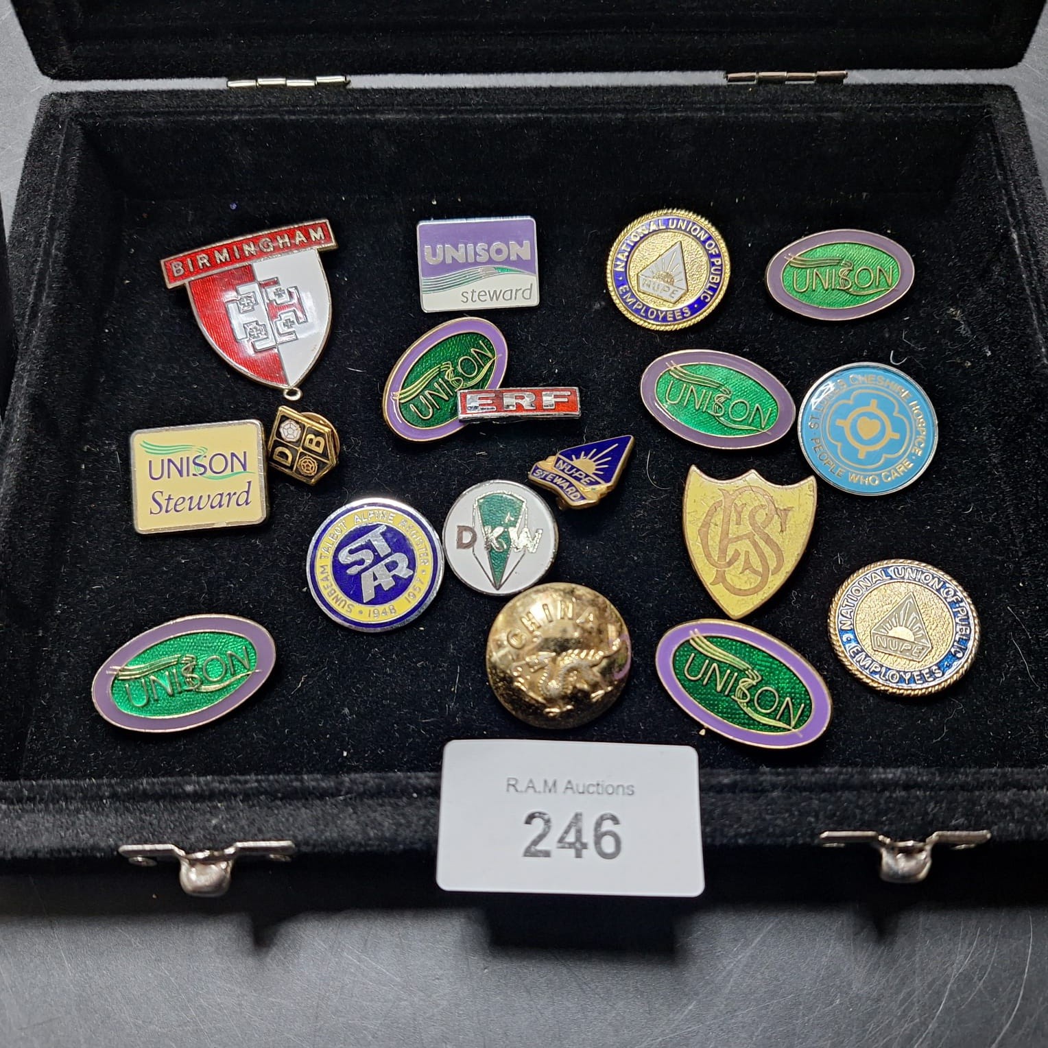Collection of enamel and metal lapel pins and badges with various union and organizational markings.