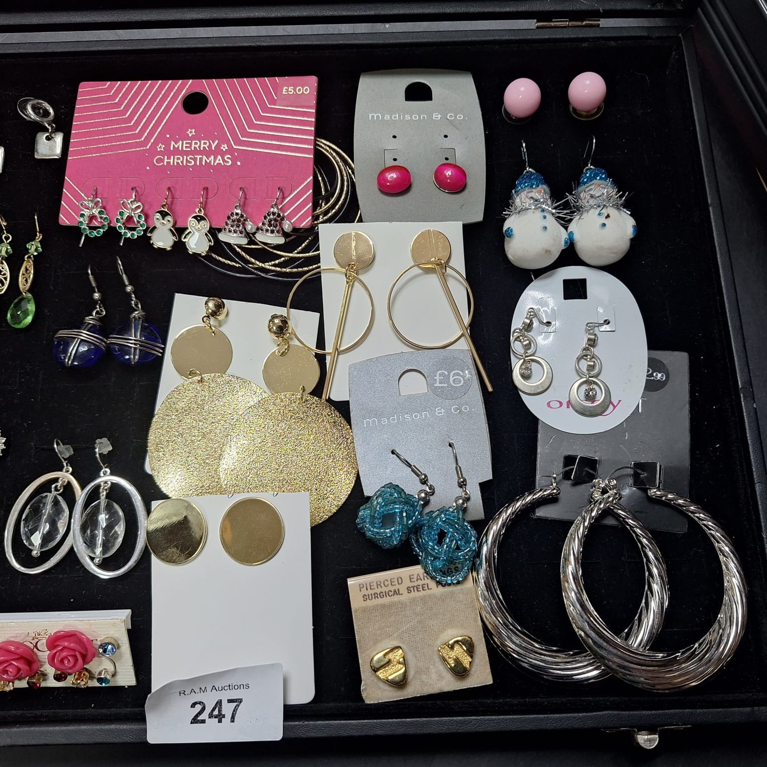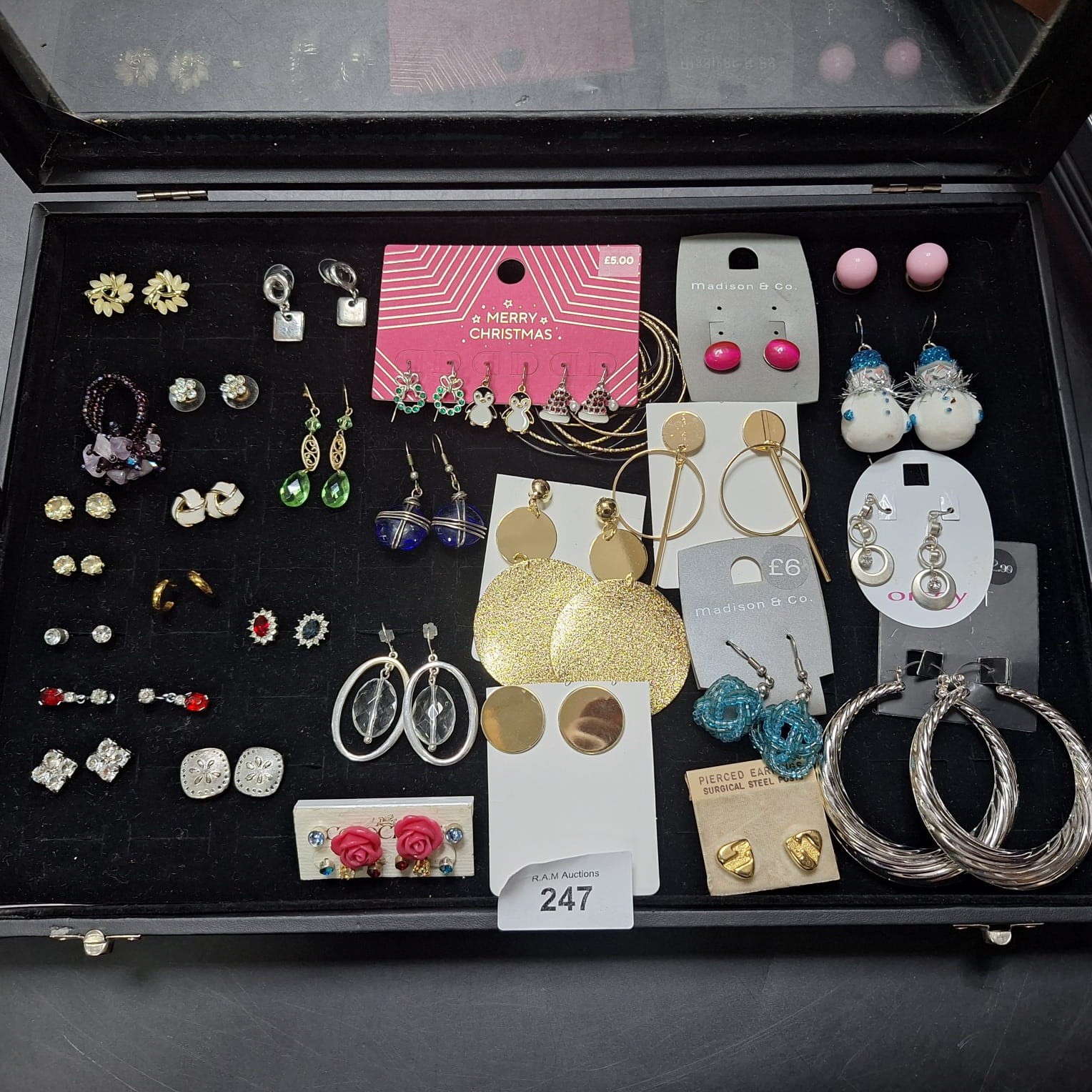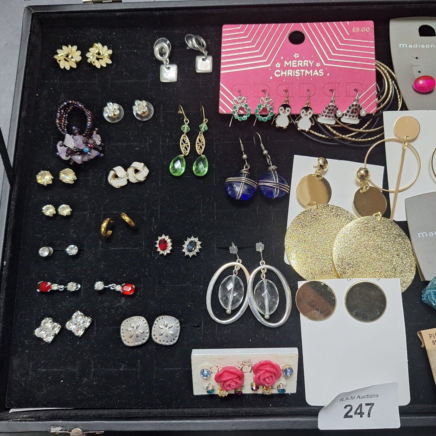 Assorted earrings featuring various materials, styles, and colors, including metal, stones, beads, and fabric. Some earrings are marked “Madison & Co.”