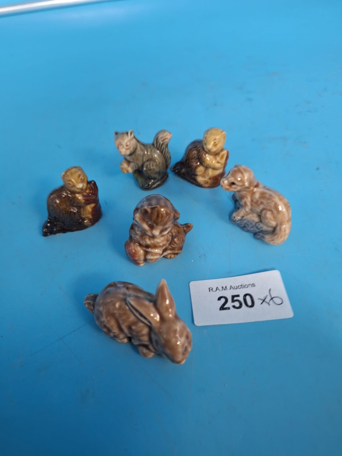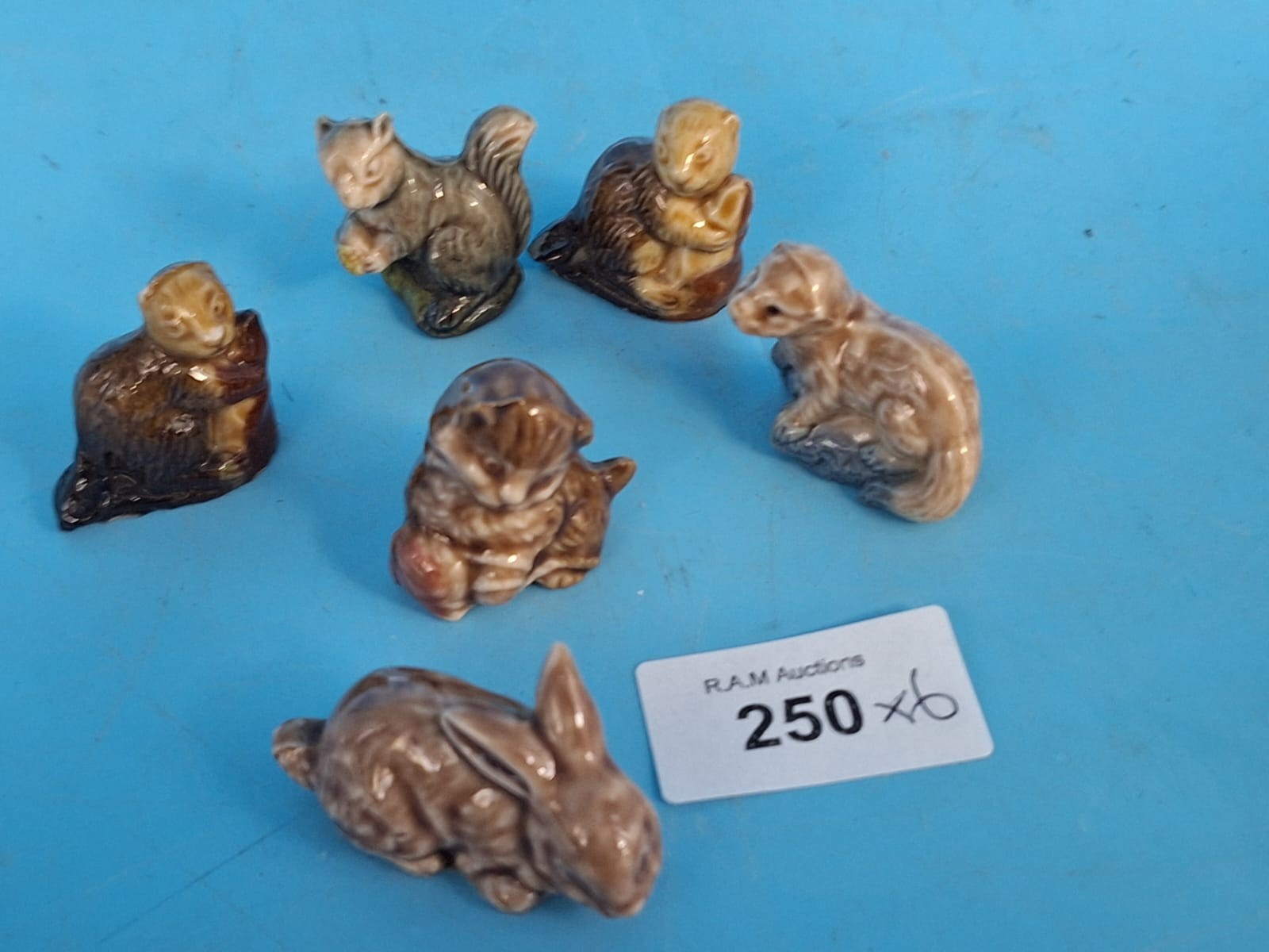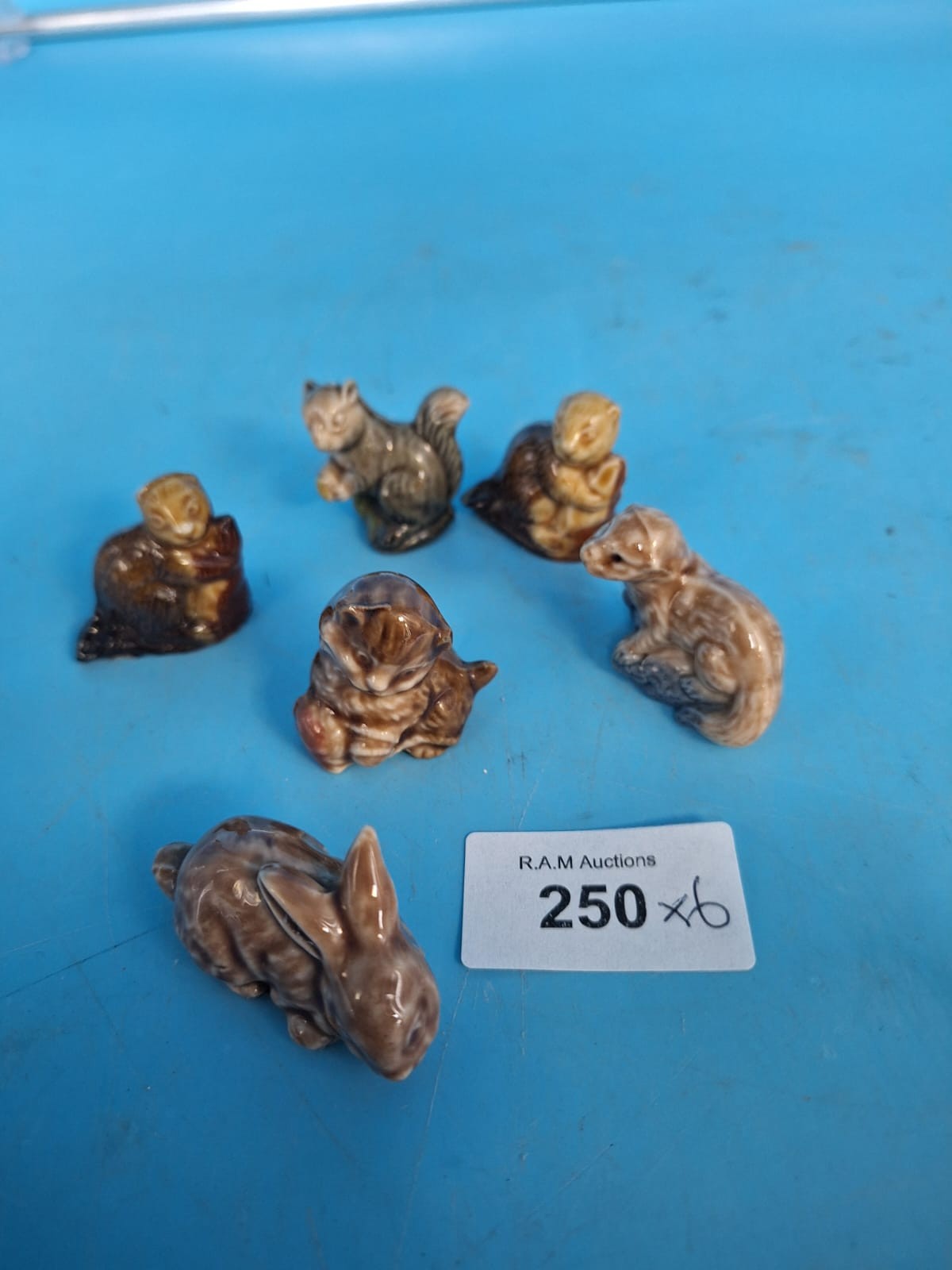 Lot of six small ceramic animal figurines depicting a squirrel, stoat, cat, rabbit, and two other small mammals, with detailed fur-like shading.