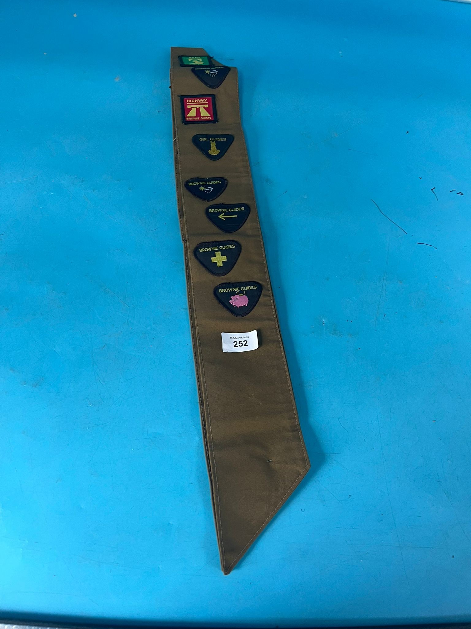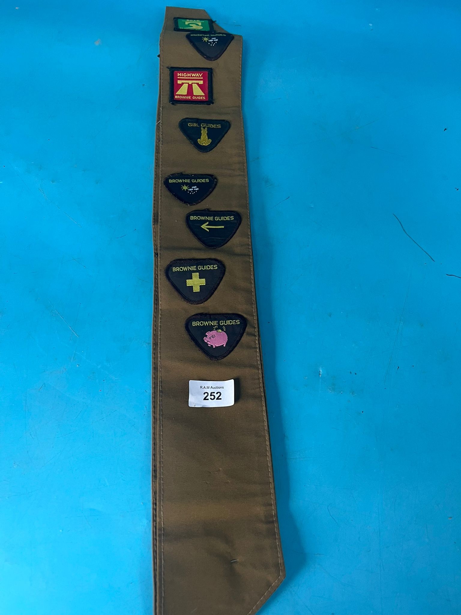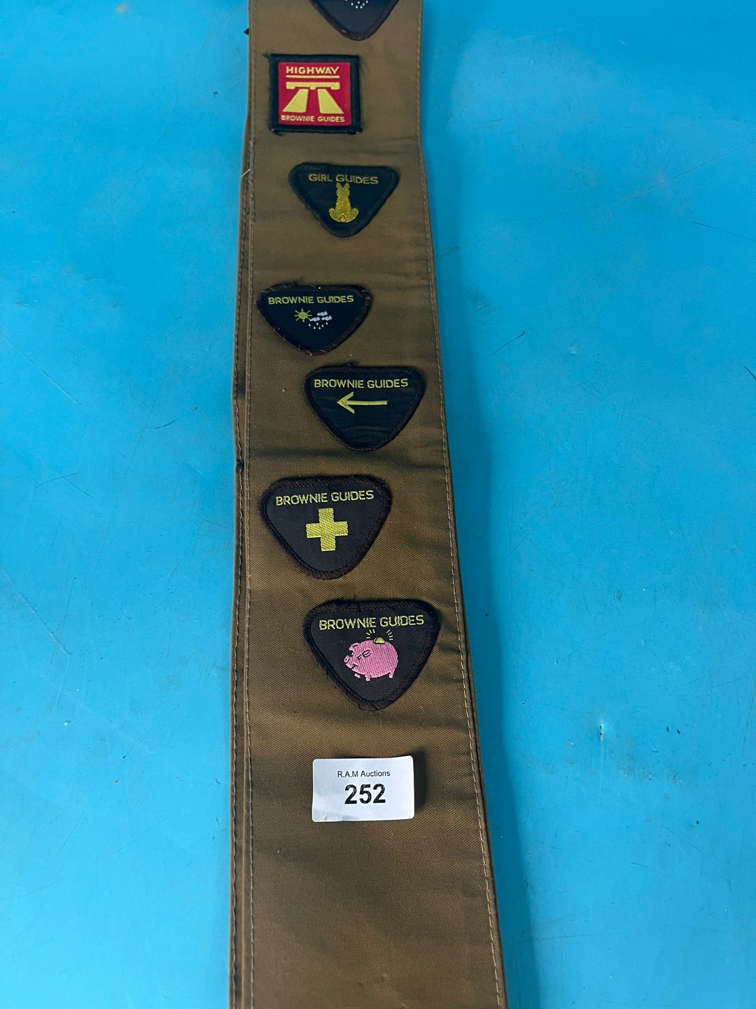 A tan fabric sash with embroidered Brownie and Girl Guides achievement patches.