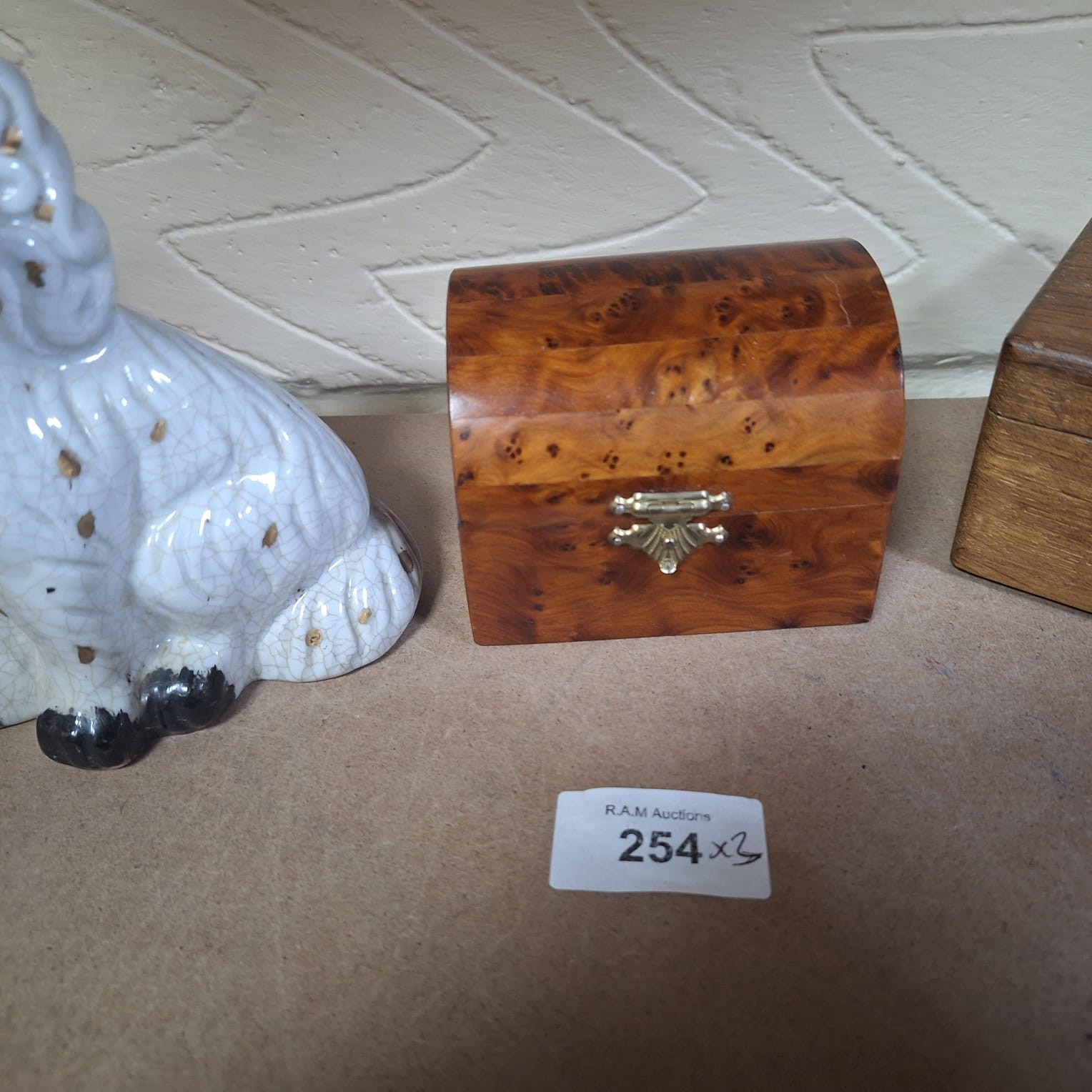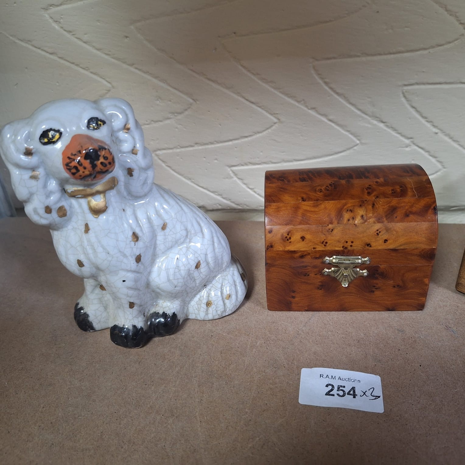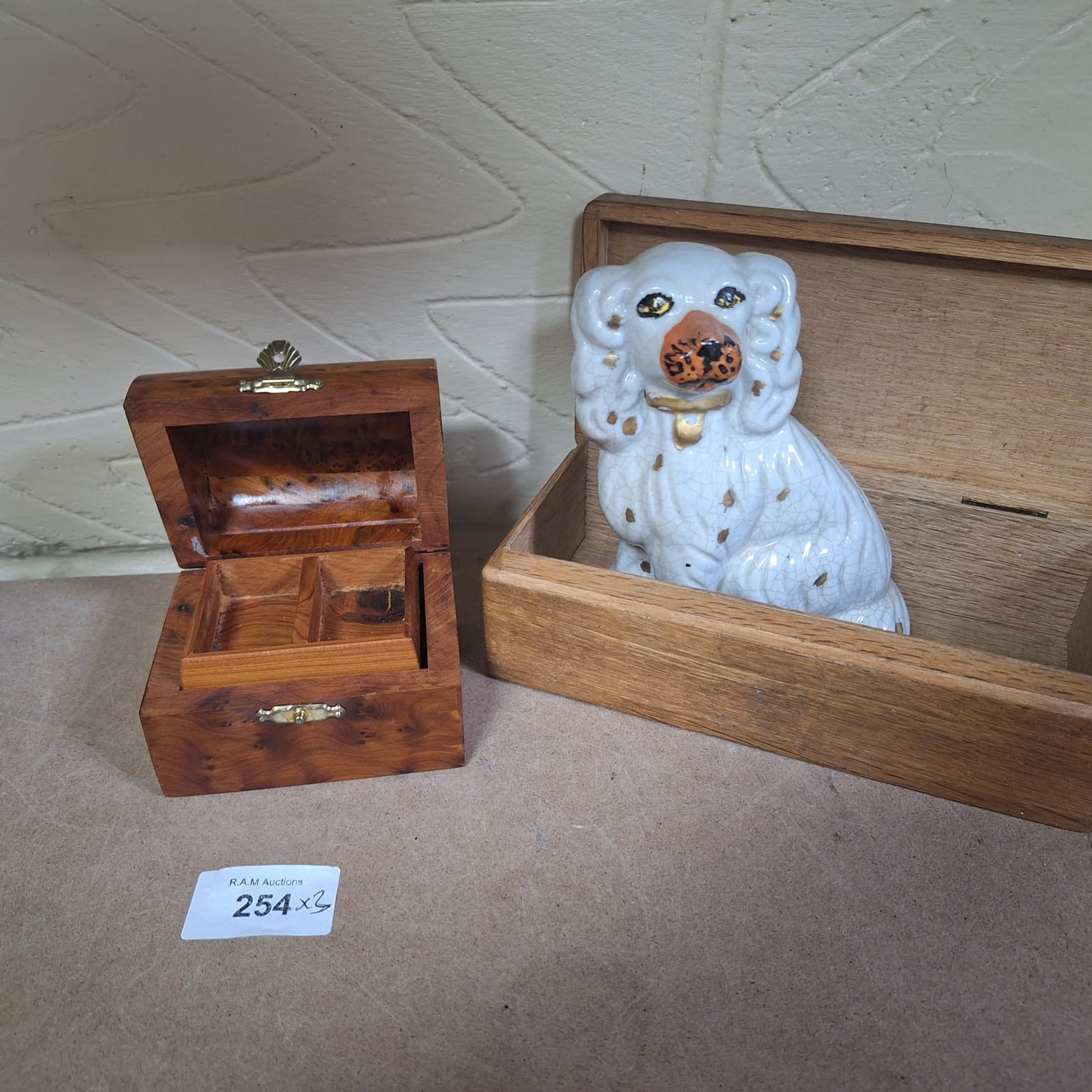 A wooden box with a hinged lid containing a ceramic dog figurine.