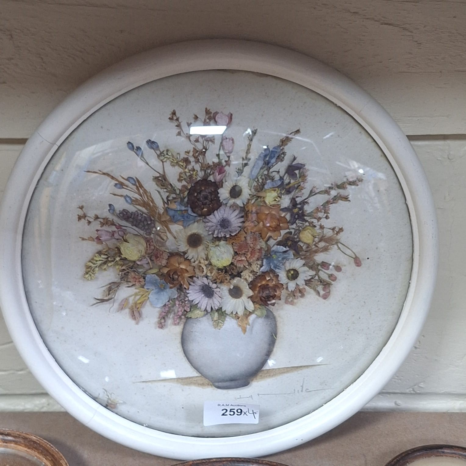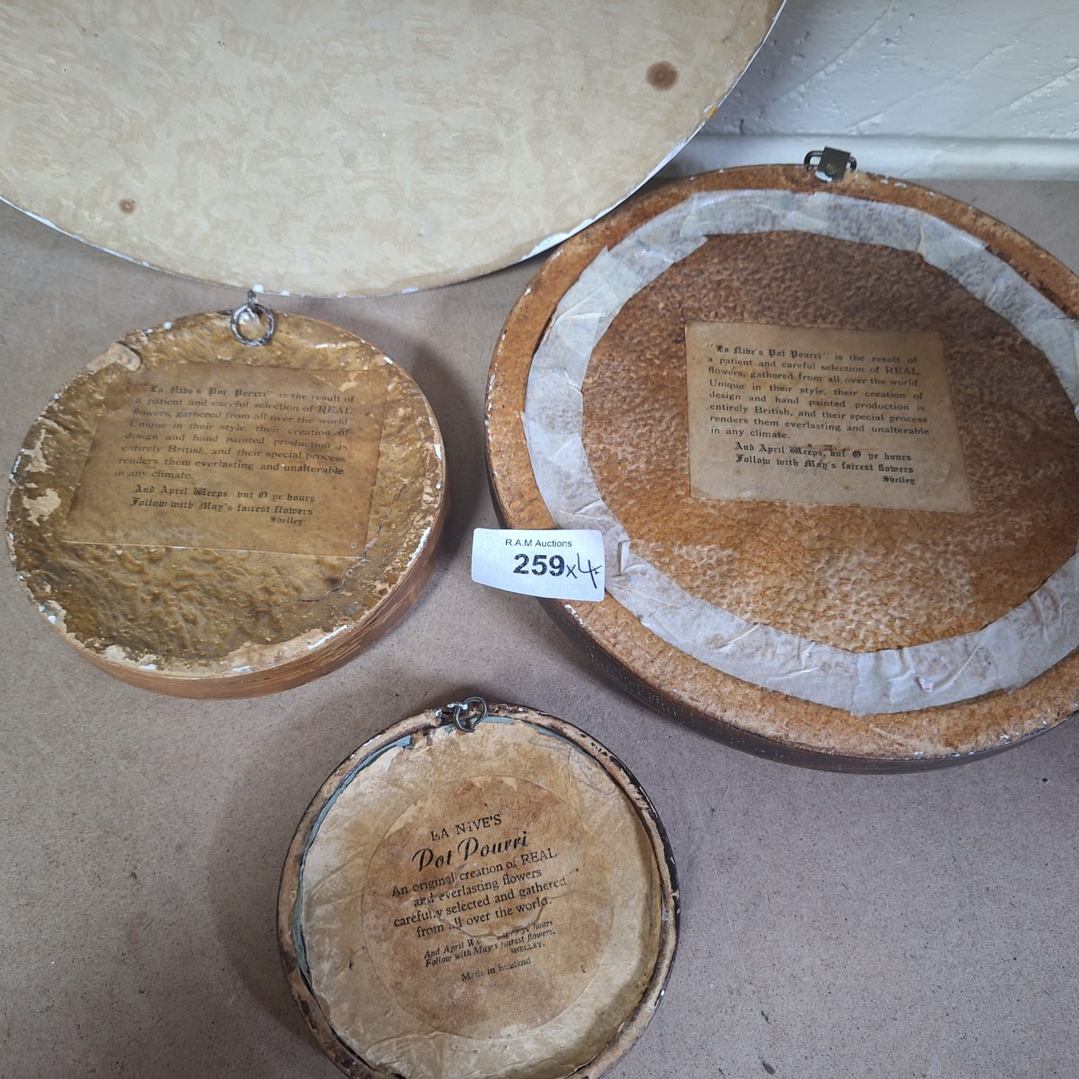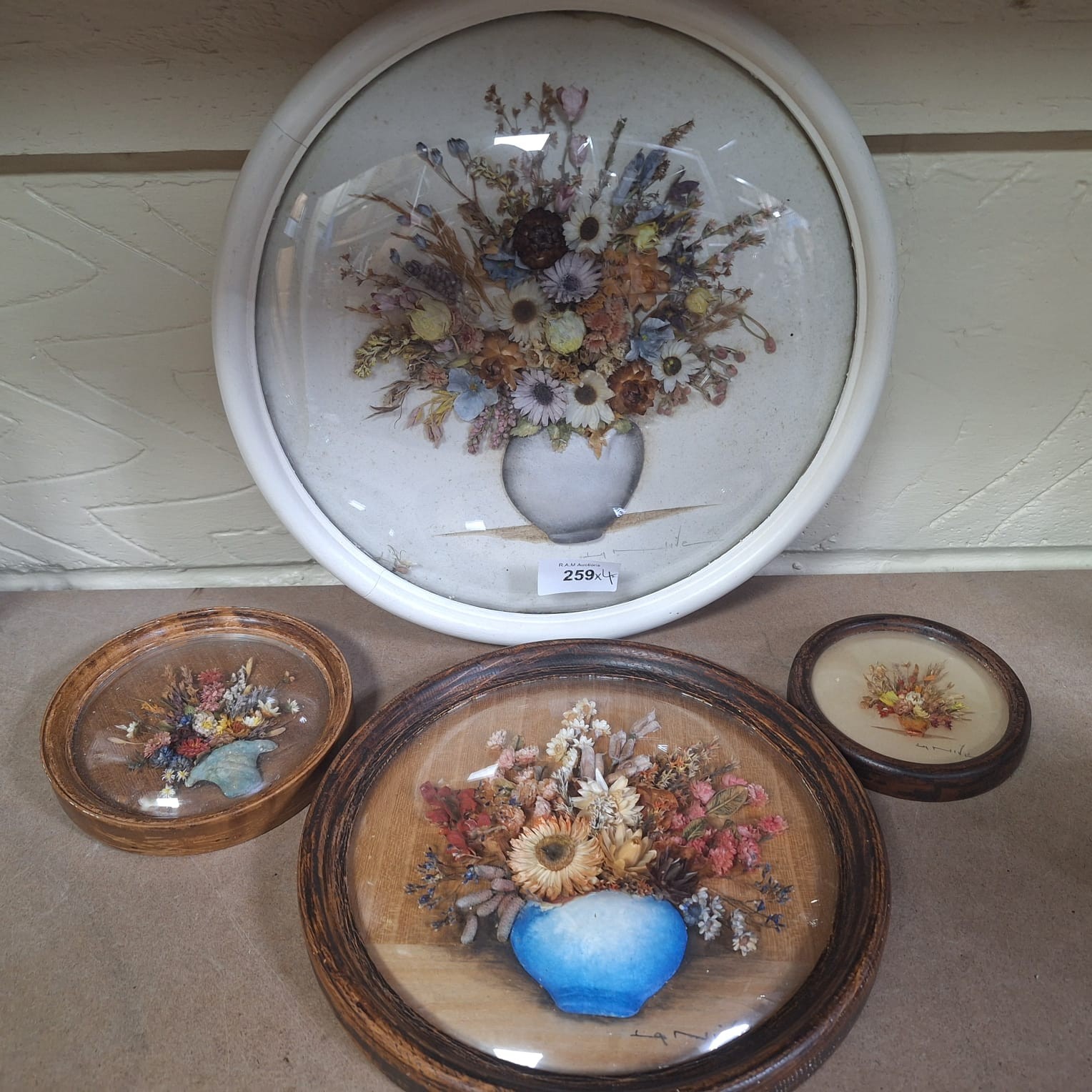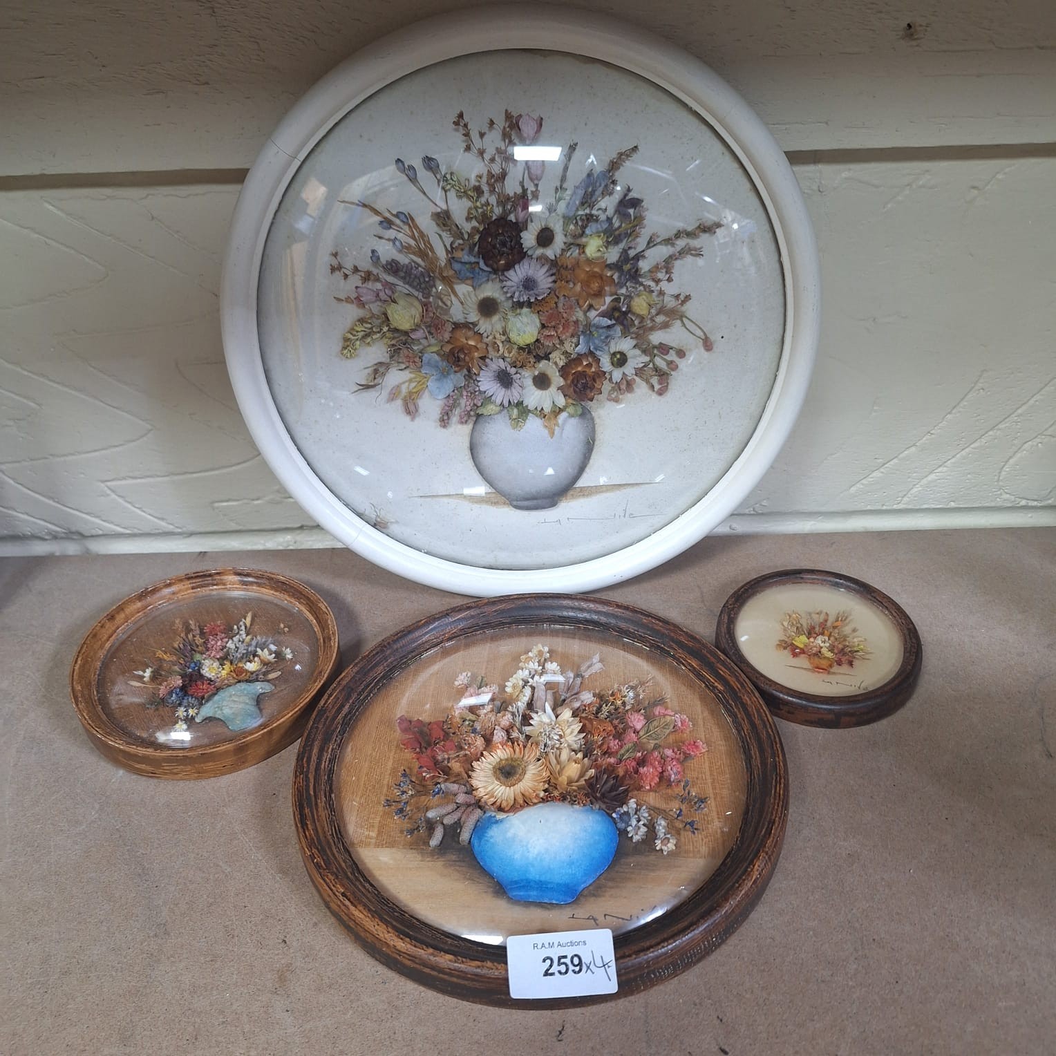 Lot of three framed pressed flower arrangements featuring bouquets in vases on beige backgrounds, with illegible signatures and “LA NIVE’S Dot Pourri” labels.