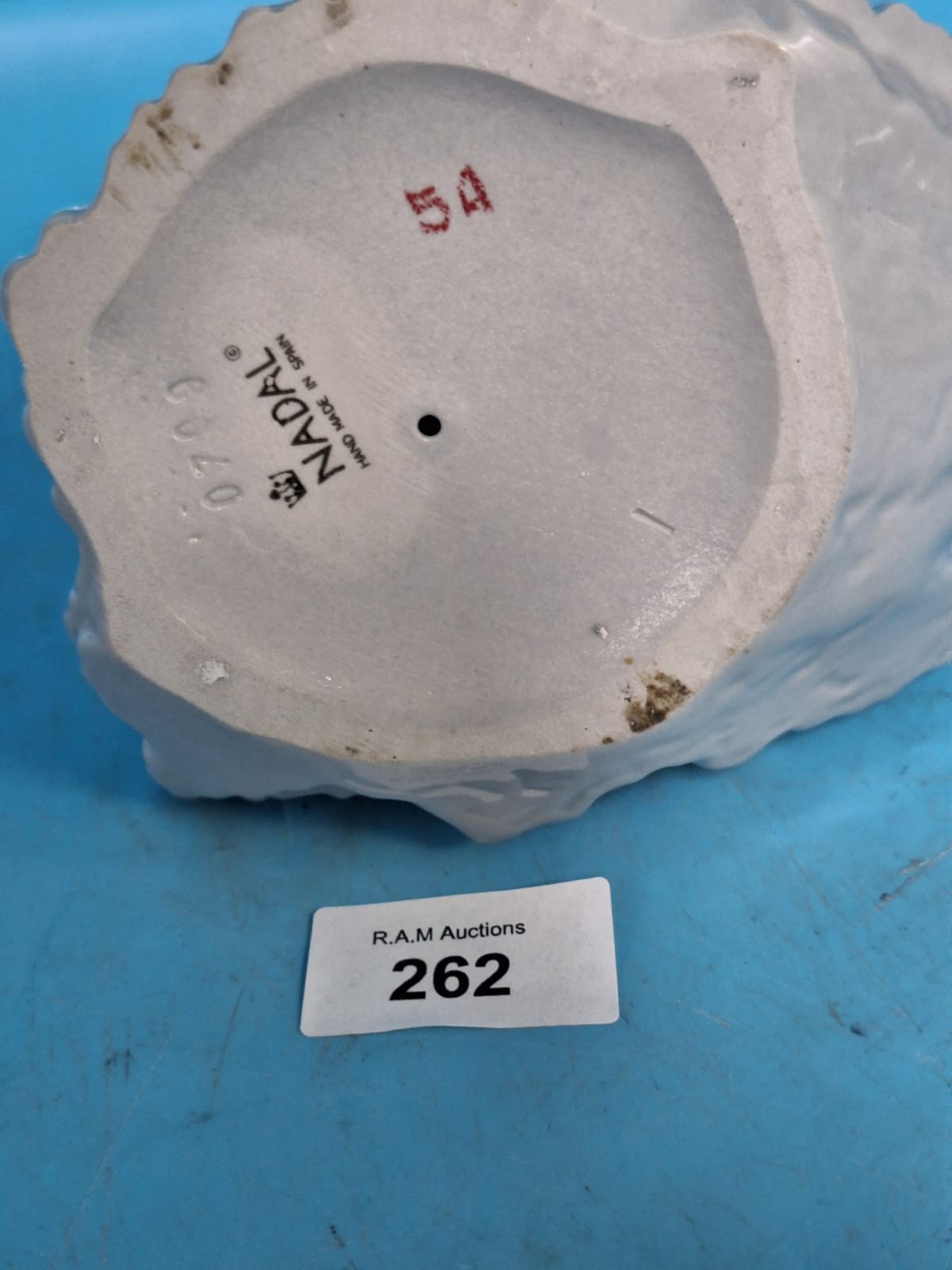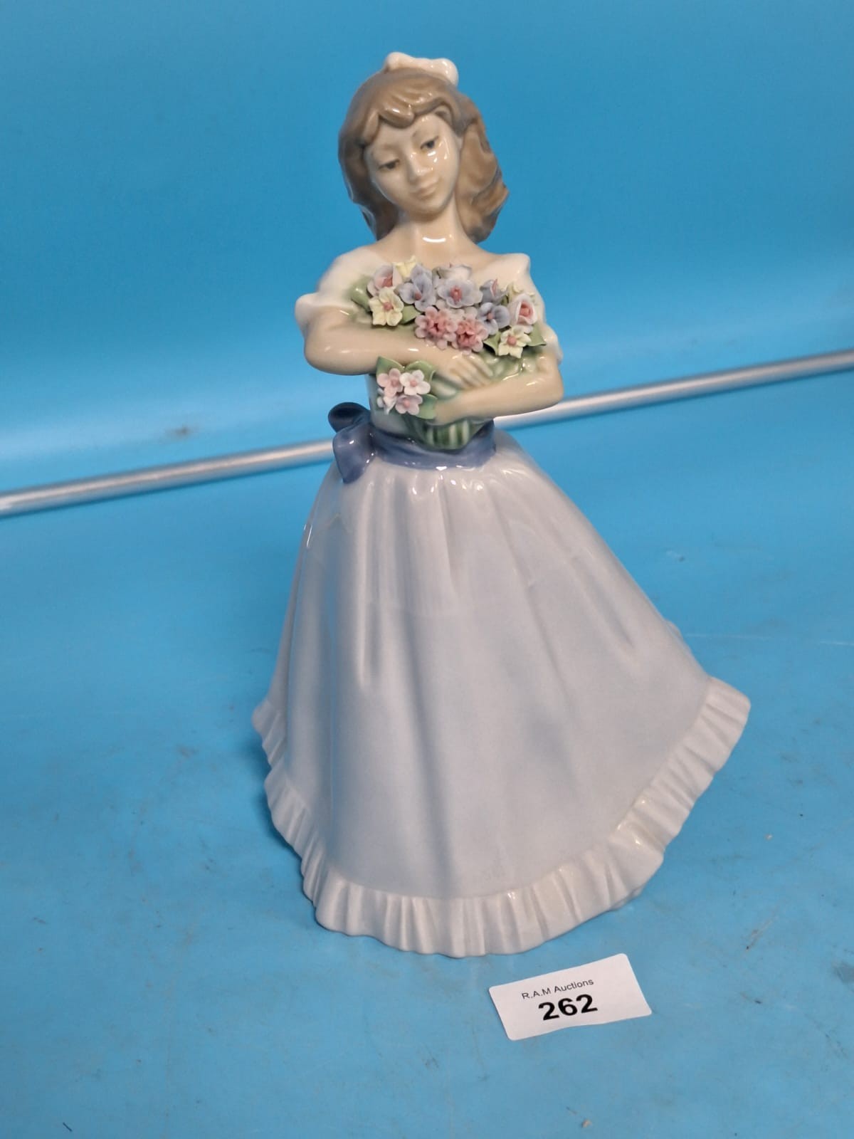 Nadal porcelain figurine of a girl in a lavender dress holding a bouquet of flowers, hand-made in Spain.
