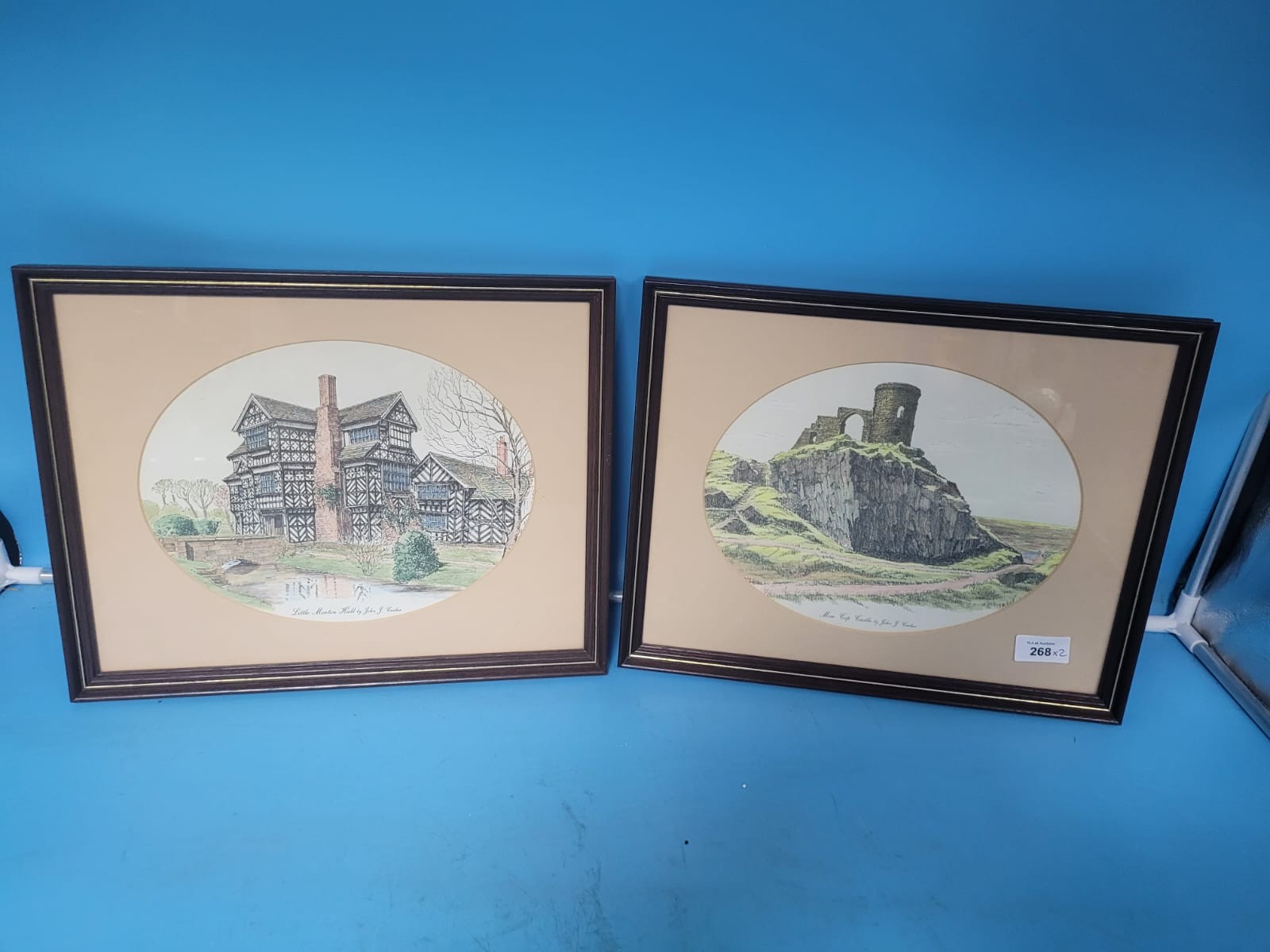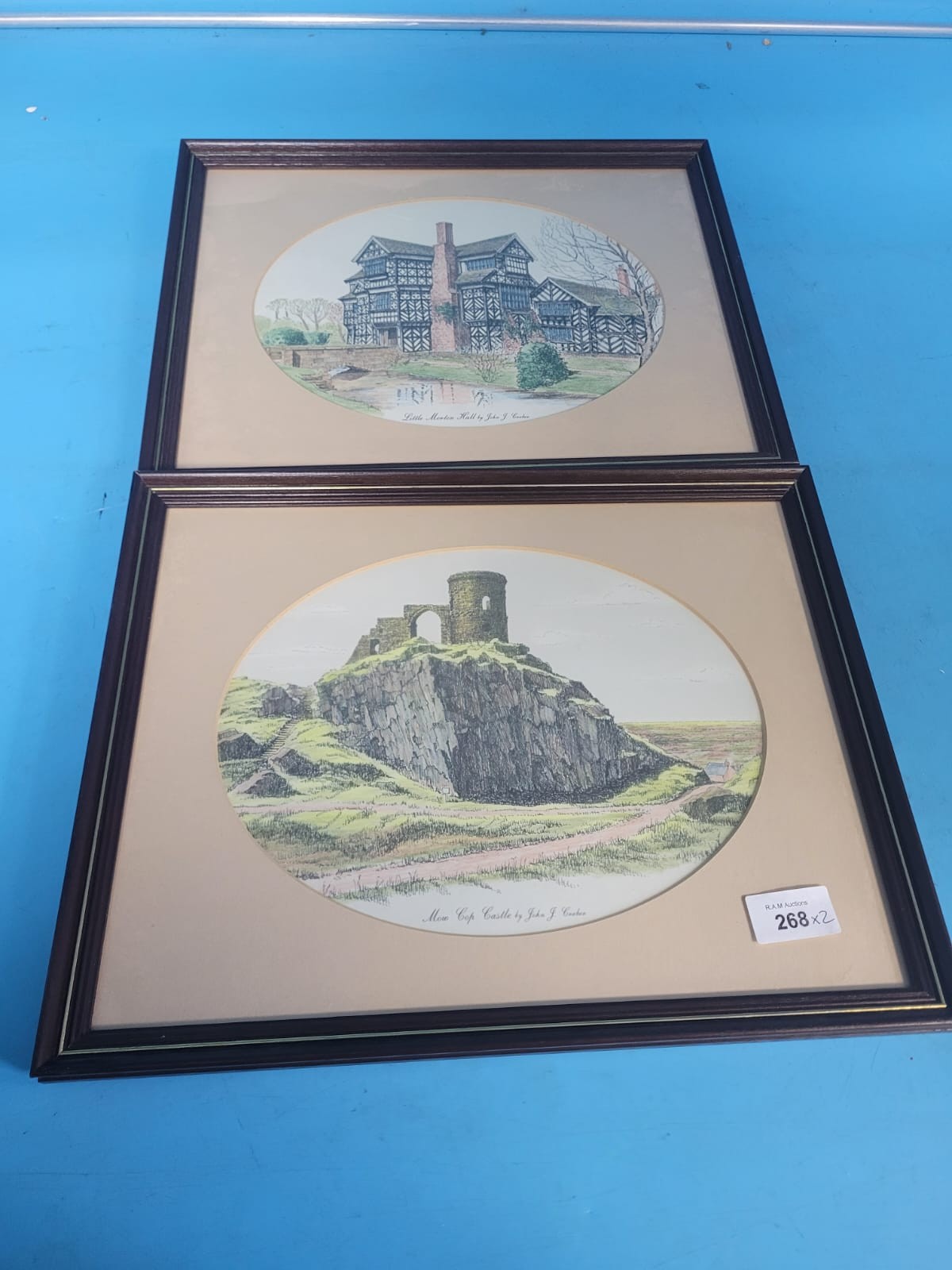 Oval prints of Speke Hall and Moel y Golfa Castle in wooden frames.