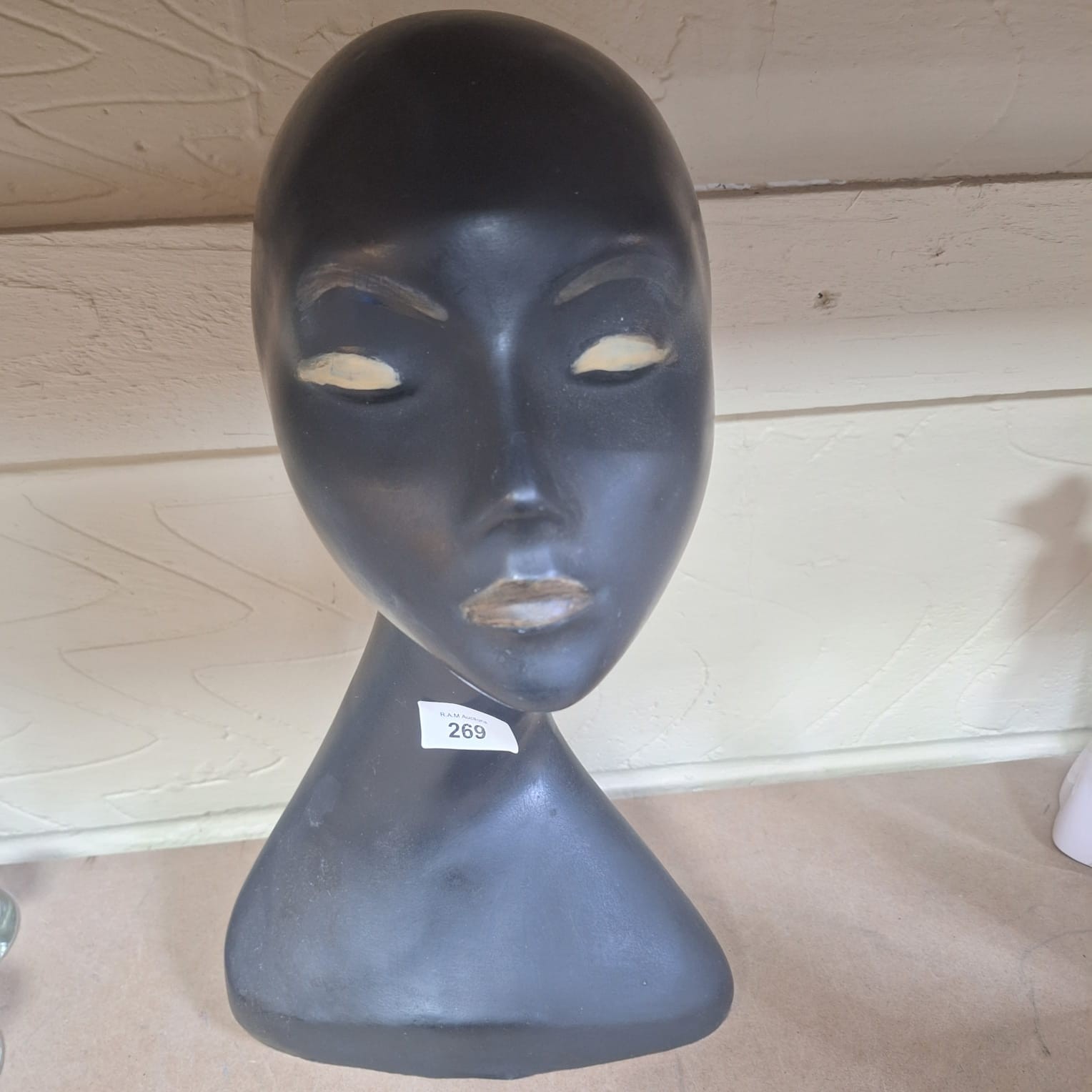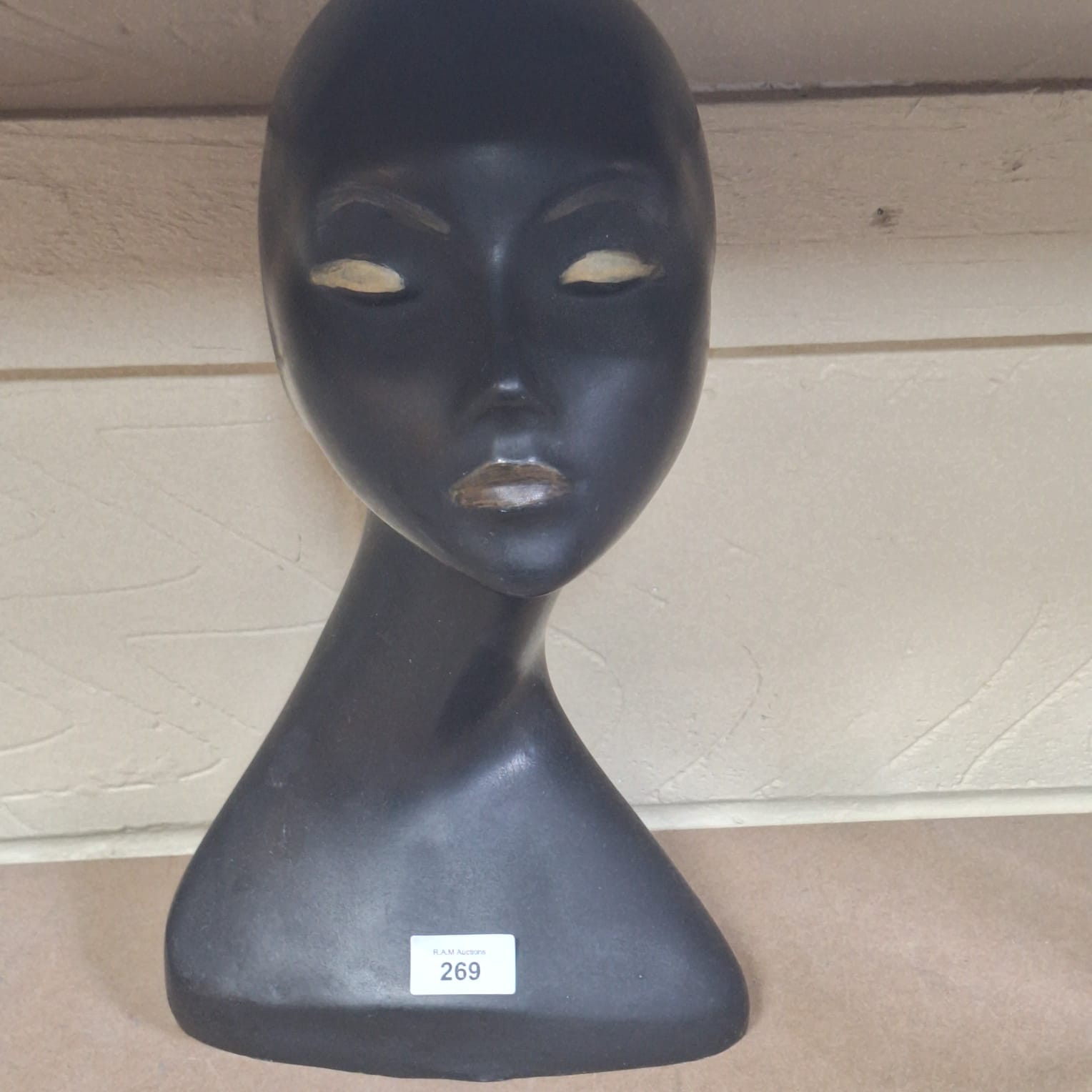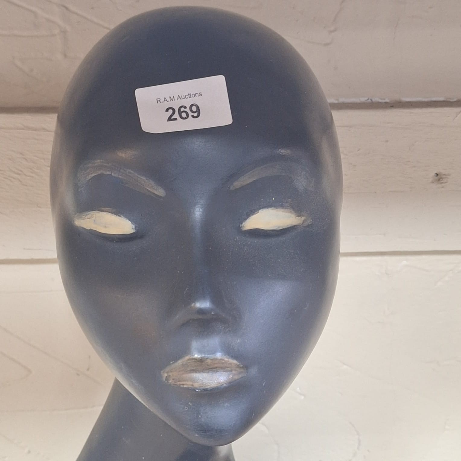 Dark gray matte finish mannequin head and neck with stylized female features and minor discoloration.