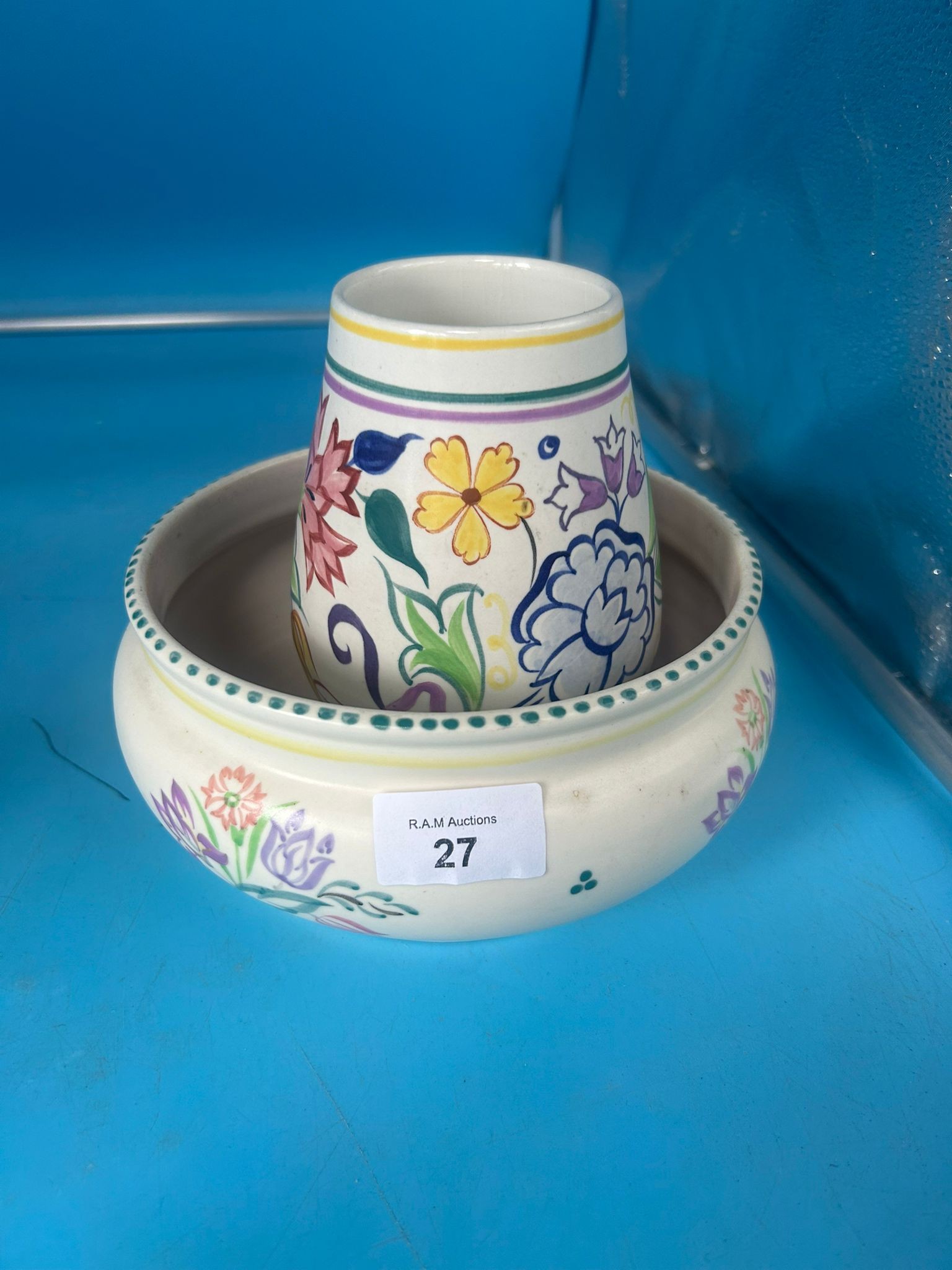Off-white ceramic bowl and cup with a multicolored floral pattern and green trim.