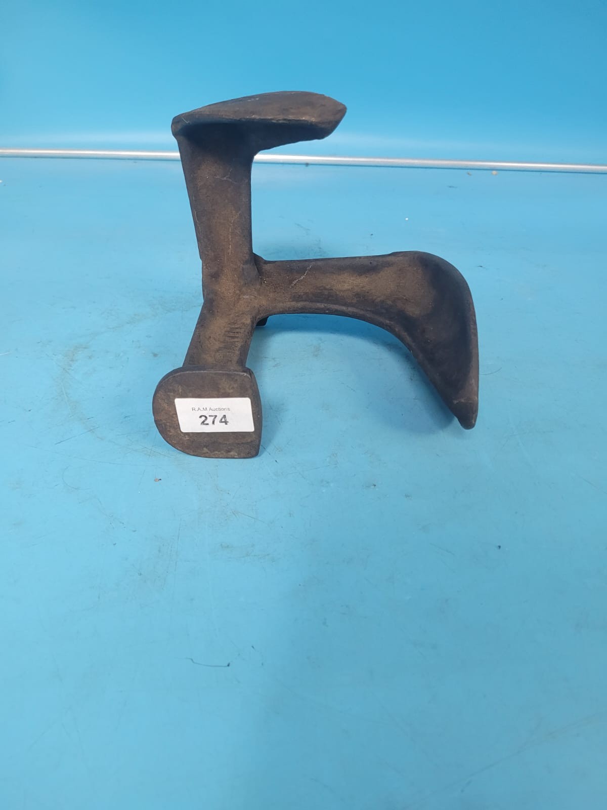 A dark gray/brown cast iron shoemaker’s last with a flat base and upright horn, showing signs of age and use.