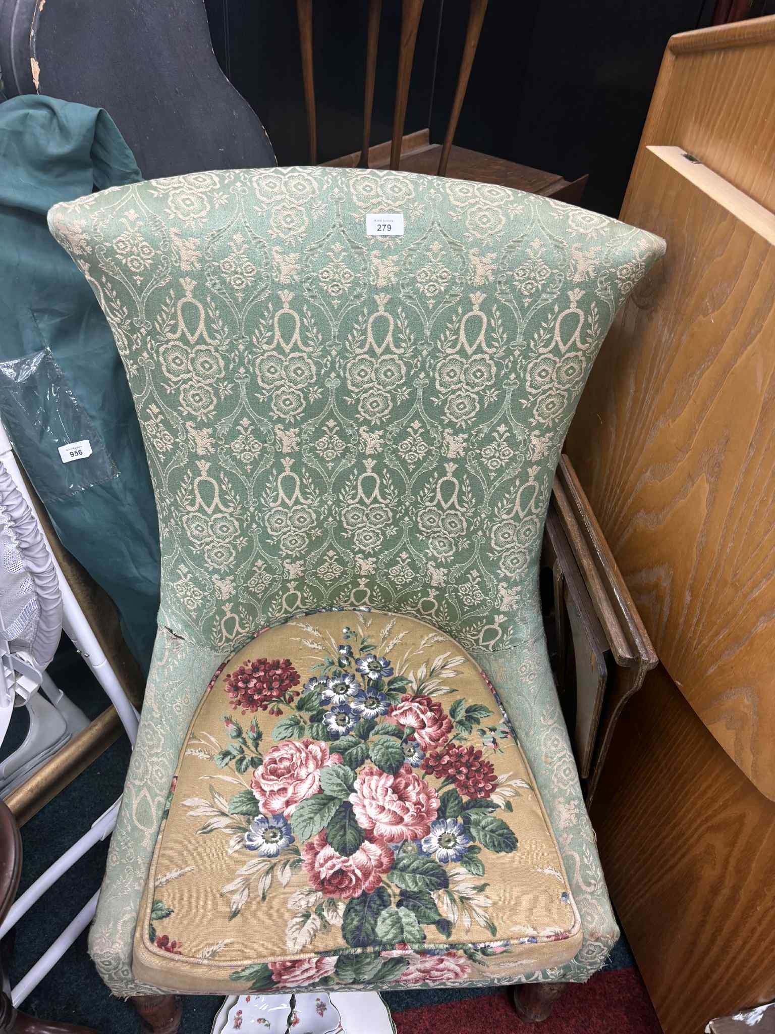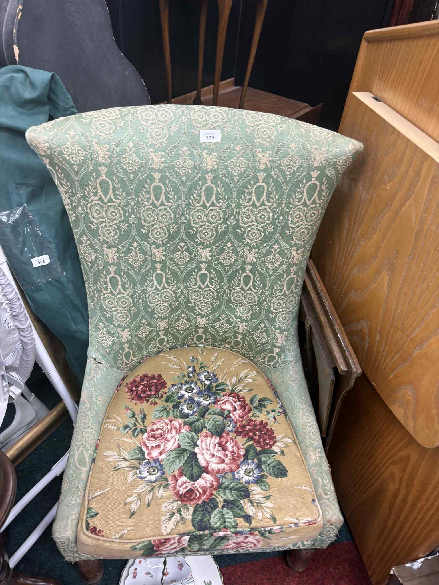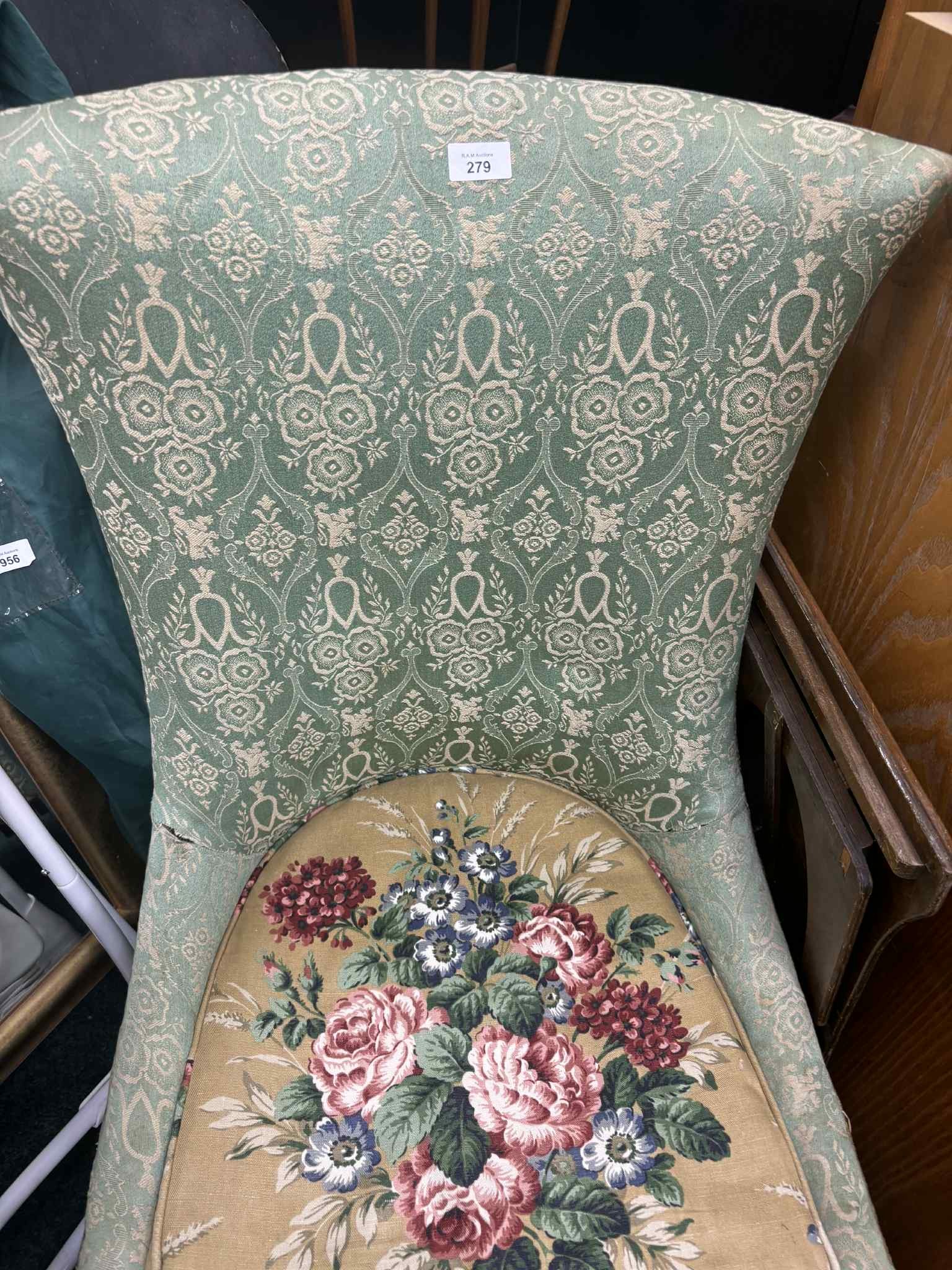 Upholstered high-back chair with teal damask fabric and floral printed seat.
