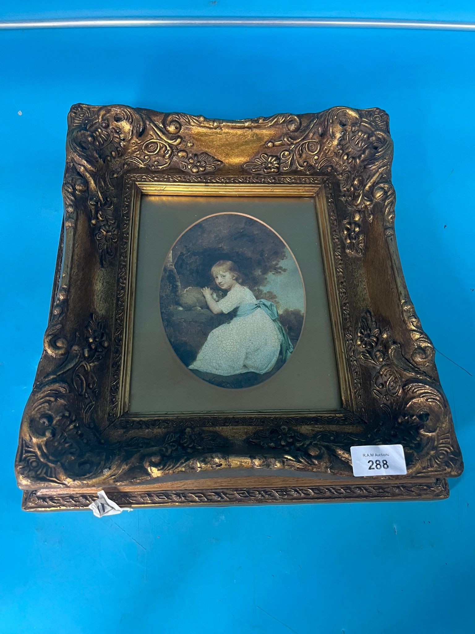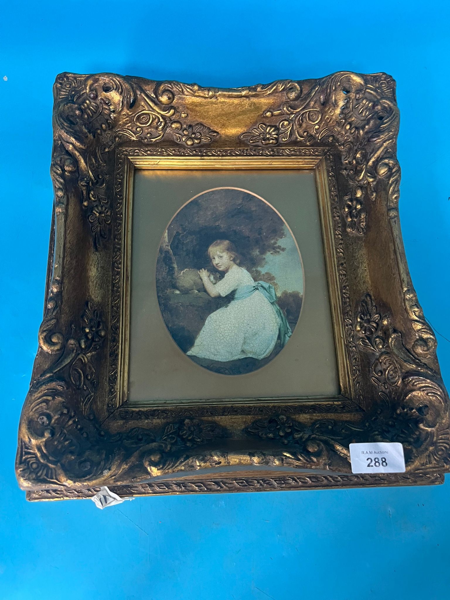 Ornate gold-colored rococo frame with a print of a young girl seated outdoors.