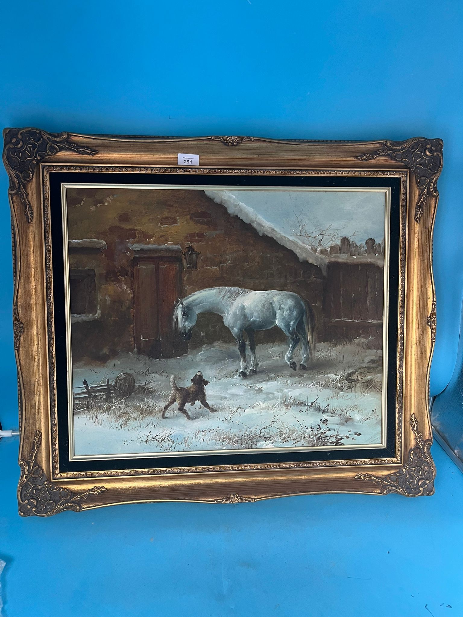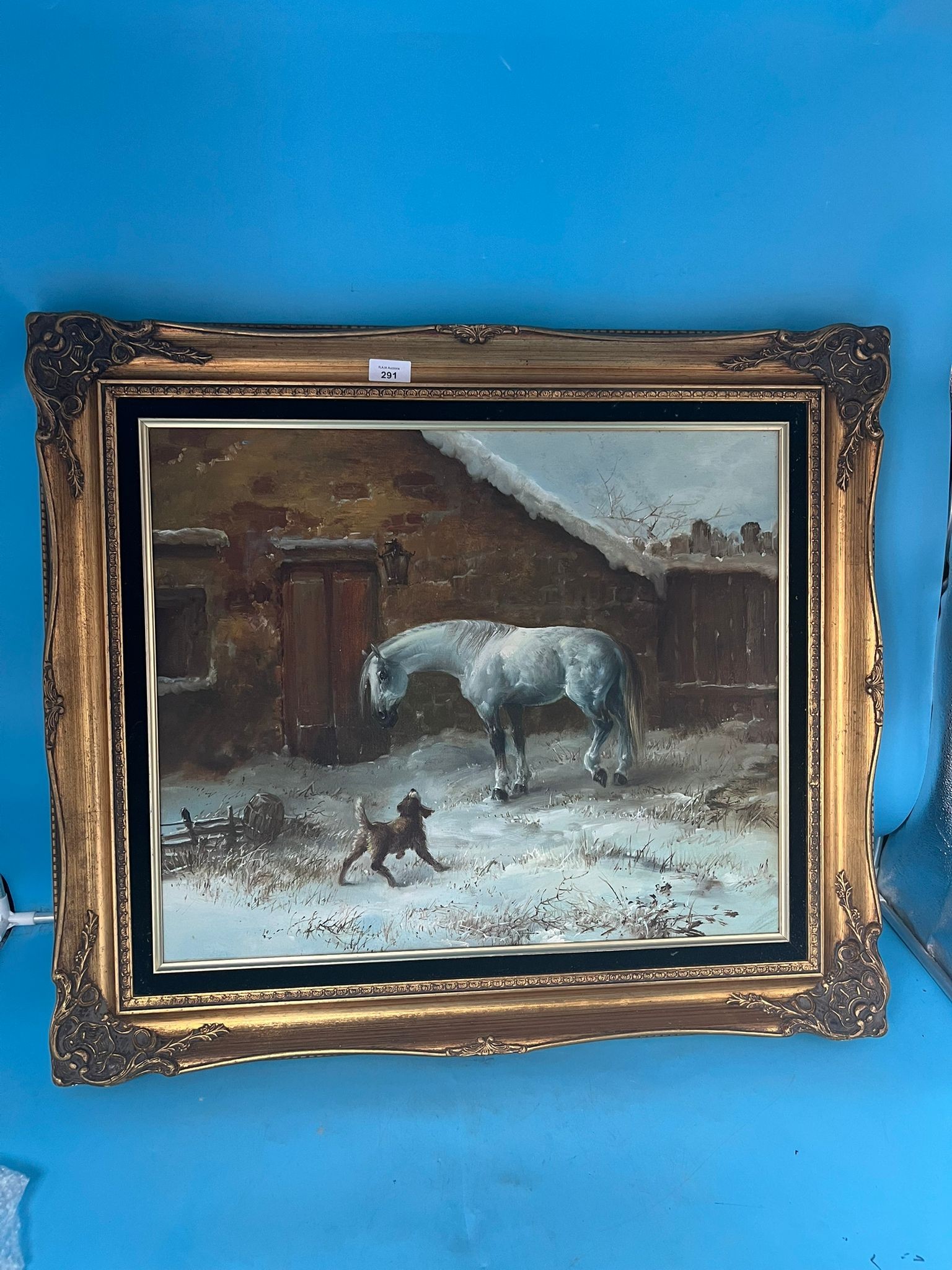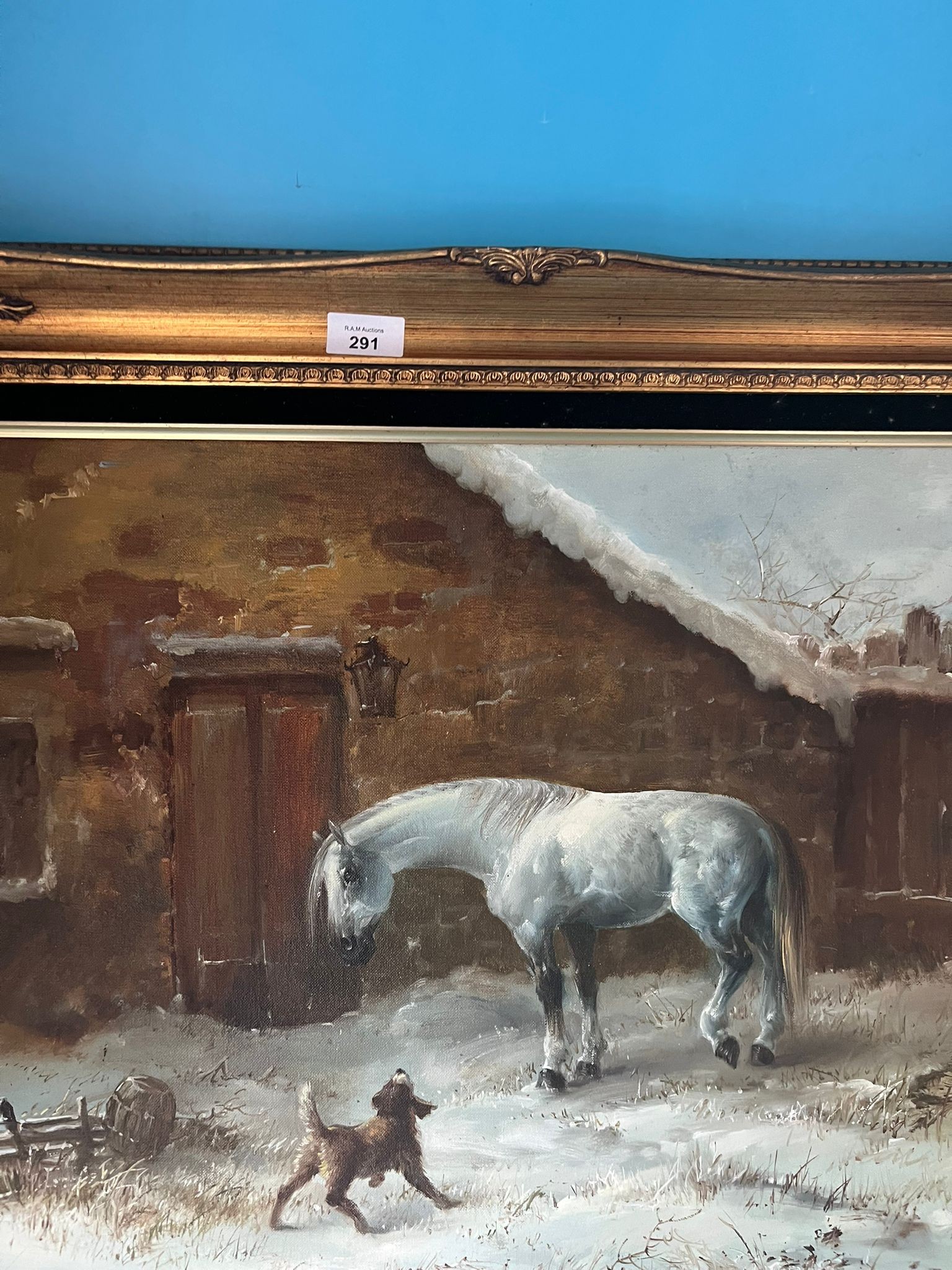 Framed painting of a grey horse and dark dog in a snowy scene with a stone building.
