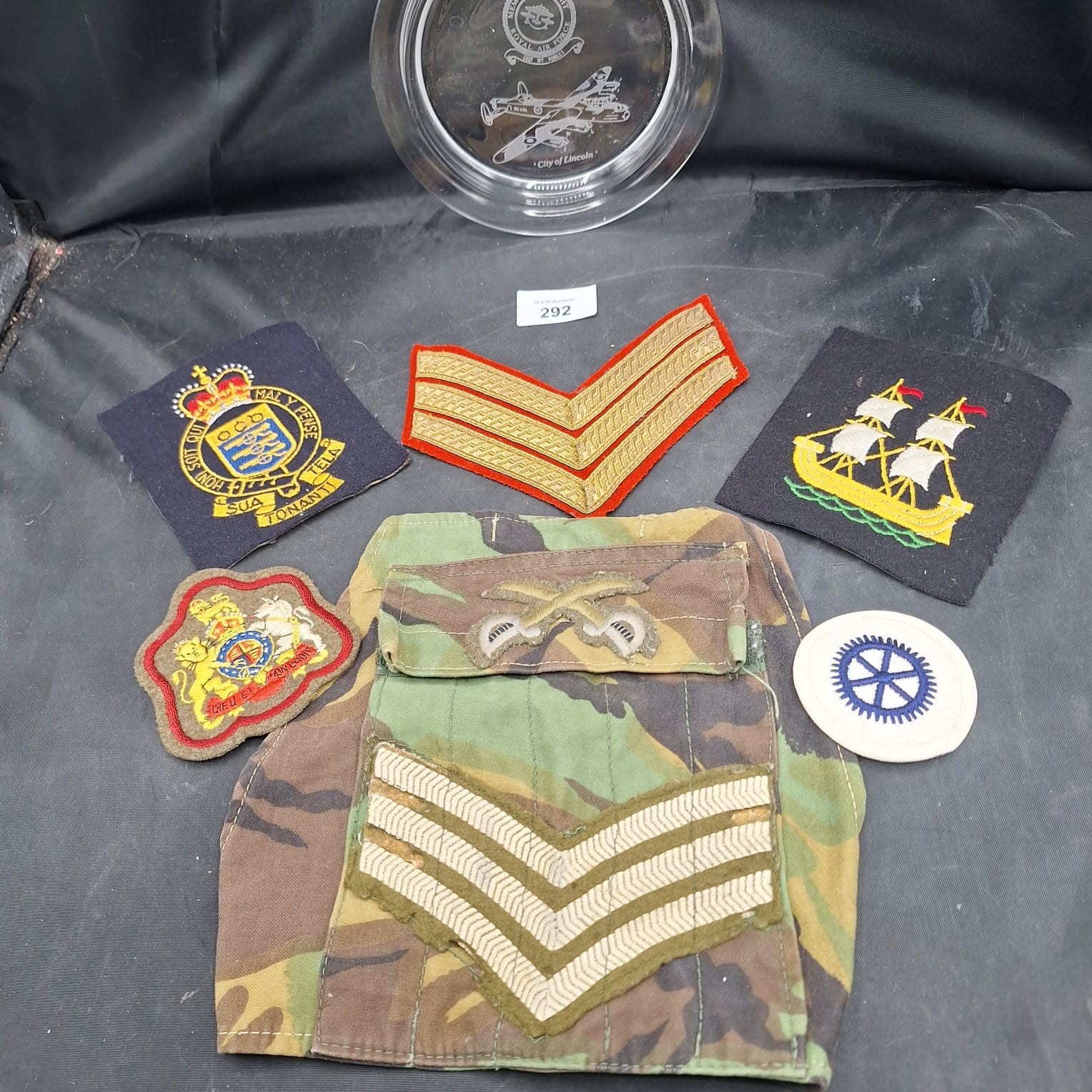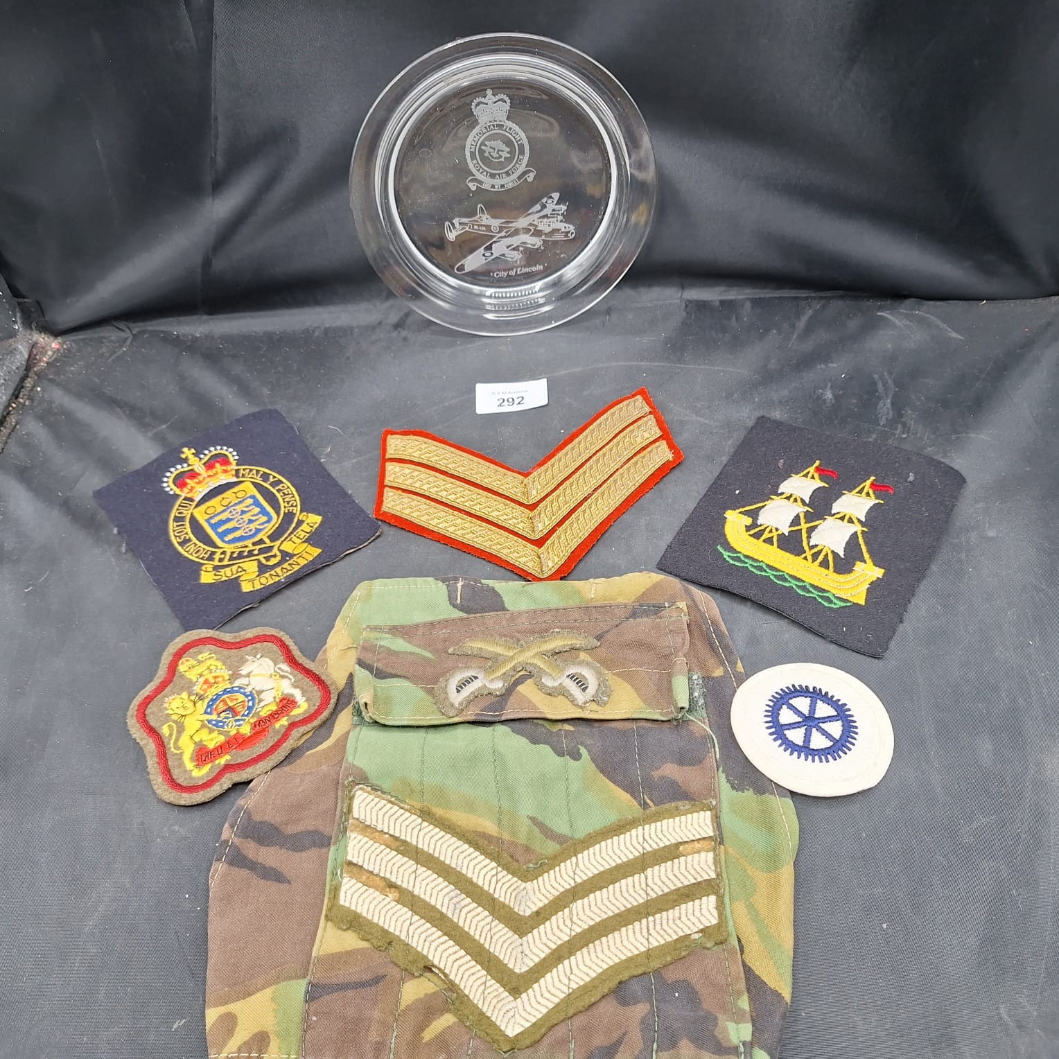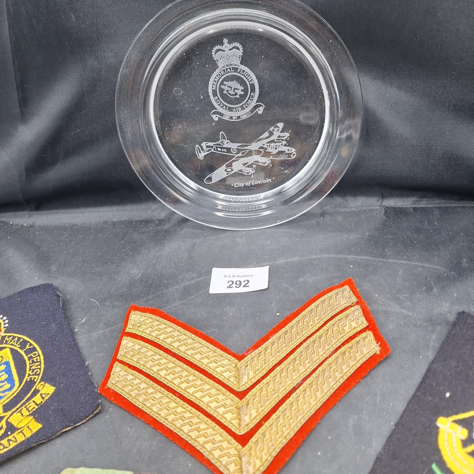A collection of Royal Air Force and aviation-themed embroidered patches and a commemorative glass dish.