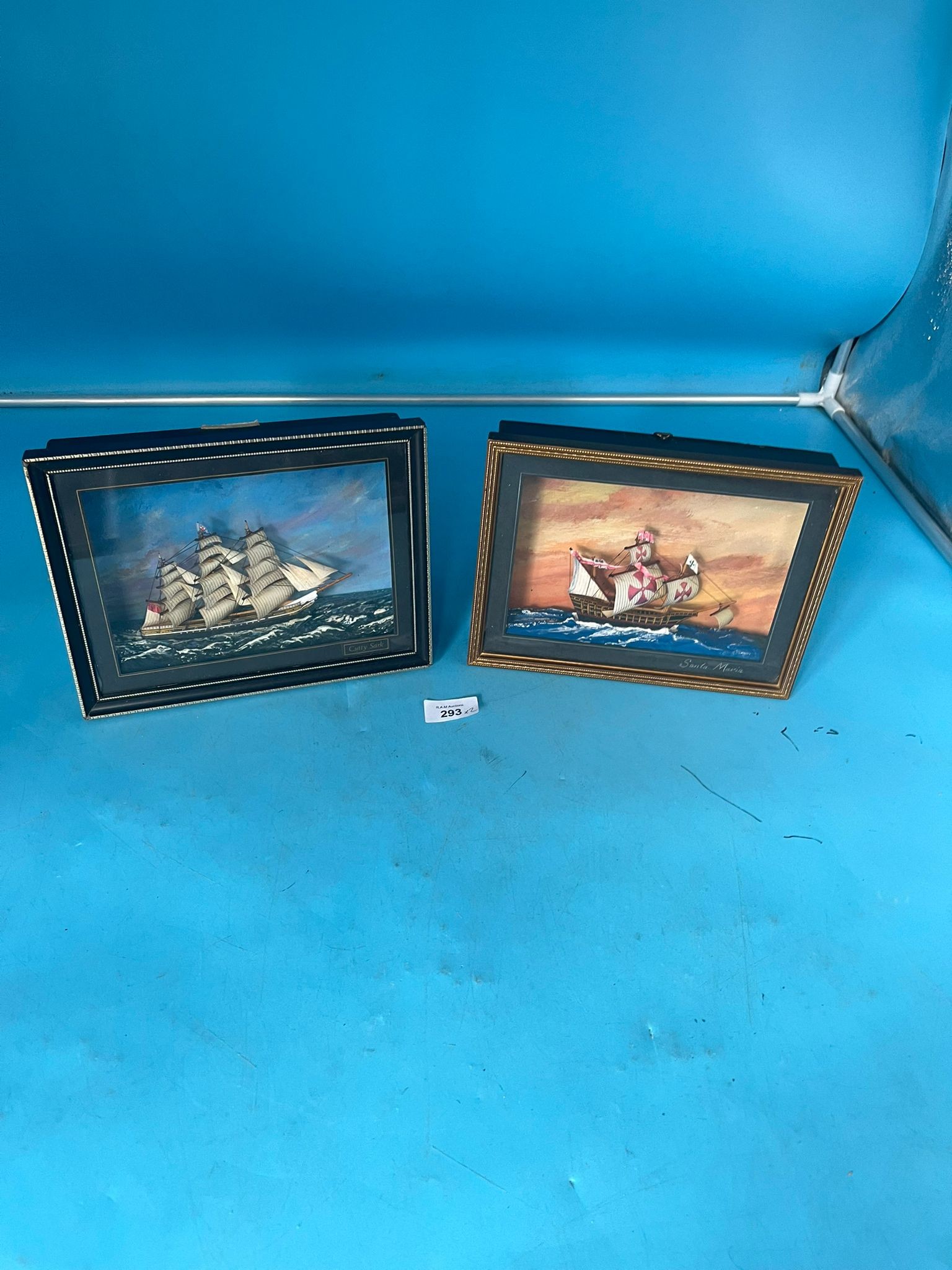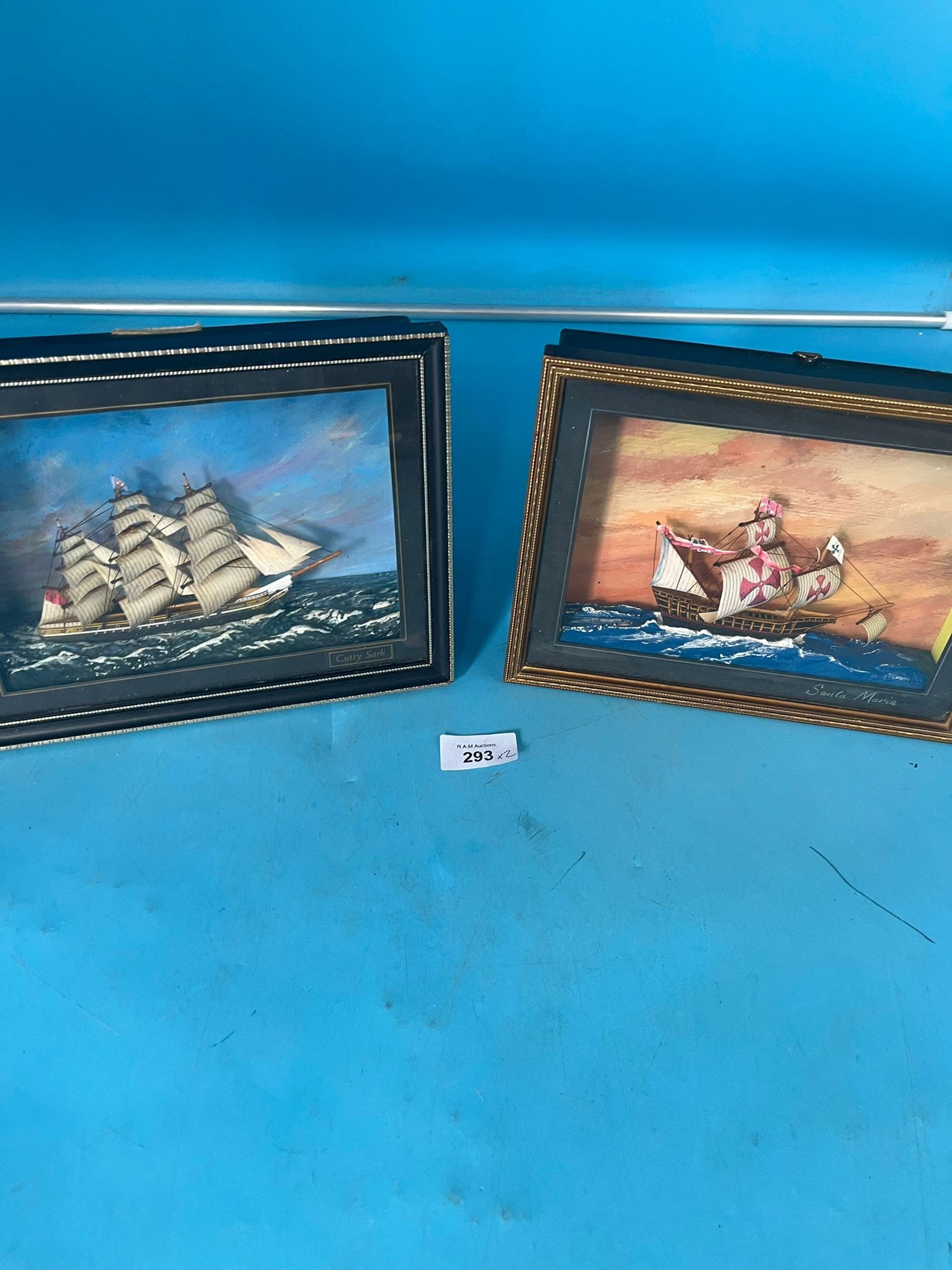 Lot of two framed, three-dimensional ship depictions, “Cutty Sark” and “Santa Maria,” rendered in relief.