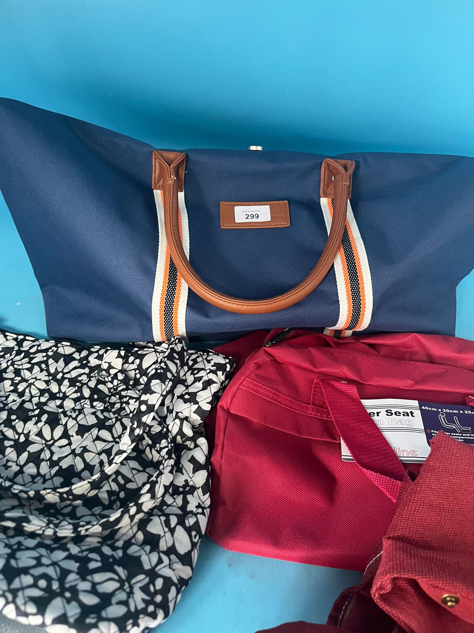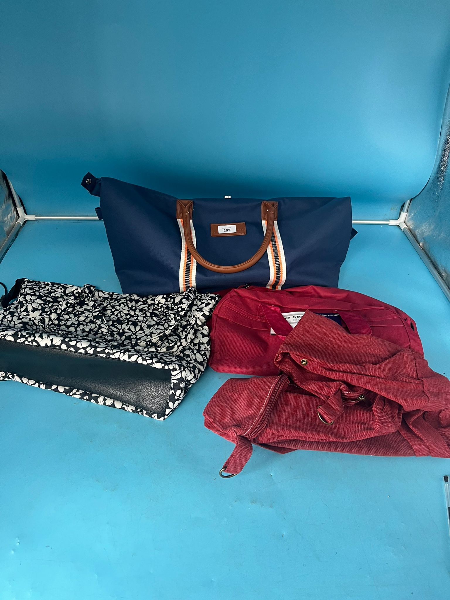 A navy blue duffel bag with striped detailing, a black and white floral tote bag, and a burgundy bag.