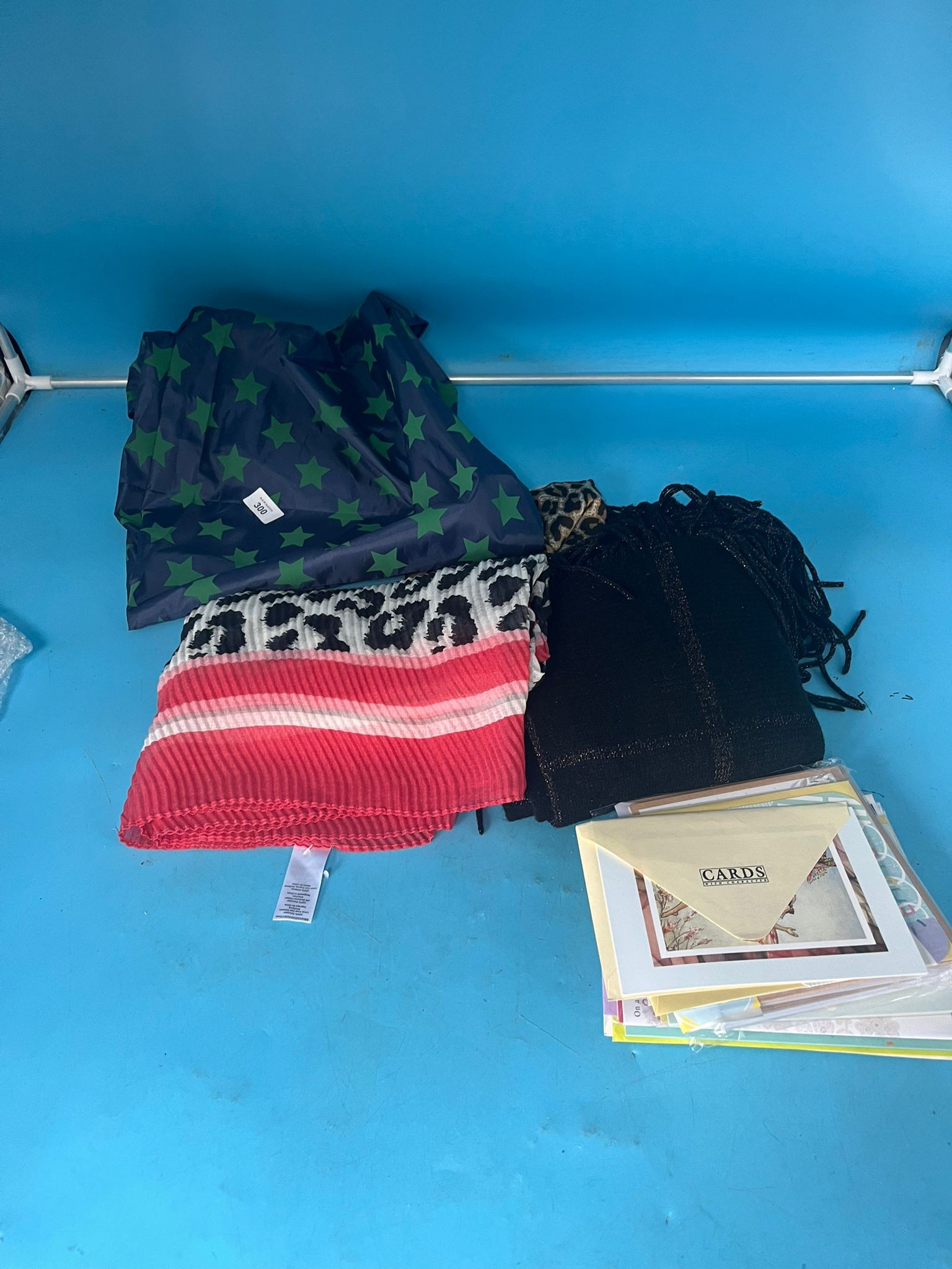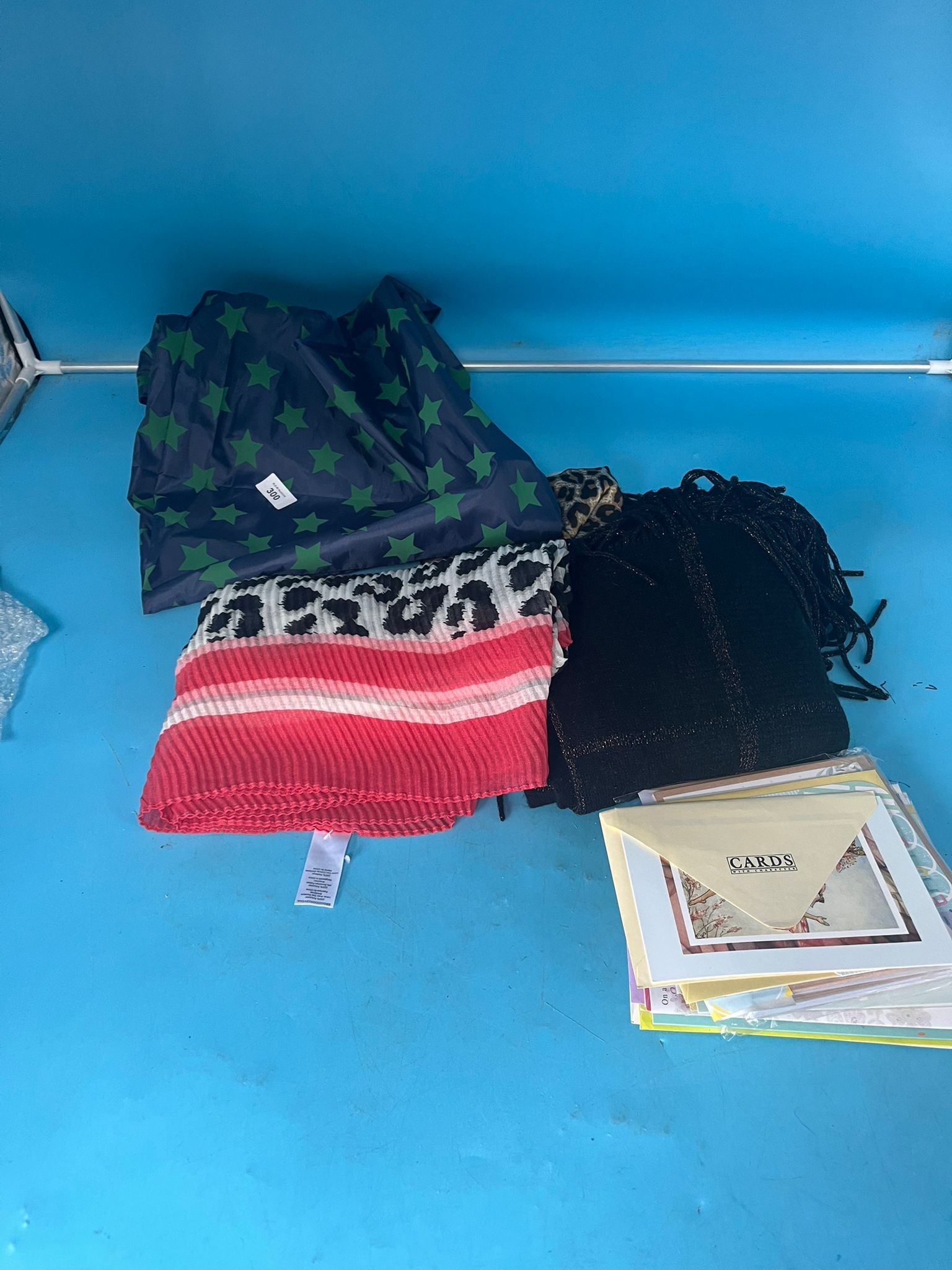 Lot includes a coral pink pleated scarf with leopard print, a black glitter scarf with fringe, a navy blue star scarf, and assorted greeting cards.