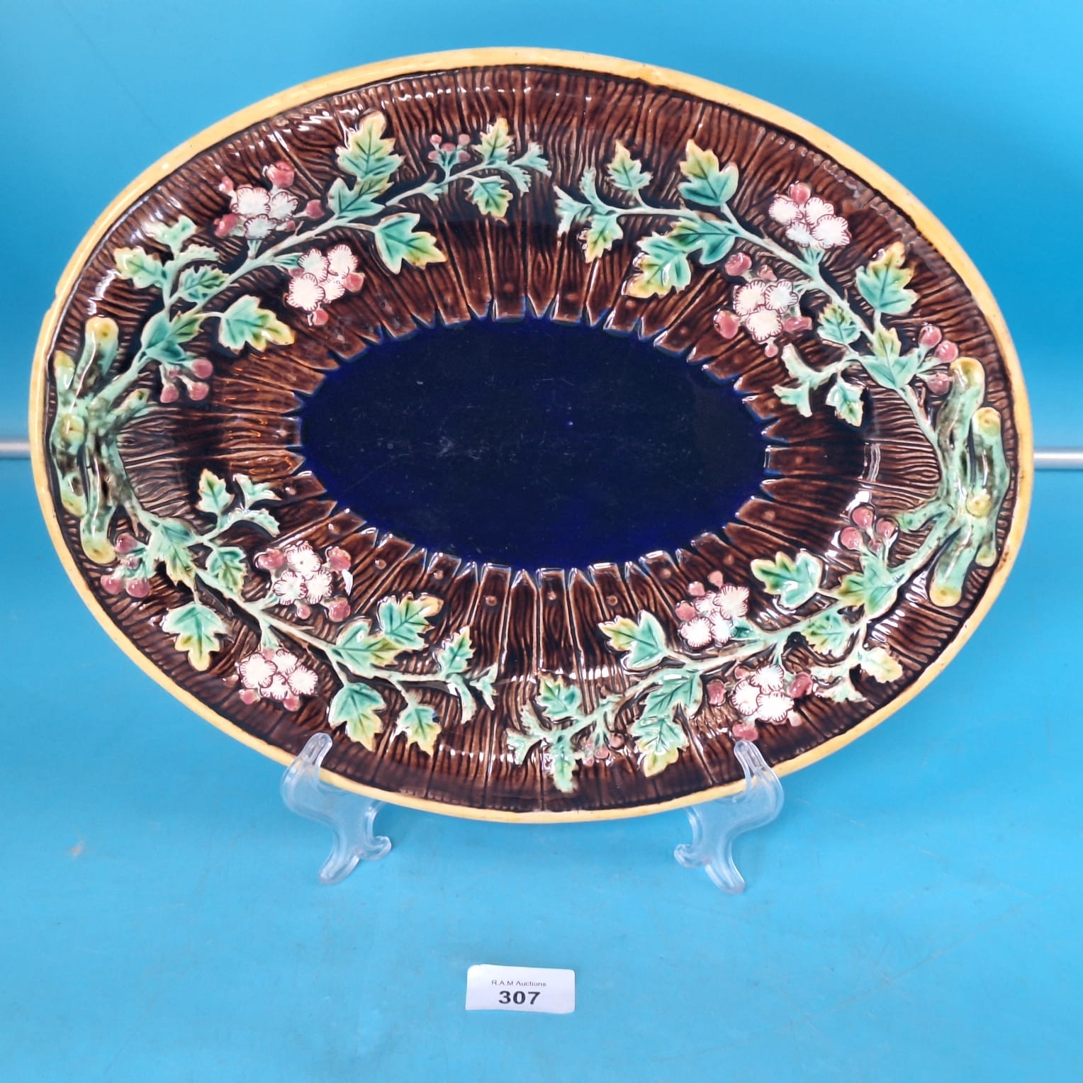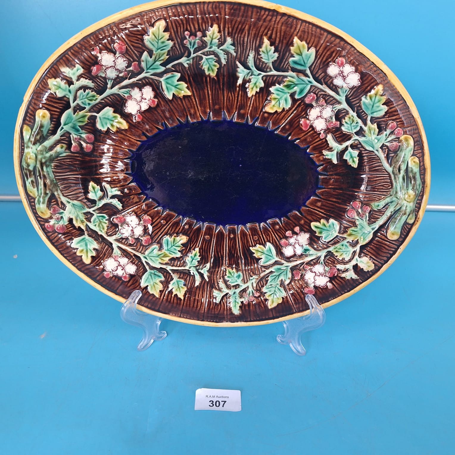 Oval ceramic dish featuring a textured brown border with a raised floral fence design, a deep blue center, and a pale yellow rim.